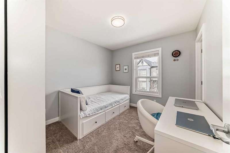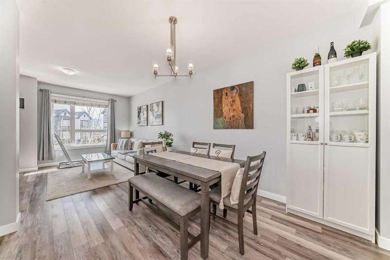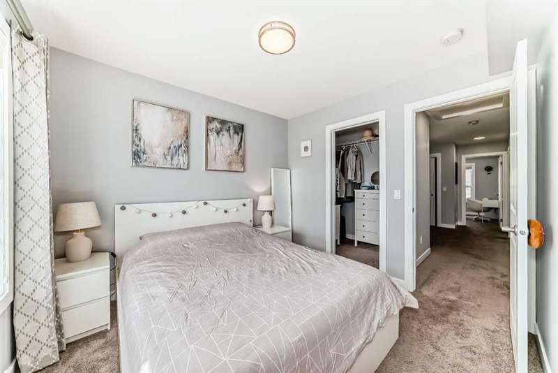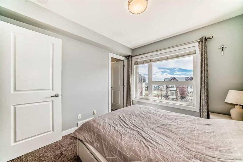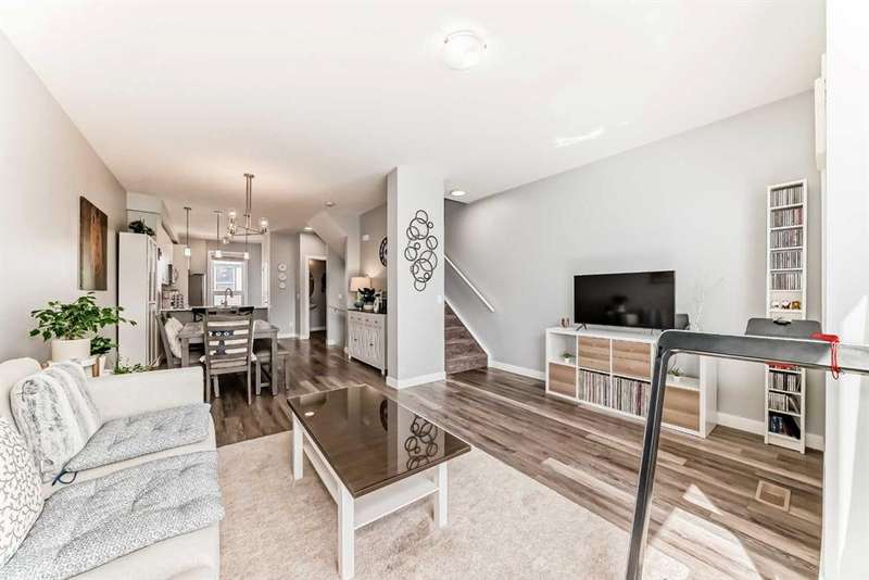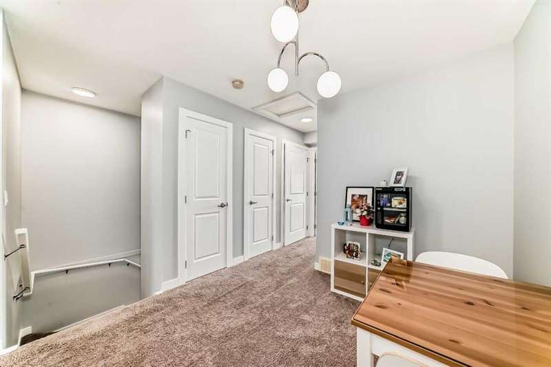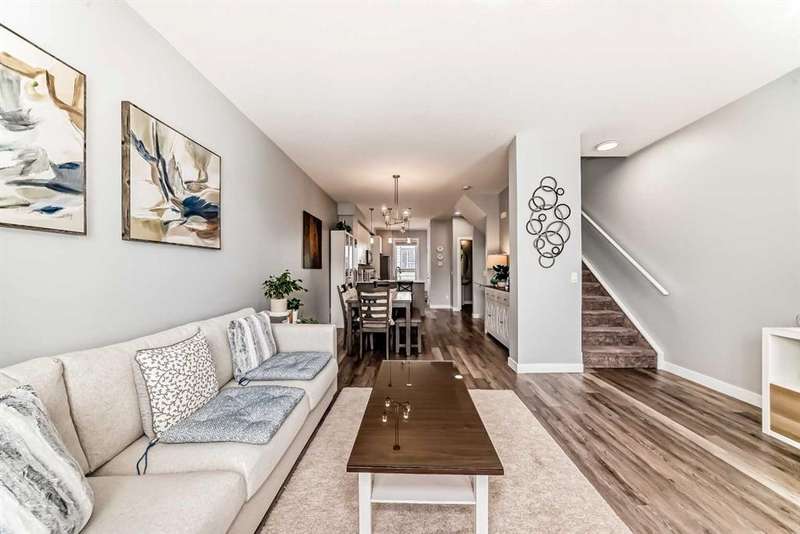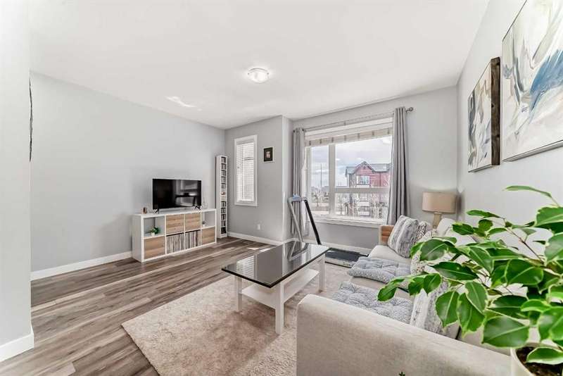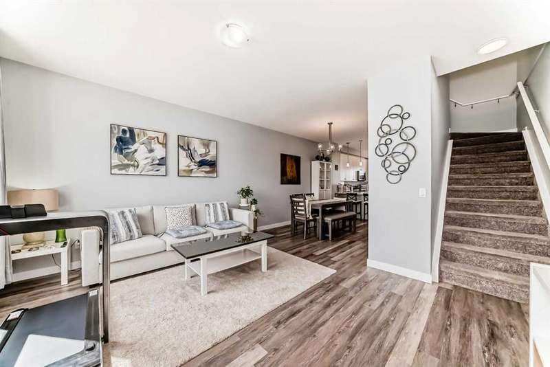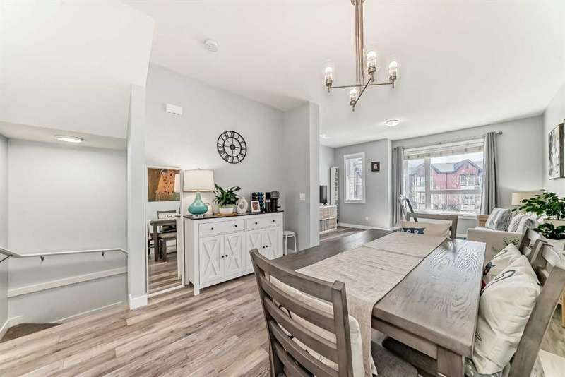 BEAUTIFULLY MAINTAINED Townhouse awaits in the sought-after Evanston neighborhood. This townhome features 2 BEDROOMS, 2.5 BATHS, the addition of a BONUS ROOM/OFFICE on the upper floor, 1,425 sq. ft. of living space. This home also includes the convenience of an oversized double attached garage (tandem parking) with a window. As you enter, you are introduced to a large foyer, utility room and garage all situated on the lower floor. As you walk up the stairs, you will be greeted by the bright and open concept designed for use with NEW PAINT & NEW LIGHTING FIXTURES throughout (Main & upper level), featuring 9 foot ceilings and beautiful vinyl plan floors. The spacious kitchen offers a raised breakfast bar, a closet pantry and stainless steel appliances (NEW DISHWASHER, ELECTRIC STOVE & REFRIGERATOR purchased in 2025). Also, a generously sized kitchen equipped with abundant cabinets and ample counter space. Additionally, there's a half bath, a sizable dining area and a spacious living room flooded with natural light from numerous windows. The balcony is accessed from the kitchen with a gas-line for BBQ completes this level. The upper level features a primary bedroom walk-in closet and 3-piece en-suite. As you follow the hallway, you will find another 4-piece bathroom, and another sizable bedroom with a walk-in closet. These two bedrooms allow a ton of natural light from the large windows, have an extensive amount of room and storage with the closets. A BONUS room which can be used as an office and convenient upper-level laundry complete this level. Excellent location!! Located in a family-friendly neighborhood, this townhouse is close to excellent schools, parks, shopping, and major roadways. It's just minutes from Costco, Wal-mart, T & T supermarket and easy access to the Stoney Trail offering the perfect balance of convenience and comfort. Don't miss the opportunity to make this townhouse your own!