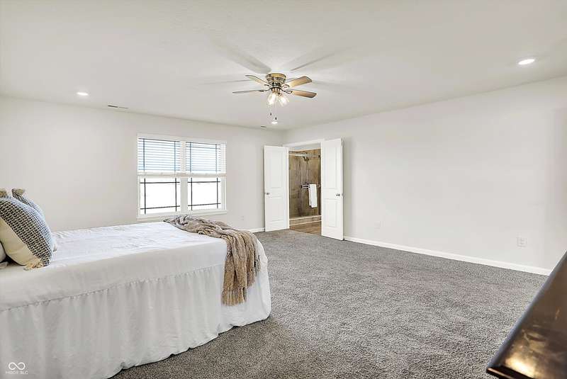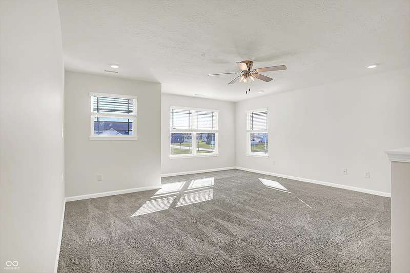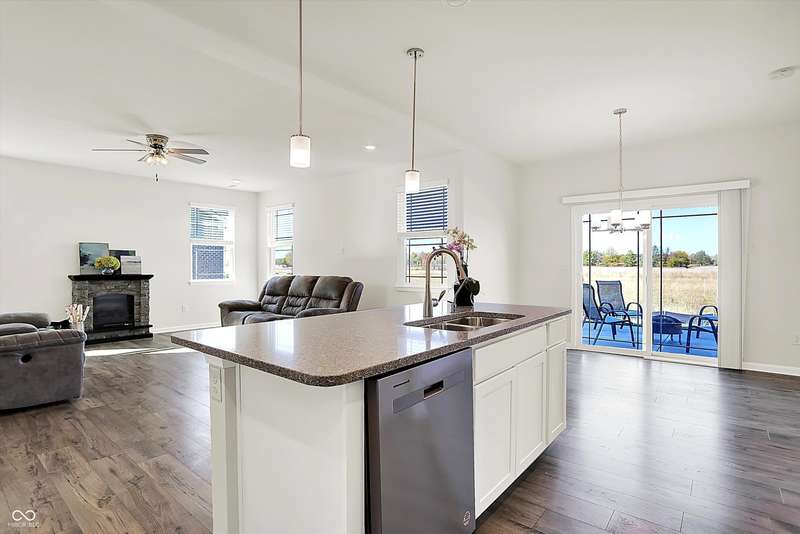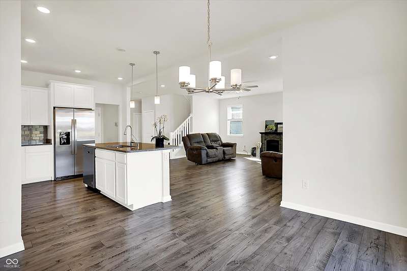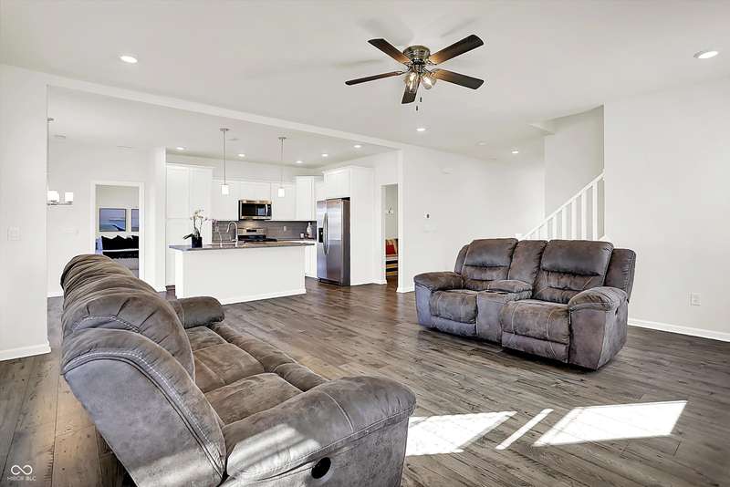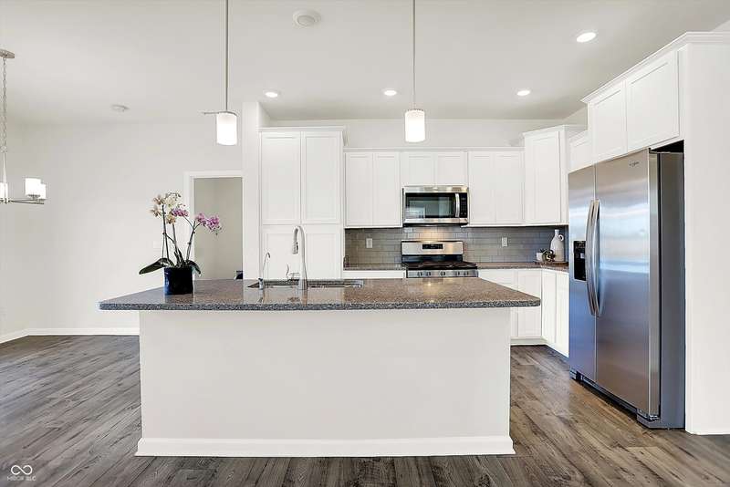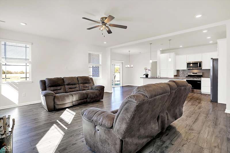 Built in 2022, this nearly new home already has the upgrades, details, finished-yard, window treatments, and fresh paint-so you can move right in. The floorplan offers flexibility with a main-floor bedroom featuring a private ensuite, plus a dedicated office with the upgraded French doors. Upgraded flooring throughout the main level. The open kitchen design boasts upgraded cabinets, stainless steel appliances (including a gas stove), a large island, and plenty of space to gather. The 3-car garage includes a workshop with built-ins that stay. Extras like a water softener, reverse osmosis system, a drop zone off the garage for shoe & clutter collection, and ceiling fans in each bedroom add everyday comfort. There is a second level loft for work or play. This fun neighborhood offers incredible amenities-pool, fitness center, bocce ball, pickleball-and direct access to the Big 4 Rail Trail.