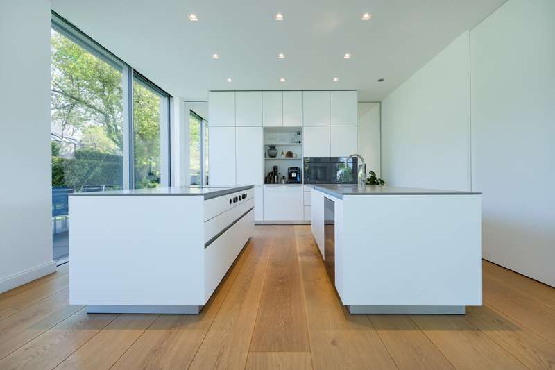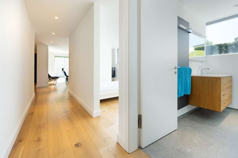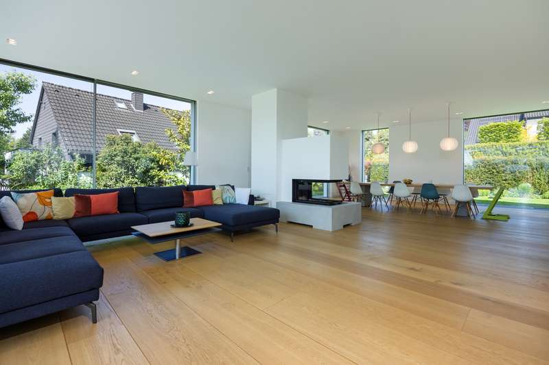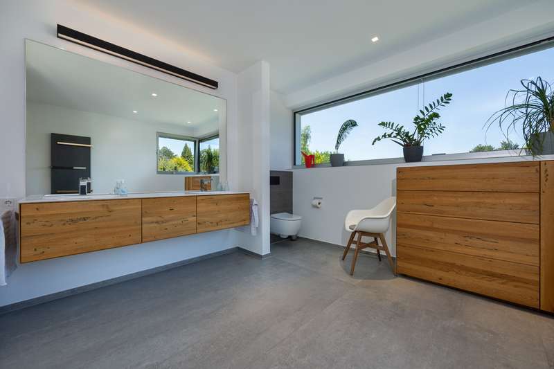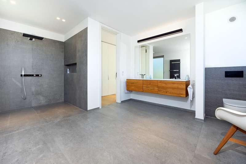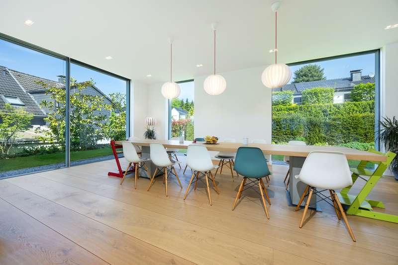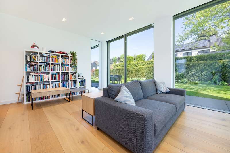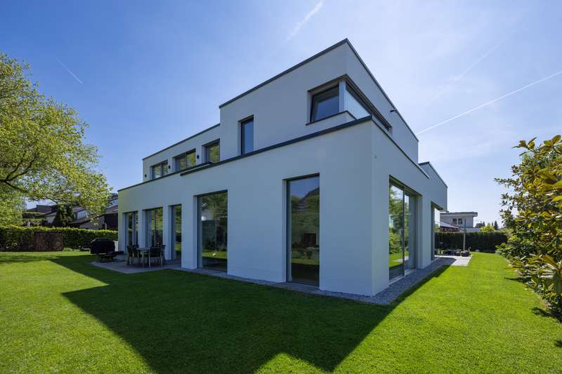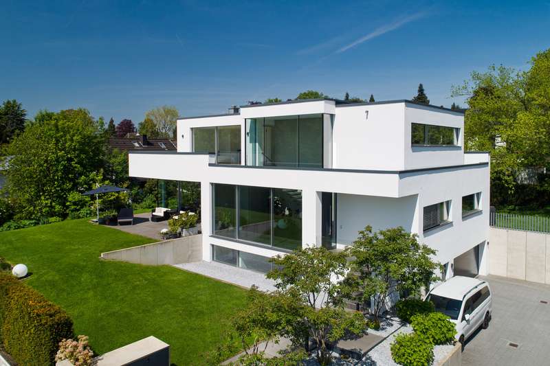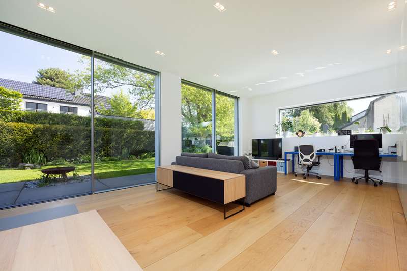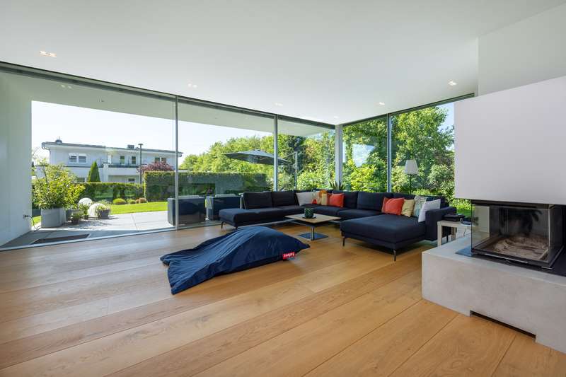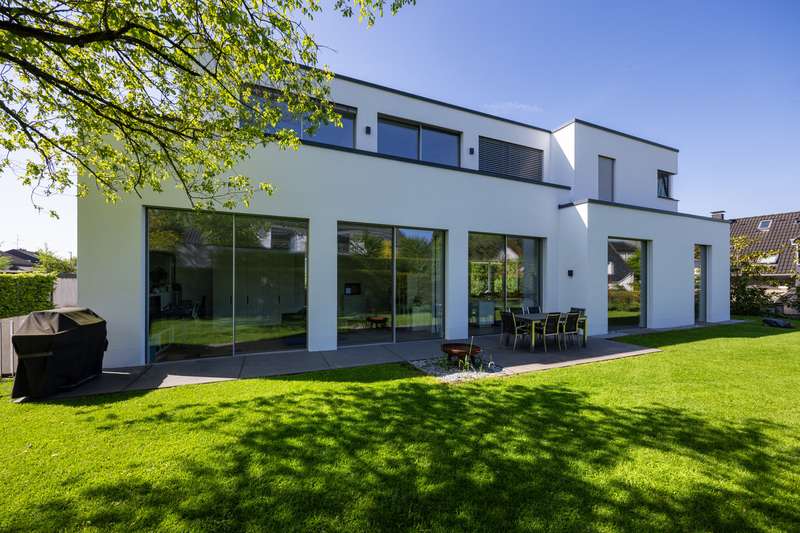 This modern villa, including a large granny apartment, completed in 2019, is situated on a plot of approx. 1,088 m² and offers a living space of around 380 m². This as-new property with its exceptional design and high-quality fixtures and fittings impresses with its generous room layout and technical refinements. The light-flooded first floor with a room height of 3.00 meters impresses with floor-to-ceiling Sky Frame windows, some equipped with electric drives and complemented by electric blinds in a Venetian blind design. Floor-to-ceiling sliding doors on the first floor and floor-to-ceiling doors on the upper floor ensure an extraordinary sense of space as well as perfect lines of sight and light. There are eight spacious rooms in the villa, including five bedrooms. The three stylishly furnished bathrooms offer maximum comfort and have been designed with extra-long and wide tiles. The living/dining area is divided by an elegant fireplace, which can be seen from three sides through glass surfaces, creating a pleasant atmosphere. High-quality oak floorboards, five meters long and extra wide, underline the elegant ambience of the house. The modern Bulthaup kitchen is equipped with high-quality appliances and offers plenty of space for culinary development. Another gastronomic highlight is the in-house wine cellar. The villa's climate-friendly energy concept is supported by a geothermal heat pump, a photovoltaic system and underfloor heating. A central ventilation system ensures a pleasant indoor climate. The property also has a smart KNX bus system for convenient control of the building services. An outstanding feature of this villa is the heated underground garage with six parking spaces and three additional outdoor parking spaces. A separate apartment with two rooms, fitted kitchen and bathroom is available for guests or staff and can be accessed via a separate entrance. The property meets the highest standards of living quality and energy efficiency and is ideal for families or discerning individualists who value exclusive living. The residential location offers good connections and a quiet but central residential area. Please contact us for further information or to arrange a viewing appointment to see this unique residential offer for yourself.