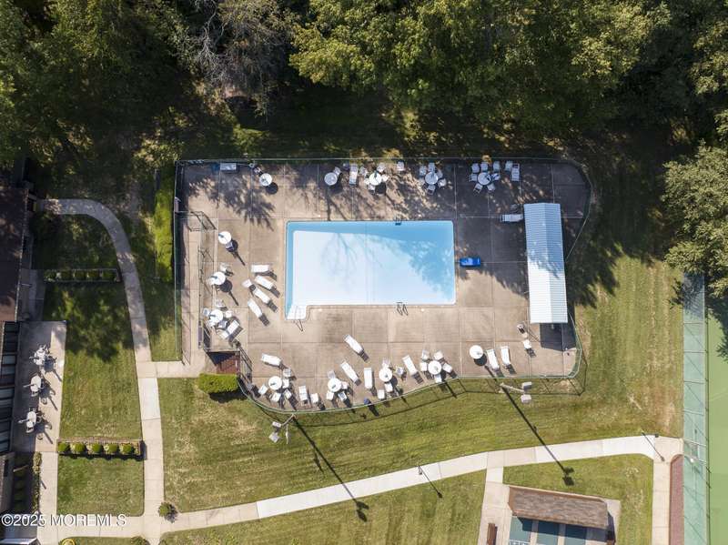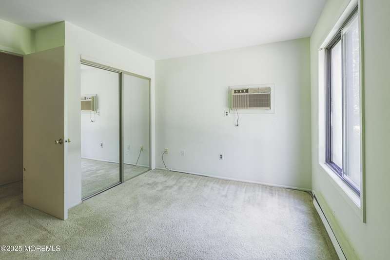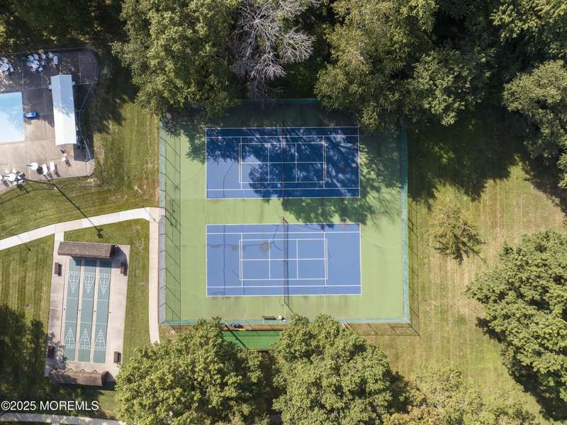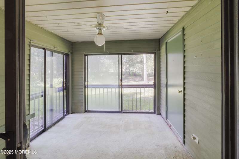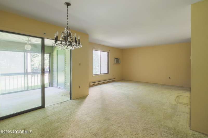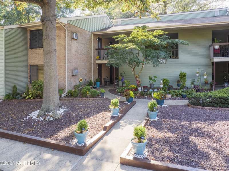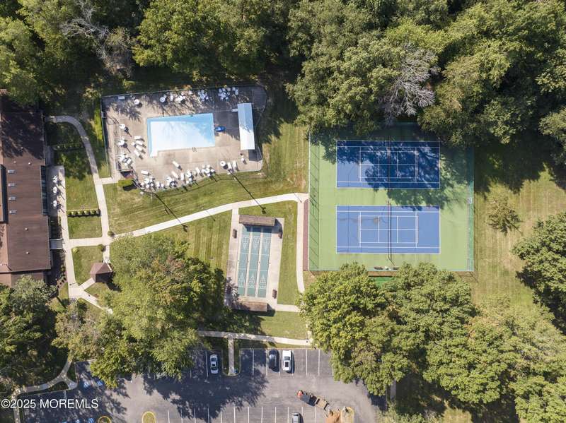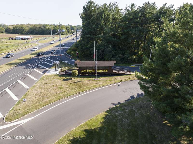 Ground level living in 55+ Covered Bridge II with two bedrooms and two full baths. No stairs. The sunroom looks out to a quiet wooded backdrop for slow mornings and easy evenings. In-unit laundry adds everyday ease, there is one assigned parking space, and low HOA fees. Interiors are ready for your updates. Life here comes with a long list of amenities. Two clubhouses, outdoor pools, fitness rooms, tennis and bocce, shuffleboard, billiards, arts and crafts, a woodworking shop, library, gardening plots, and walking paths, plus a full calendar of clubs and activities. Everyday shopping and dining along Route 9 are minutes away.