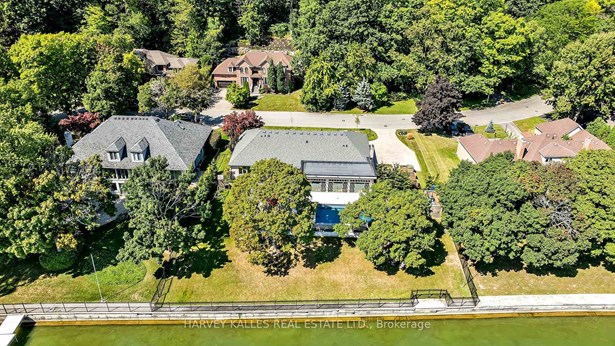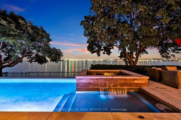 Exclusive ultra-private, this street is home to many of Canada's most prominent families. Located on the shores of Lake ON it has almost an acre, with Burlington and Oakville mins away. The multi-million reno on this bungalow has transformed it into open concept west coast modern aesthetic using natural materials of wood, marble, stone and granite. The architecture embraces the natural setting offering multiple glass walk-outs to the water and views from all the principal rooms. The hot tub, pool with infinity edge overlooking the Bay is irresistible! One a few properties that are allows for a dock. Imagine, after work, you pop into your boat or kayak for a quick work out before slipping into the hot tub. The Great Room has a book matched marble floor to ceiling marble fireplace that is calling for a roaring fire on a winters night. The Observatory Room is special place, whether it is evening drinks or morning cappuccino you will find yourself drawn to sit and watch the lake. **EXTRAS** Air exchanger, Alarm system. Separate heating controls, hot water tank & Irrigation system.