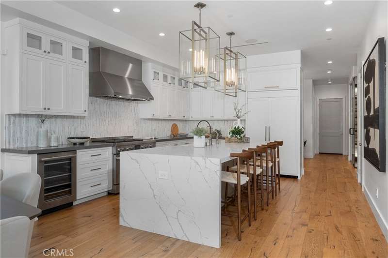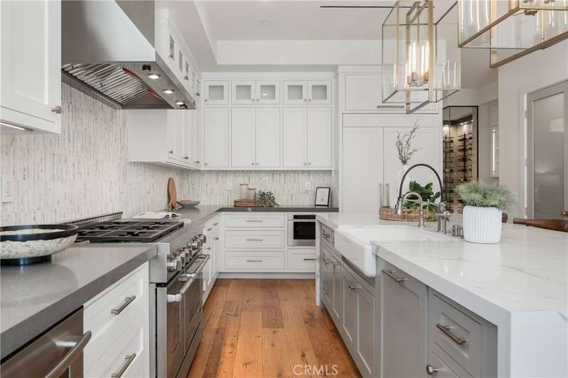 At the heart of the home, the chef's kitchen features stunning white quartz countertops, a marble backsplash, a walk-in pantry, and a grand center island. Professional-grade appliances include a six-burner double oven range, complemented by Restoration Hardware lighting and custom cabinetry that exude luxury and functionality.