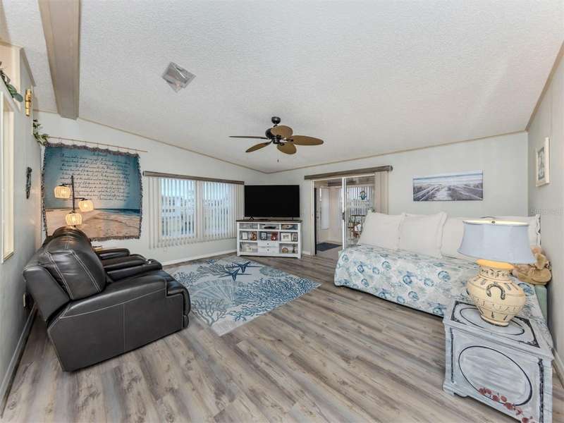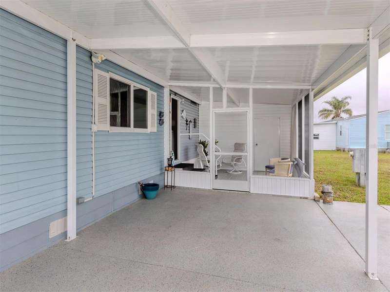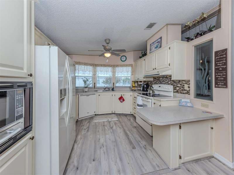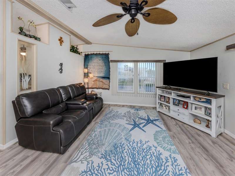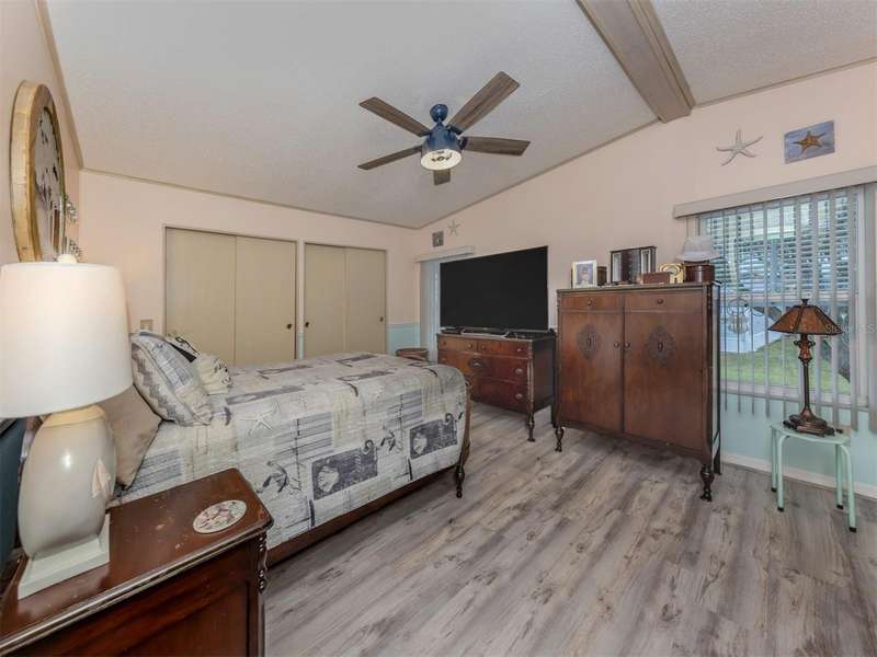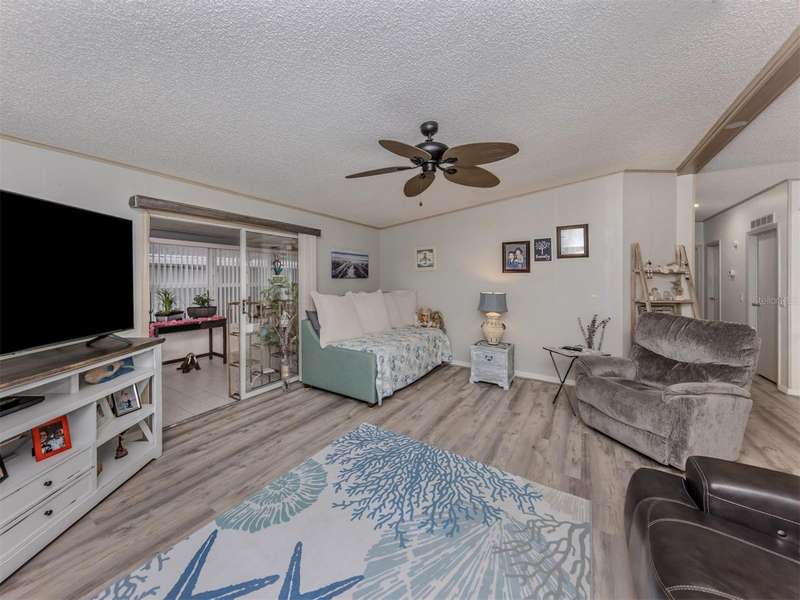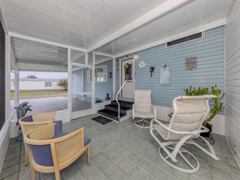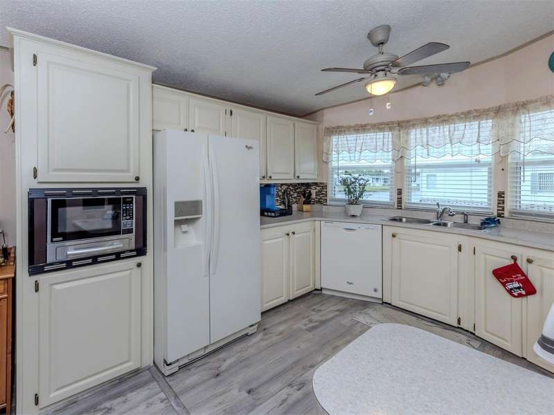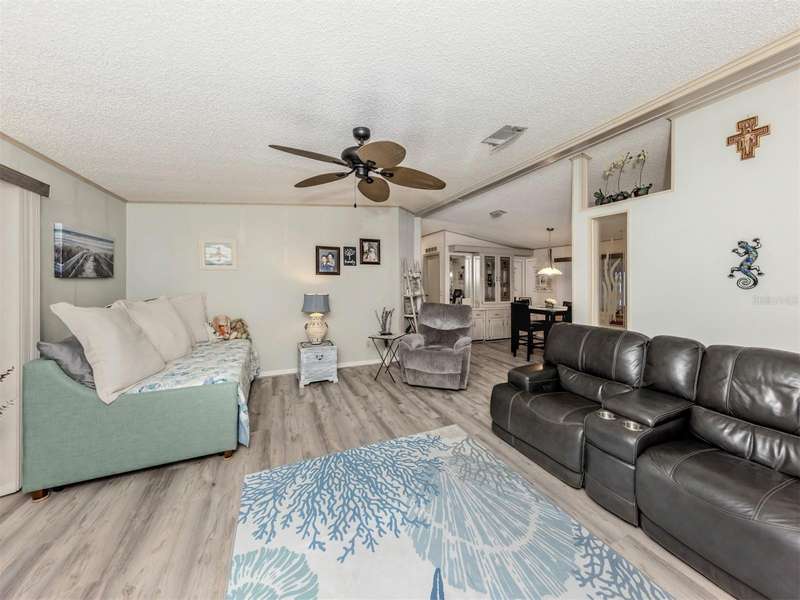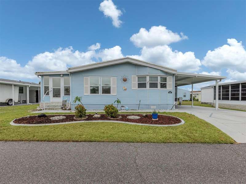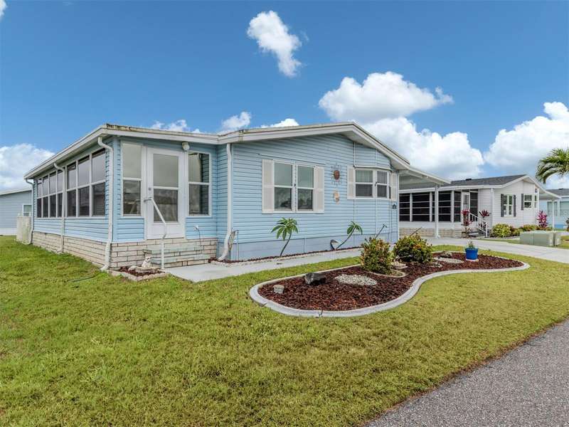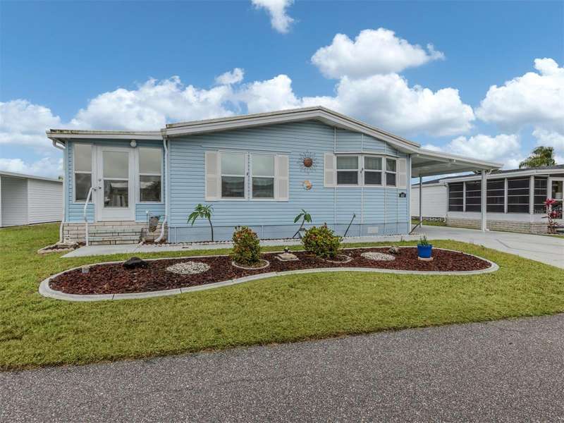 Welcome to this lovely and impeccably maintained 2 bedroom, 2 bath manufactured home located in the highly desirable, land-owned and pet-friendly community of Harbor Isles. Situated just across from the lake, this charming residence offers a light and bright interior with vaulted ceilings and new luxury vinyl flooring throughout. The cheerful kitchen features cream-colored cabinetry, a tile backsplash, and windows with lake views, creating a warm and inviting space for everyday living. An expansive Florida Room with glass windows and a dedicated window AC unit runs the full length of the home, providing the perfect spot to relax, entertain, or enjoy the serene surroundings. The updated windows (2013) throughout the home allow for plenty of natural light, while built-ins add convenient extra storage. The inside laundry room is another practical bonus. The spacious master suite includes an ensuite bath with a walk-in Jacuzzi tub, perfect for relaxing at the end of the day. The guest bedroom also features built-ins and sliding doors that open to the Florida Room, giving guests their own private retreat. Recent updates include a new roof (2023), AC (2017), new carport, shed, and a screened lanai—all oriented to enjoy the peaceful lake views just across the street. This home truly has it all and is move-in ready for full-time or seasonal living. Harbor Isles is a premier 55+ community nestled along the shores of the Myakka River. Residents enjoy a wide array of resort-style amenities, including a heated pool and spa, clubhouse with fitness center, tennis and pickleball courts, bocce ball, shuffleboard, and a marina with boat slips and a kayak launch. Social activities and clubs make it easy to connect with neighbors and enjoy the Florida lifestyle. Best of all, you own your land, and the low HOA fees make Harbor Isles an incredible value. Don't miss your chance to live in this vibrant, waterfront community—schedule your private showing today!