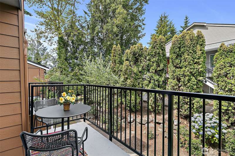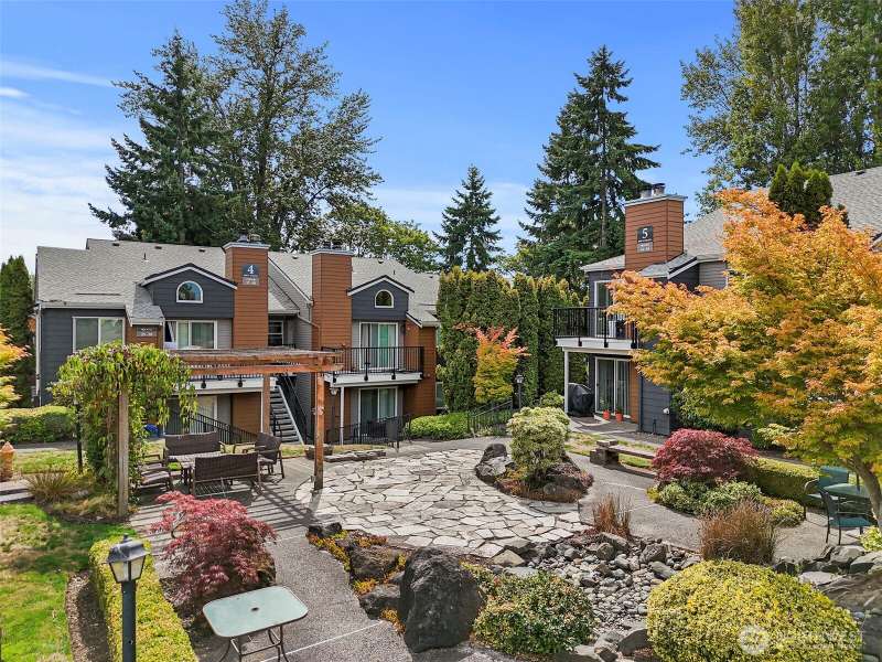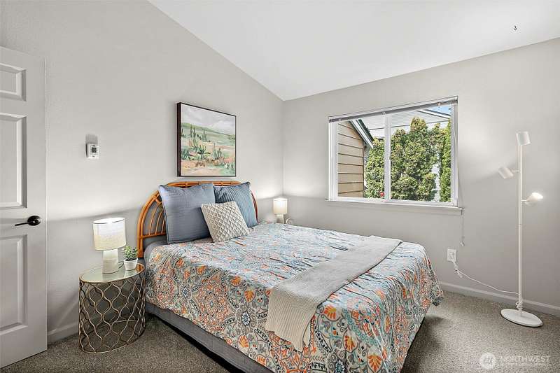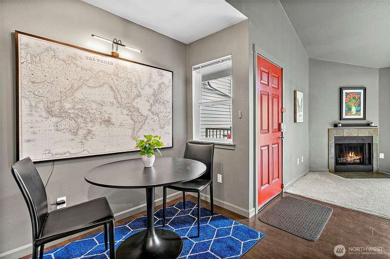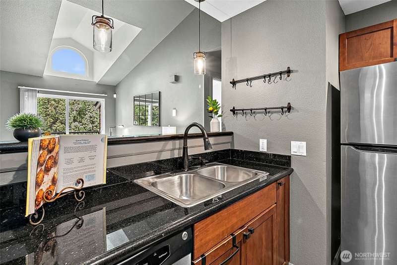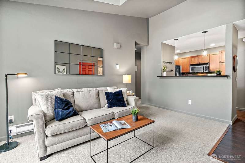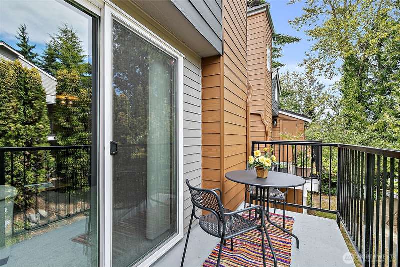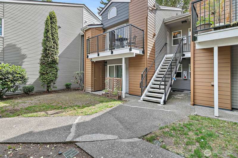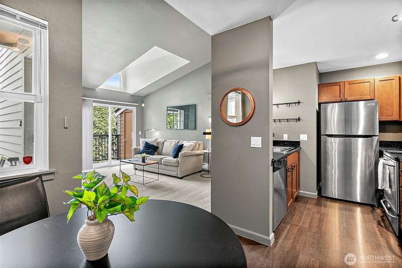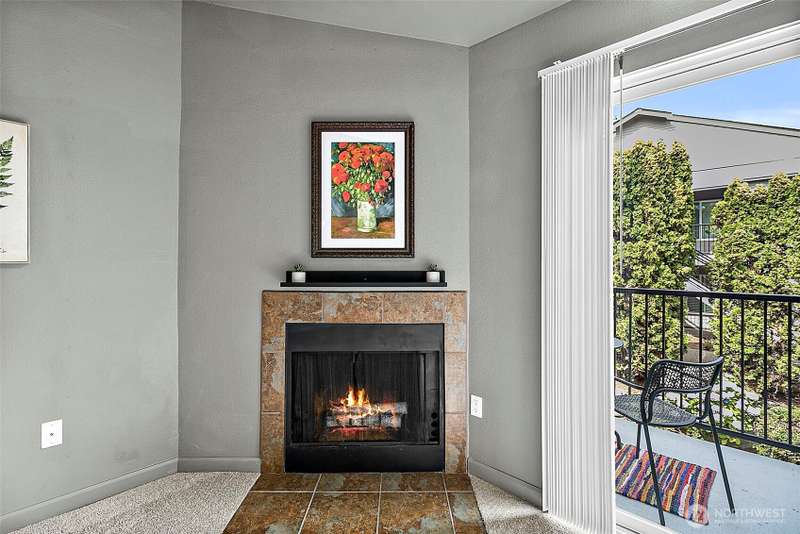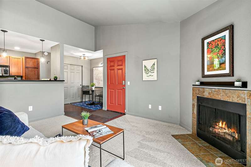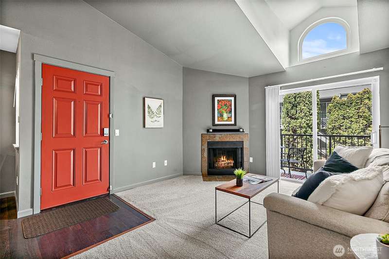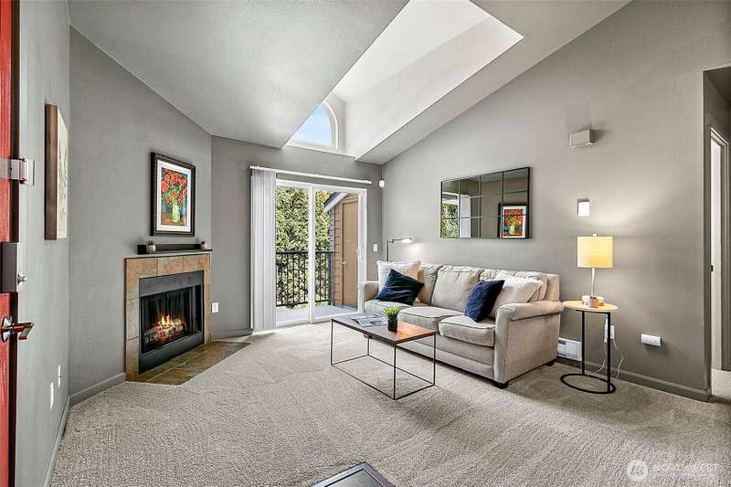 Perfect for first time buyers! This charming top floor 1BD - 1BTH condo in Saybrook feels like home with vaulted ceilings, a cozy wood burning fireplace, & a private balcony for relaxing. Kitchen has stainless appliances & a small pantry, plus a full sized washer & dryer that stay! Quiet & tucked away from the parking lot with a reserved parking spot. BBQ area on site. Major upgrades just done --new roof, windows, siding, new carpet, attic insulation, decks & stairs. HOA Dues cover water, sewer & garbage. Great location near I-5, Hwy 99, Park & Ride & NEW light rail station coming in 2026 across the street! Just use the crosswalk and ride the light rail to work once it opens next year. Seller to pay off the condo assessment at closing.