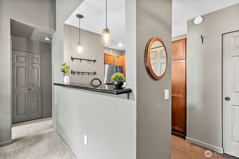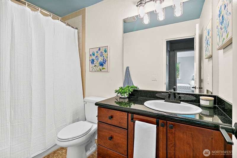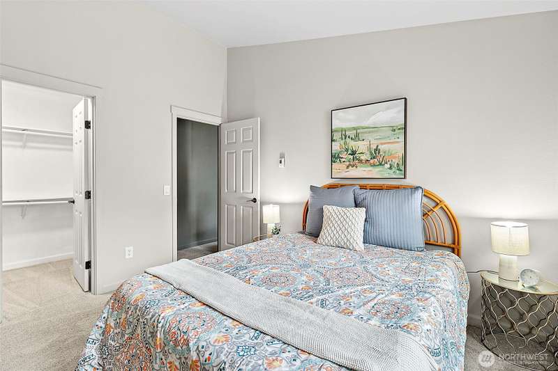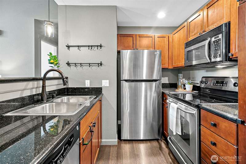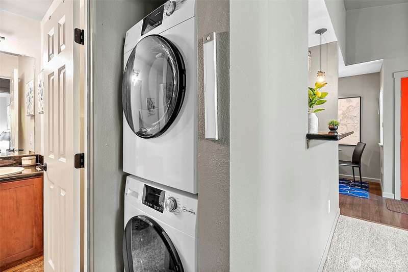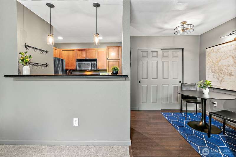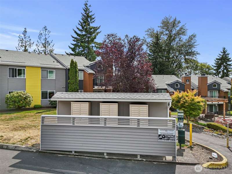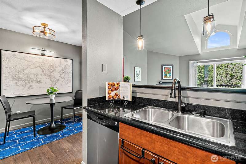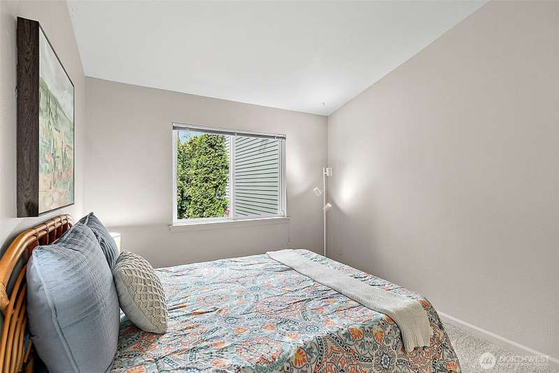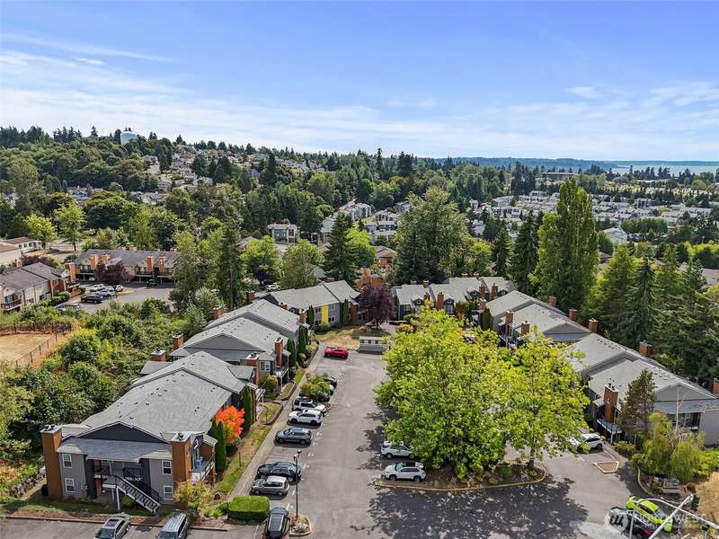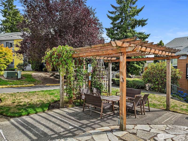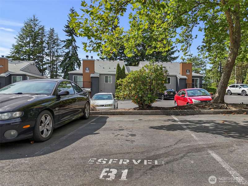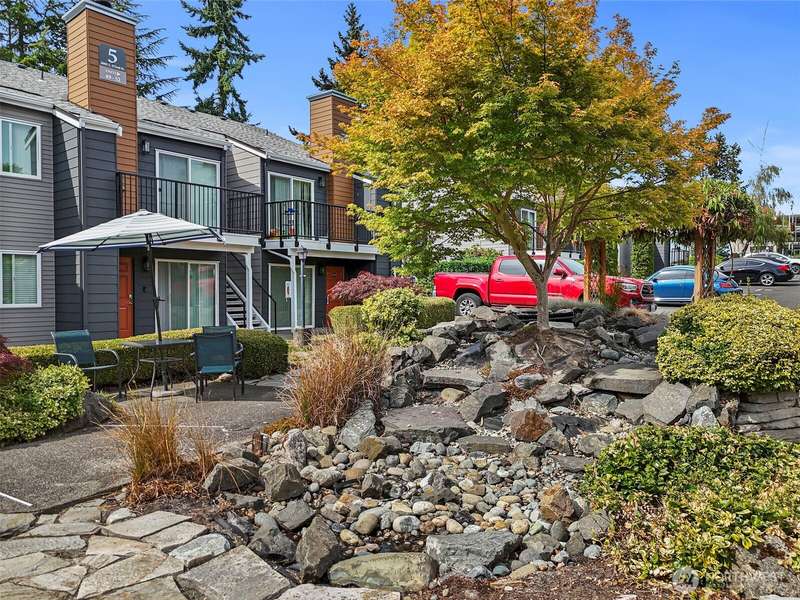 Perfect for first time buyers! This charming top floor 1BD - 1BTH condo in Saybrook feels like home with vaulted ceilings, a cozy wood burning fireplace, & a private balcony for relaxing. Kitchen has stainless appliances & a small pantry, plus a full sized washer & dryer that stay! Quiet & tucked away from the parking lot with a reserved parking spot. BBQ area on site. Major upgrades just done --new roof, windows, siding, new carpet, attic insulation, decks & stairs. HOA Dues cover water, sewer & garbage. Great location near I-5, Hwy 99, Park & Ride & NEW light rail station coming in 2026 across the street! Just use the crosswalk and ride the light rail to work once it opens next year. Seller to pay off the condo assessment at closing.