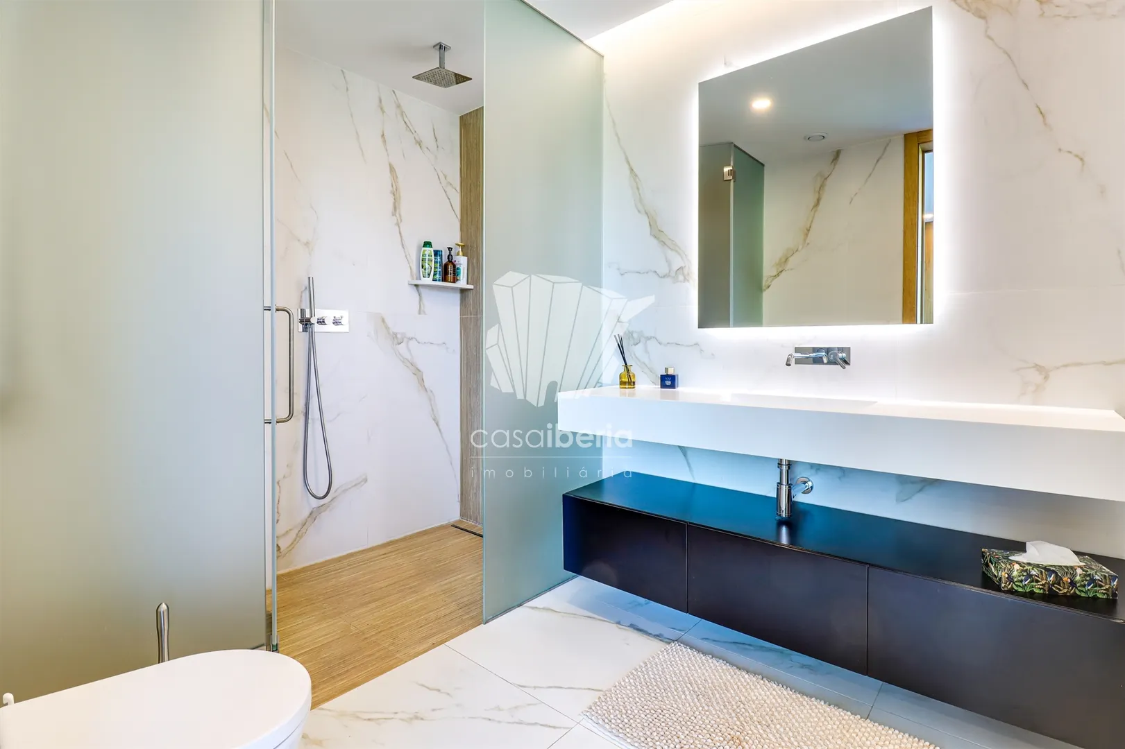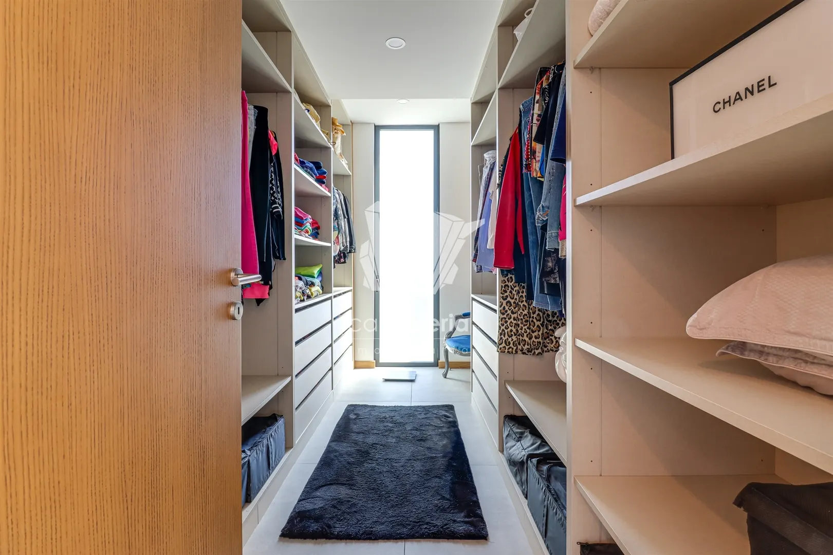 On the ground floor, the elegant entrance hall leads to a spacious living and dining area with direct access to the outdoor terrace, the heated pool, and a modern kitchen equipped with Bosch appliances and a pantry, with access to the BBQ area and garden. This floor also includes a guest bathroom, a large en-suite bedroom, and a storage area.
