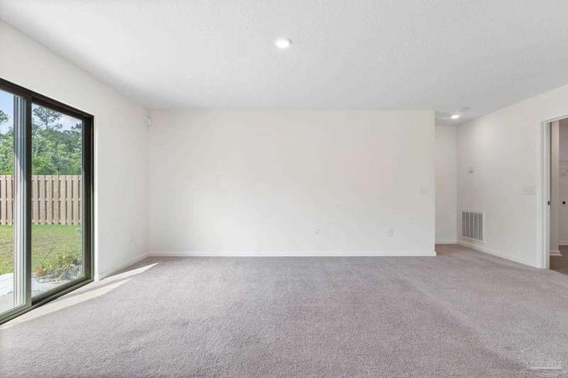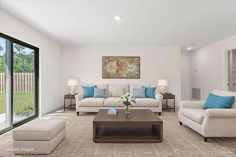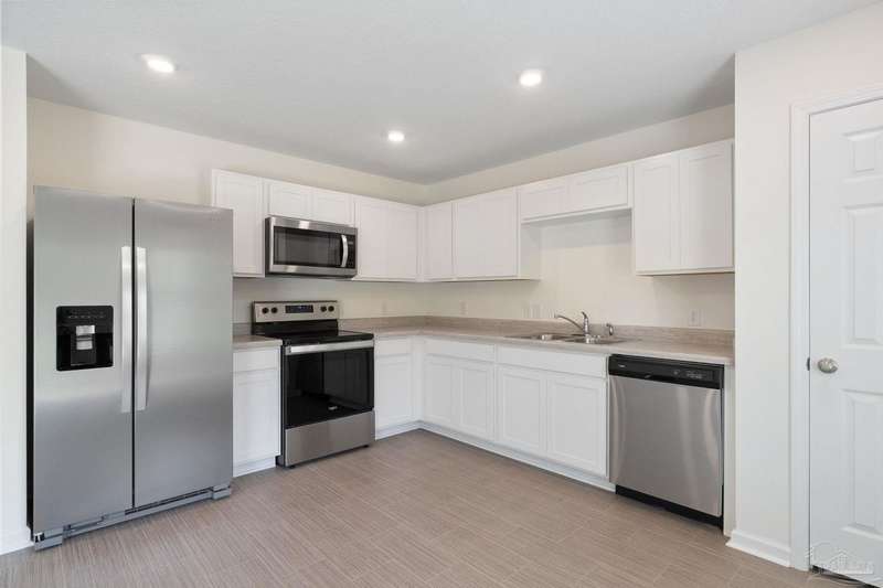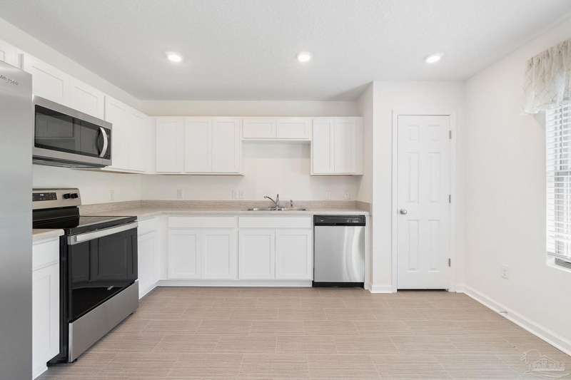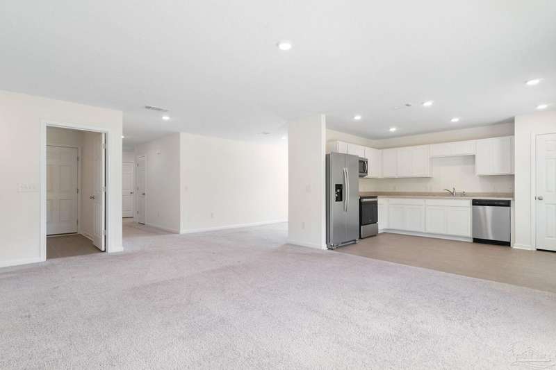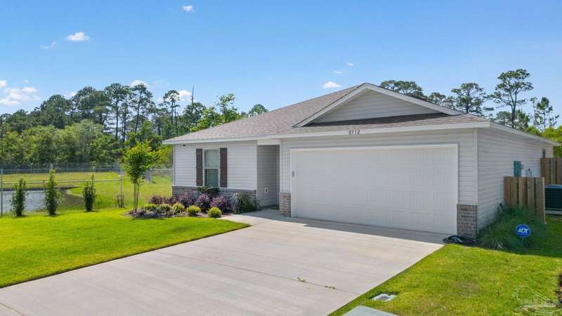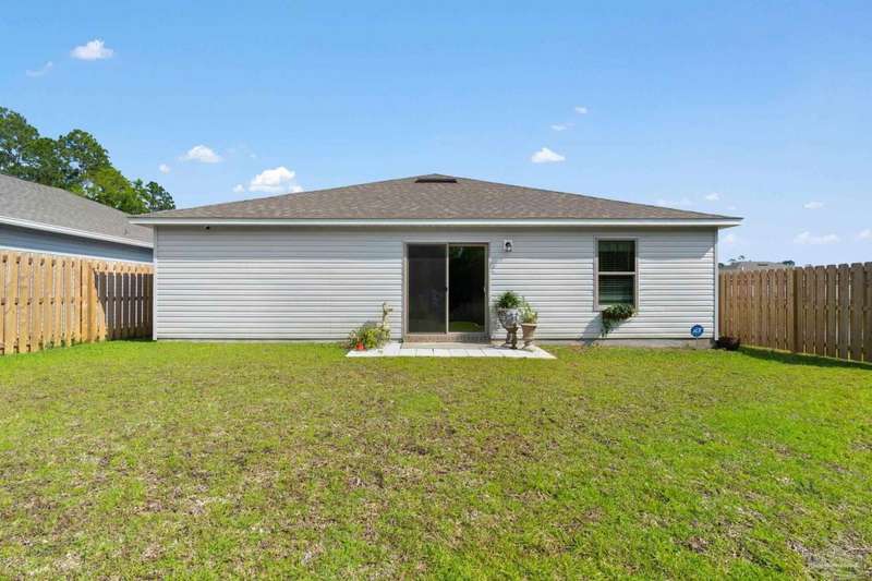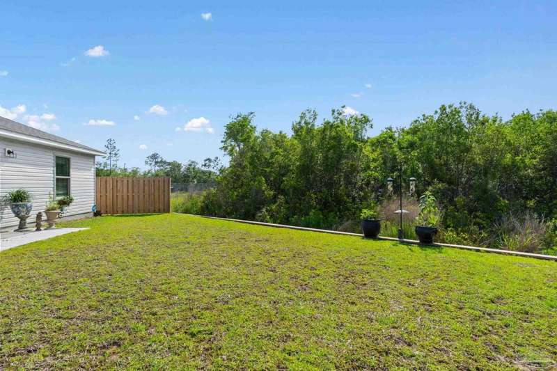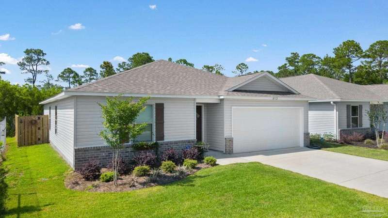 Located in the desirable Schooner Landing subdivision, this 2022-built home offers convenience to NAS Pensacola, Corry Station, Naval Hospital Pensacola, and the beautiful white sand beaches of Perdido and Pensacola Beach. Inside, you'll find an open-concept living and dining area-ideal for hosting friends and family or simply relaxing at home. The kitchen is well-proportioned and functional, featuring stainless steel electric appliances and ample counter space. Step outside to enjoy summer evenings in the private backyard, where you can unwind while watching local wildlife and birds. The spacious primary suite is just off the living area and includes an en suite bath and a generous walk-in closet. Two additional bedrooms share a full bathroom with neutral finishes, offering a clean canvas for your personal style. An indoor laundry room provides added convenience and leads to a roomy two-car garage. Whether you're looking for a full-time residence or a smart investment opportunity, this well-maintained home is ideal.