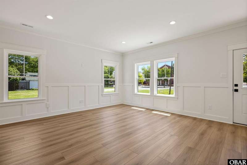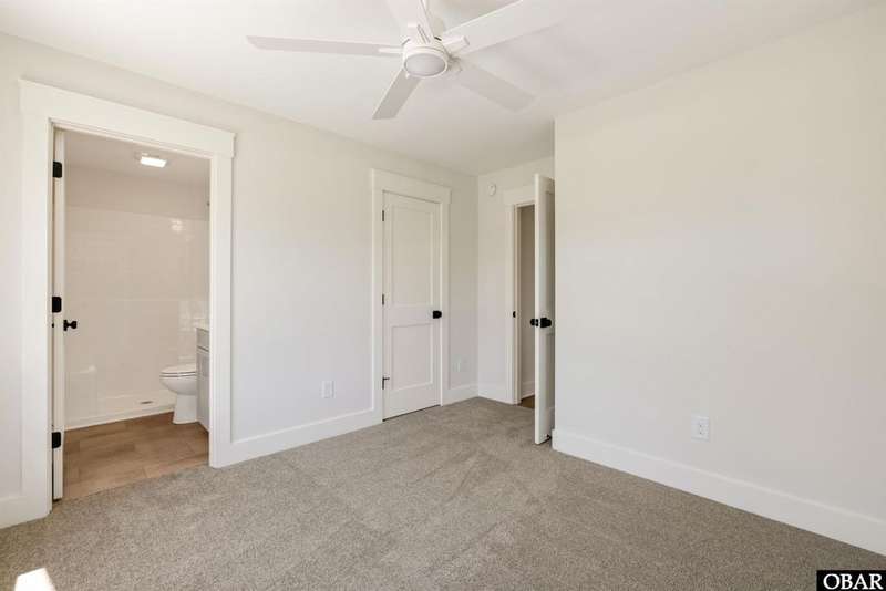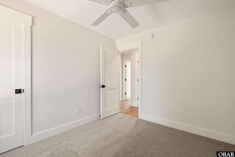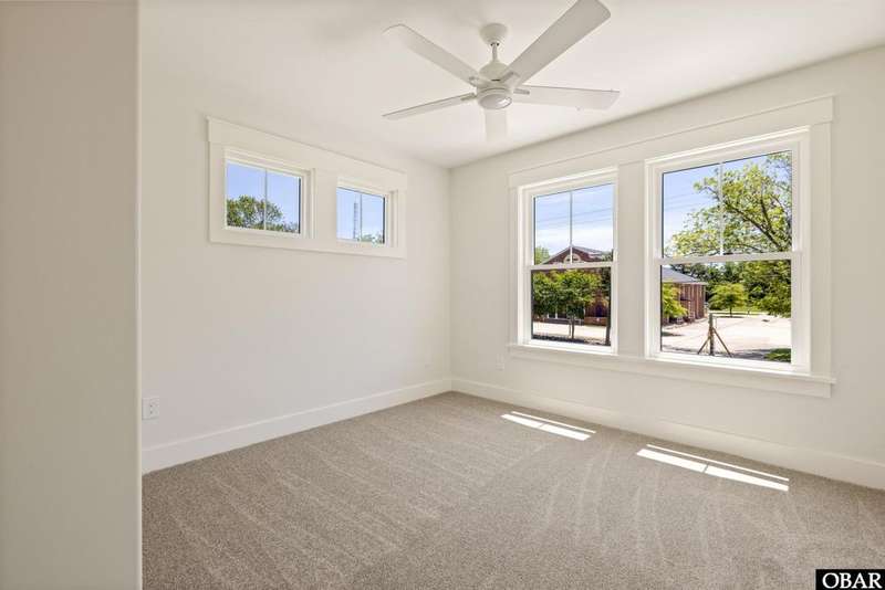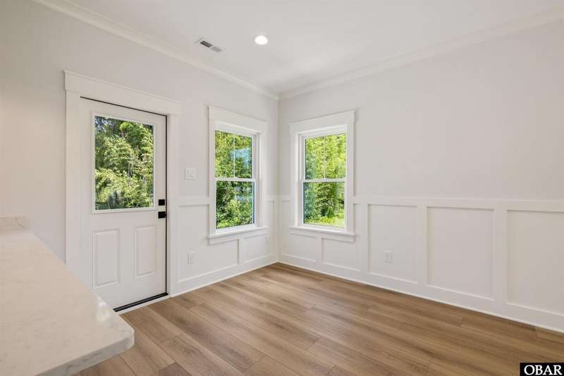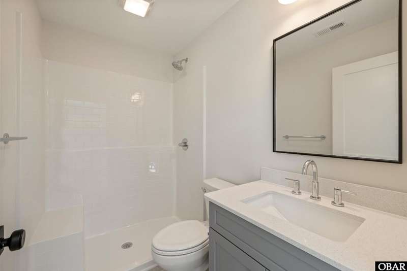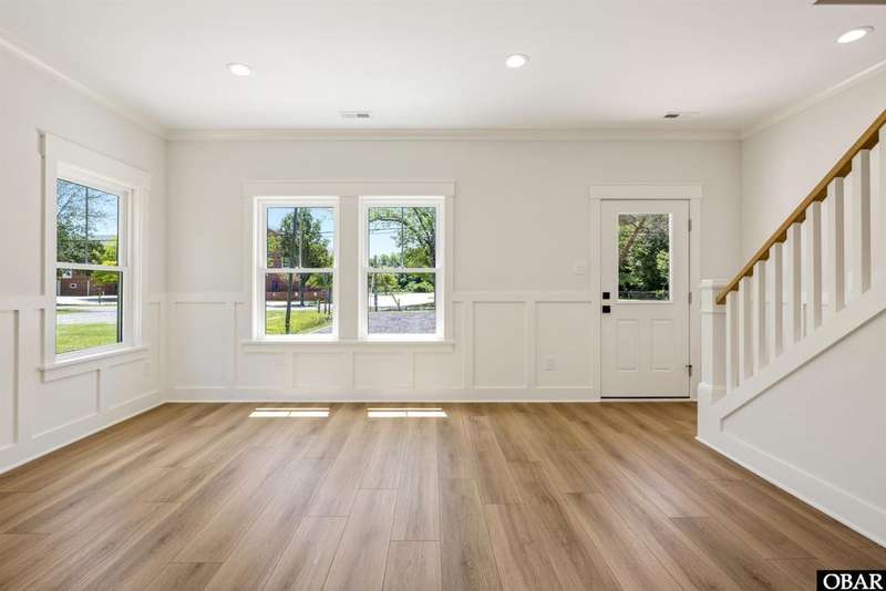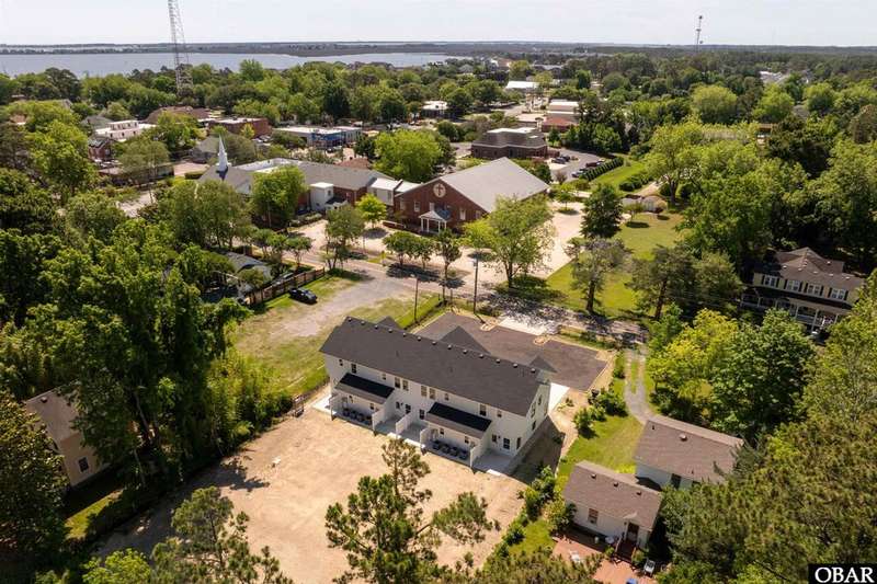 A Barker & Barker Custom Homes new build in a historic island community?this town home affords the best of both worlds to a homeowner looking for a low maintenance lifestyle in Manteo. This end unit boasts three bedrooms and two and a half baths, plus a private back patio space. You'll be welcomed into a spacious living room with stylish LVP flooring and board and batten style wainscoting. A powder room tucked away discreetly is perfect when entertaining guests on the home's main level. An open floor plan leads from the living into the dining room space, adjacent to an upscale kitchen with stainless GE appliances and sparkling quartz countertops. You'll find added character in the kitchen with details like shiplap, pendant lighting, and an elongated subway tile backsplash. There is plenty of storage with ample cabinet space and a double-door pantry. Just off the kitchen, a laundry room with washer, dryer, and a window for natural lighting provides a convenient yet out of sight area for your washing.On the upper level you'll find three serene bedrooms finished in a contemporary, coastal pallet of soft cool greys and whites. The primary bedroom welcomes in beautiful natural lighting and has a large closet and an en suite bathroom with tub and shower. The other two bedrooms share a spacious hall bath with a double vanity sink and a linen closet. Overhead attic space provides for additional storage needs. HOA includes landscaping, water, exterior maintenance, as well as all common area and septic maintenance. This gem is well appointed for a relaxing lifestyle on beautiful Roanoke Island. Just a fifteen minute drive from the pristine beaches, yet tucked away in quiet, charming Manteo. The town is rich with historic landmarks and attractions, and its downtown waterfront with shops, restaurants, green spaces, and a marina is something out of a storybook.