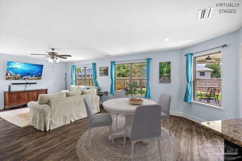 SELLER ASSISTED CLOSING COSTS | LOW RATE VA ASSUMABLE LOAN AVAILABLE FOR QUALIFIED BUYERS | PAID-OFF SOLAR PANELS!!! Welcome to your ideal coastal retreat! This beautifully maintained 3-bedroom, 2.5-bath home offers over 1,730 sq ft of thoughtfully designed living space, combining modern comfort with energy efficiency. Inside, you'll find a bright, open floor plan enhanced by luxury vinyl plank flooring, granite countertops, and stainless steel appliances-perfect for both everyday living and entertaining. The spacious main living area flows effortlessly, while the low-e vinyl windows with fabric storm shields provide peace of mind and lower energy costs. Step outside to a generously sized backyard featuring a patio and deck, ideal for BBQs, relaxing evenings, or morning coffee. Energy savings abound with a fully paid-off solar panel system (installed in 2019)-keeping average electric bills under $30/month. Major systems have also been updated with a new HVAC condenser and new water heater, offering years of low-maintenance living. Located in a quiet, established neighborhood, this home offers easy access to Perdido Key Beach, Johnson Beach, the Intracoastal Waterway, parks, boat launches, and NAS Pensacola-making it a perfect fit for military families or anyone seeking a relaxed coastal lifestyle close to everyday conveniences.