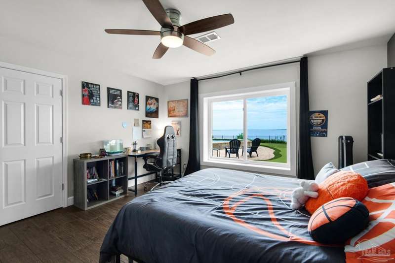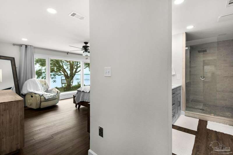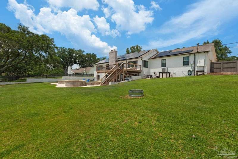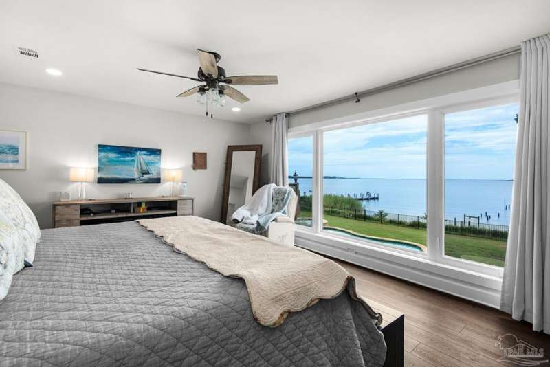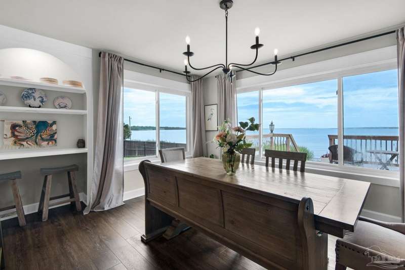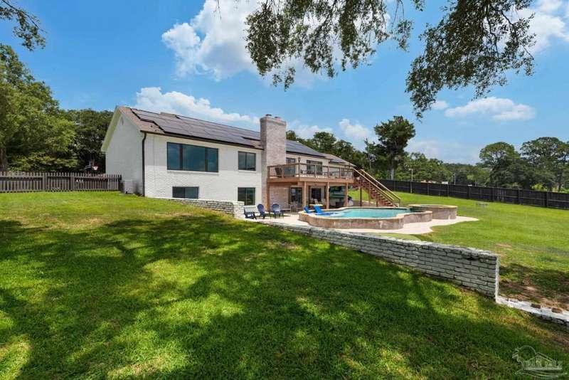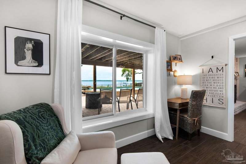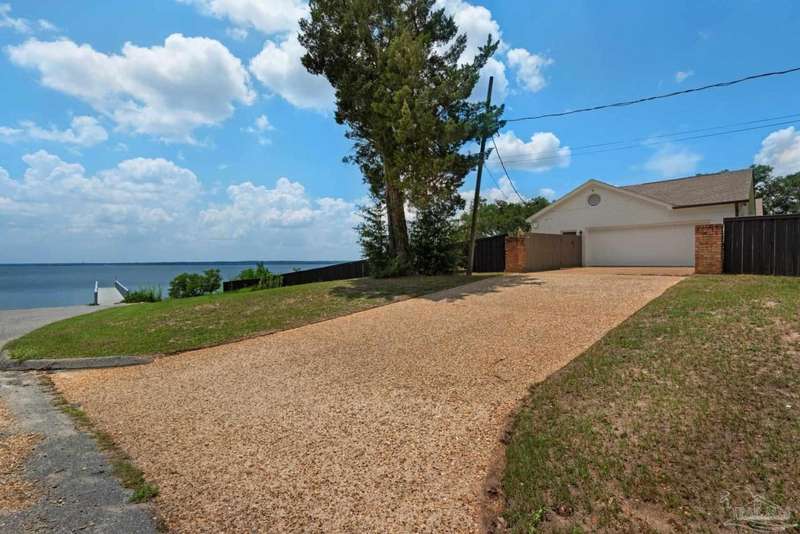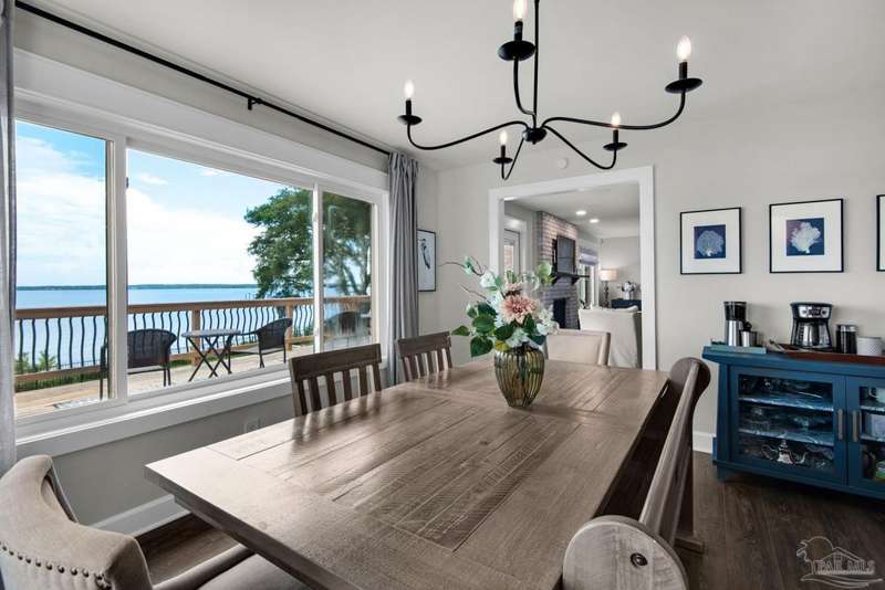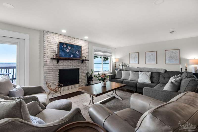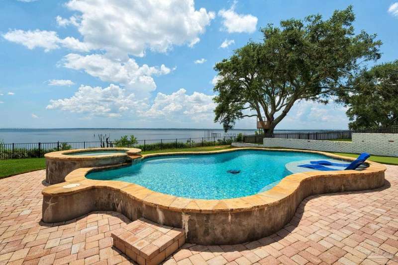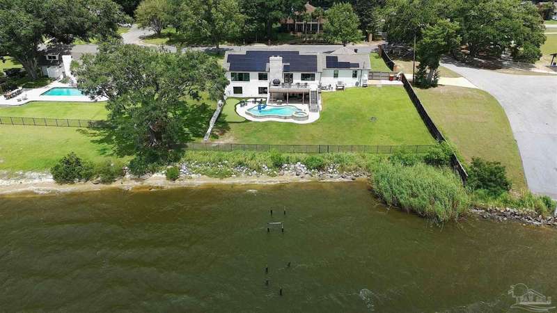 OPEN HOUSE OCTOBER 11, 11-1:00 Stunning renovated home on Andrew Jackson Drive, offering 150 feet of waterfront on Escambia Bay. Sitting on nearly an acre, this waterfront paradise features a gunite pool, spa, & a putting green. Enjoy breathtaking sunsets from this 4bedroom, 3bath residence, with water views captured from almost every room. While a portion of the lot is located in a flood zone, the home is not making flood insurance more affordable. Completely renovated down to the studs, interior is brand new in 2024. Step through the foyer into the spacious main living area on the first level, where panoramic water views greet you. The living room has a cozy wood-burning fireplace & built-in floor-to-ceiling bookcases, ideal for displaying your favorite collections. The bright and airy kitchen & dining space are equipped with abundant cabinets, stone countertops, & a double oven. A large walk-in pantry offers ample storage and bar seating provides casual eating options. The primary suite is a retreat with gorgeous bay vistas, featuring a luxurious bathroom with a double vanity, built-in shelves, a soaking tub, & a large tiled shower. A generous walk-in closet ensures plenty of space for your wardrobe. Additional first-floor amenities include a bedroom, full bath, laundry room, and direct access to an open deck overlooking the bay. Downstairs, you'll find a spacious family room with a fireplace & built-in cabinetry, perfect for gatherings. This level also includes two more bedrooms with bay & pool views, a full bath, two versatile bonus rooms ideal for offices or guest suites, and additional storage closets. Enjoy outdoor living with a covered patio leading to the sparkling gunite pool, spa, & putting green.The backyard offers expansive green space for entertaining, along with an observation/platform tree fort for the kids.This unique gem combines luxurious updates, breathtaking views, and outdoor fun-an exceptional waterfront lifestyle waiting to be discovered.