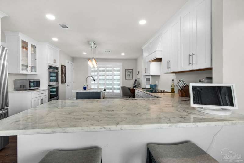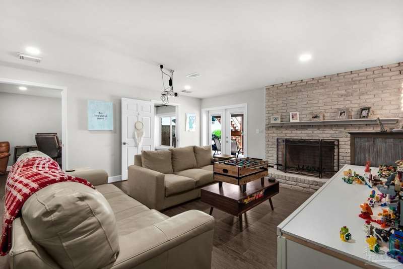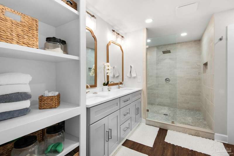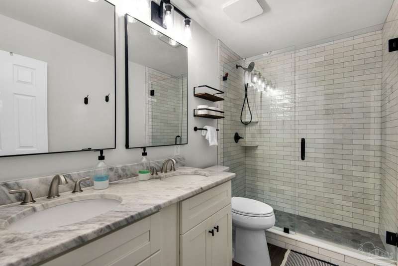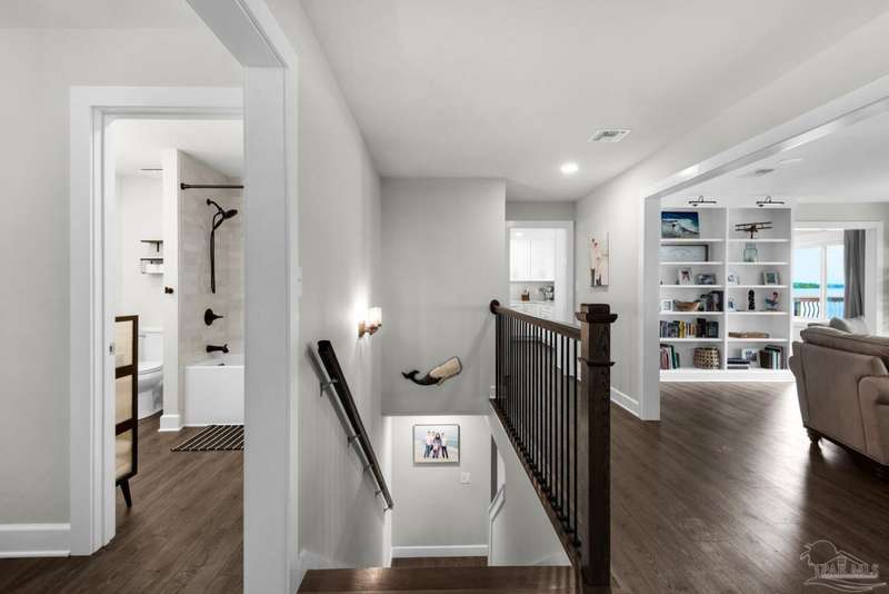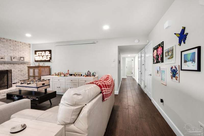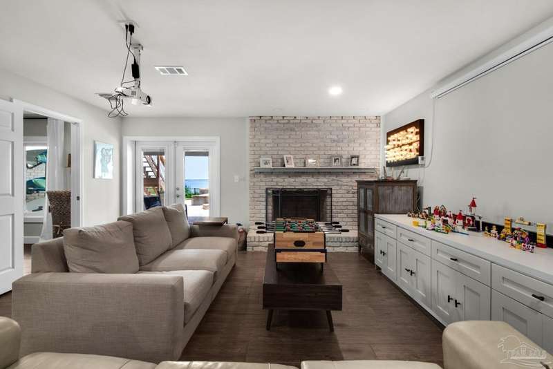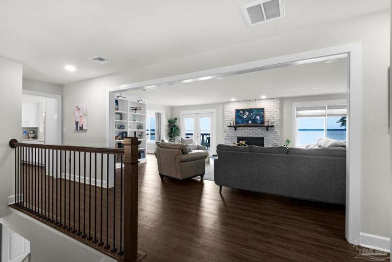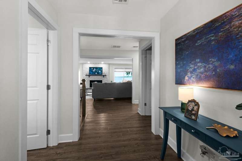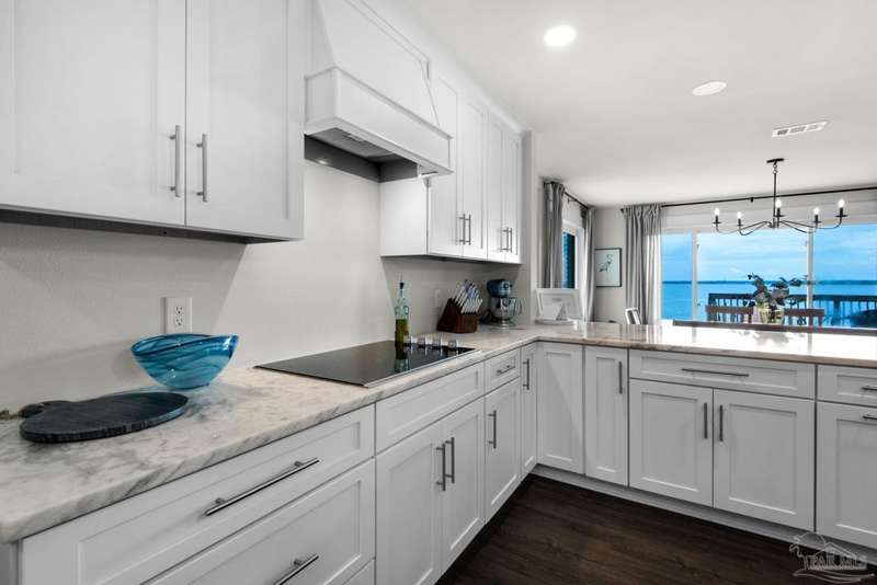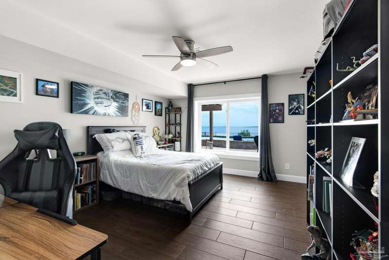 OPEN HOUSE OCTOBER 11, 11-1:00 Stunning renovated home on Andrew Jackson Drive, offering 150 feet of waterfront on Escambia Bay. Sitting on nearly an acre, this waterfront paradise features a gunite pool, spa, & a putting green. Enjoy breathtaking sunsets from this 4bedroom, 3bath residence, with water views captured from almost every room. While a portion of the lot is located in a flood zone, the home is not making flood insurance more affordable. Completely renovated down to the studs, interior is brand new in 2024. Step through the foyer into the spacious main living area on the first level, where panoramic water views greet you. The living room has a cozy wood-burning fireplace & built-in floor-to-ceiling bookcases, ideal for displaying your favorite collections. The bright and airy kitchen & dining space are equipped with abundant cabinets, stone countertops, & a double oven. A large walk-in pantry offers ample storage and bar seating provides casual eating options. The primary suite is a retreat with gorgeous bay vistas, featuring a luxurious bathroom with a double vanity, built-in shelves, a soaking tub, & a large tiled shower. A generous walk-in closet ensures plenty of space for your wardrobe. Additional first-floor amenities include a bedroom, full bath, laundry room, and direct access to an open deck overlooking the bay. Downstairs, you'll find a spacious family room with a fireplace & built-in cabinetry, perfect for gatherings. This level also includes two more bedrooms with bay & pool views, a full bath, two versatile bonus rooms ideal for offices or guest suites, and additional storage closets. Enjoy outdoor living with a covered patio leading to the sparkling gunite pool, spa, & putting green.The backyard offers expansive green space for entertaining, along with an observation/platform tree fort for the kids.This unique gem combines luxurious updates, breathtaking views, and outdoor fun-an exceptional waterfront lifestyle waiting to be discovered.