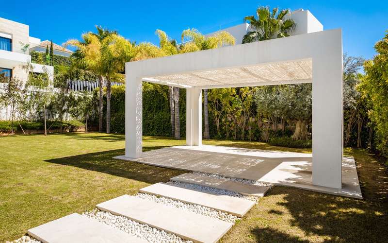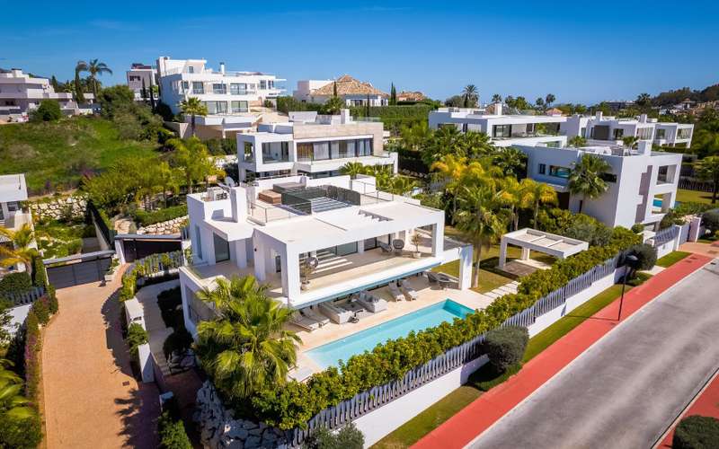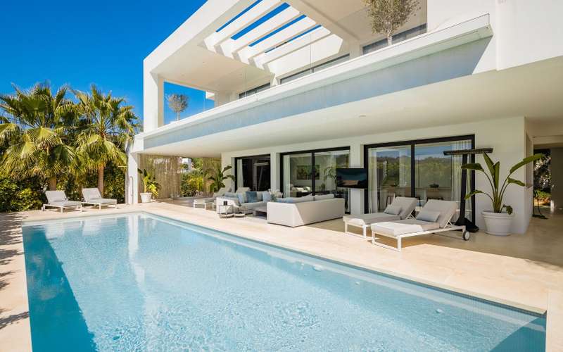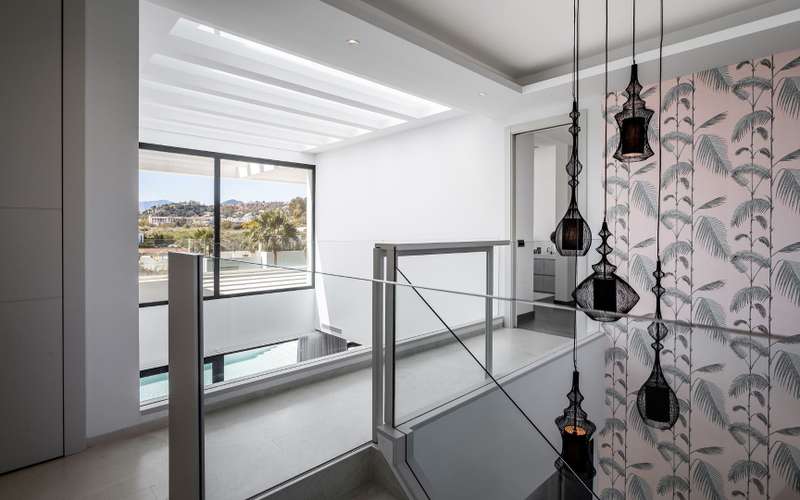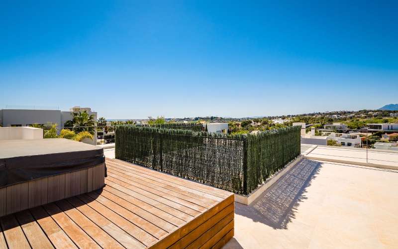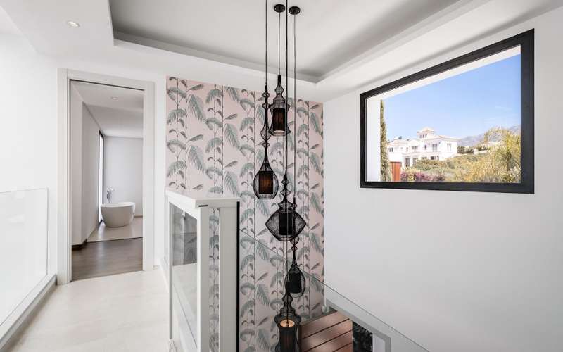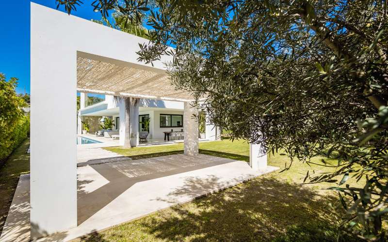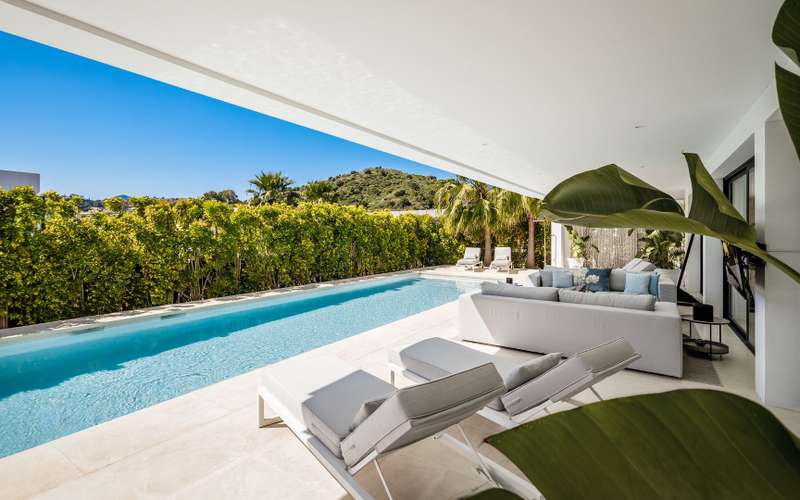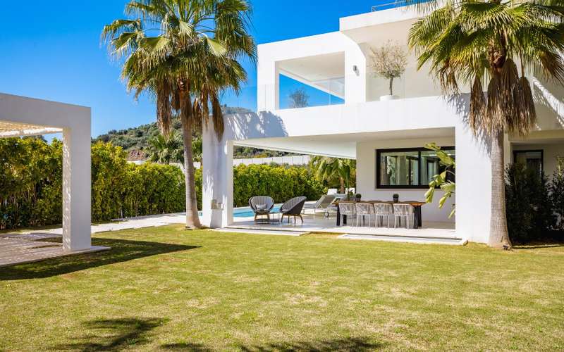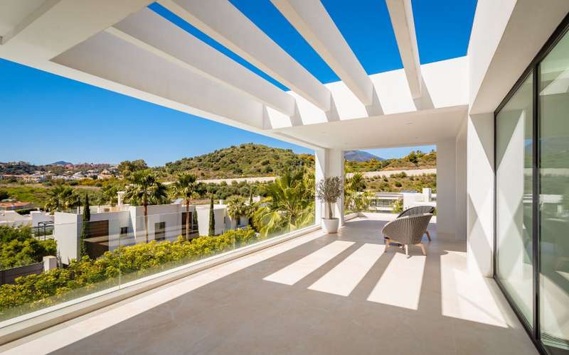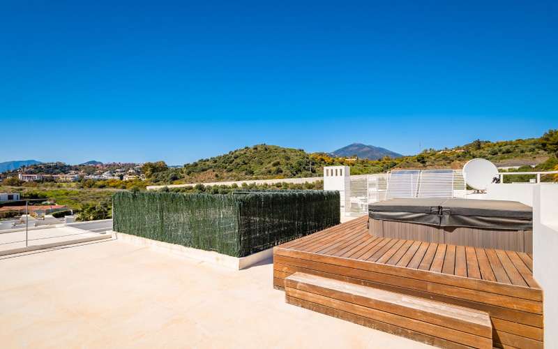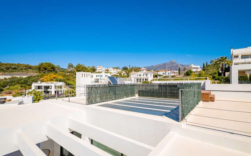 Built to top specifications and finishes, this 5-bedroom villa pays special attention to the Andalusian climate, with plenty of outside seating areas carefully shaded and perfect for relaxing. Distributed on three levels, it comprises, on the main floor: spacious living room with several seating areas; open-plan fully fitted kitchen/dining area equipped with top appliances and with a central island and wine cooler; en-suite guest bedroom; access to the porches, terraces, heated swimming pool and the carefully landscaped garden with mature plants that surround the property create privacy from nearby homes. Upstairs: one guest en-suite bedrooms with fabulous views over the Golf Valley; and stunning master suite with dressing room, and a wrap-around terrace also enjoying the amazing views. Lower level: further 2 guest bedrooms, one of them en suite; garage for 3 cars. Possibility to add a gym or cinema on this level. Rooftop with panoramic and partial sea views, with chill out