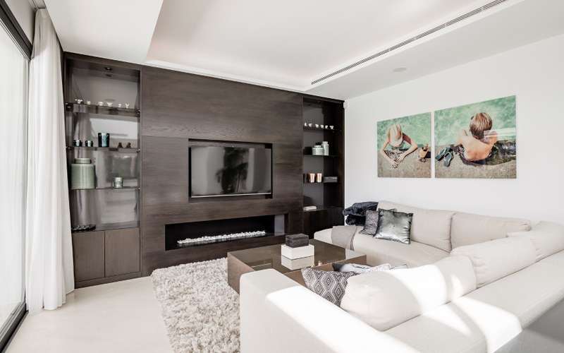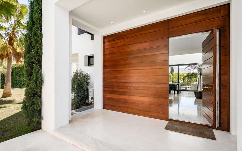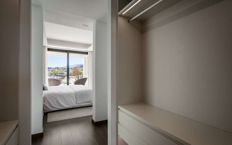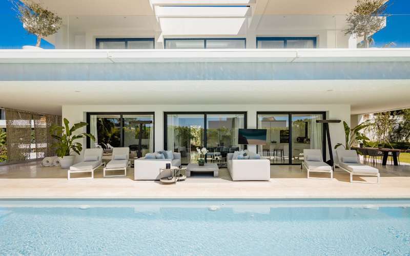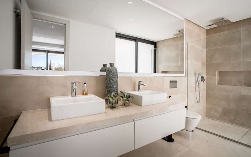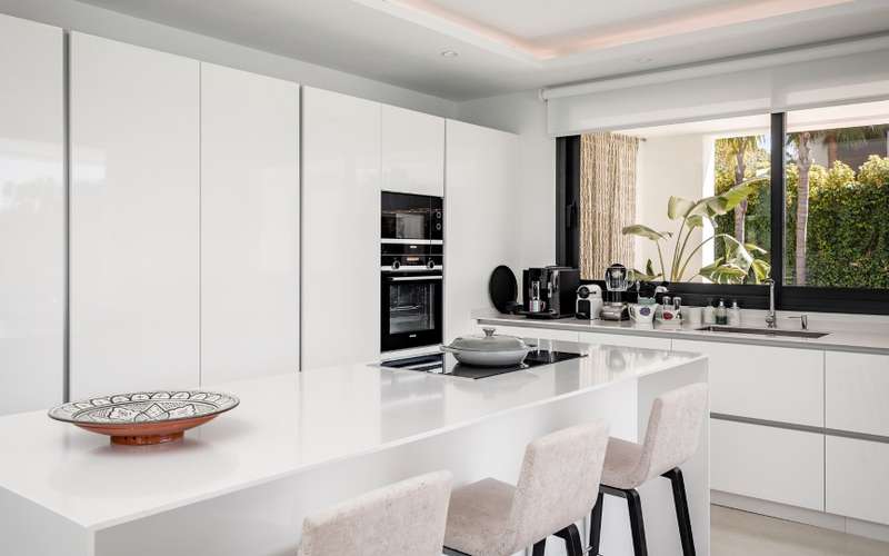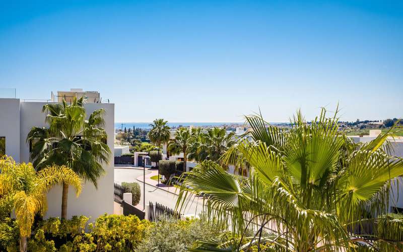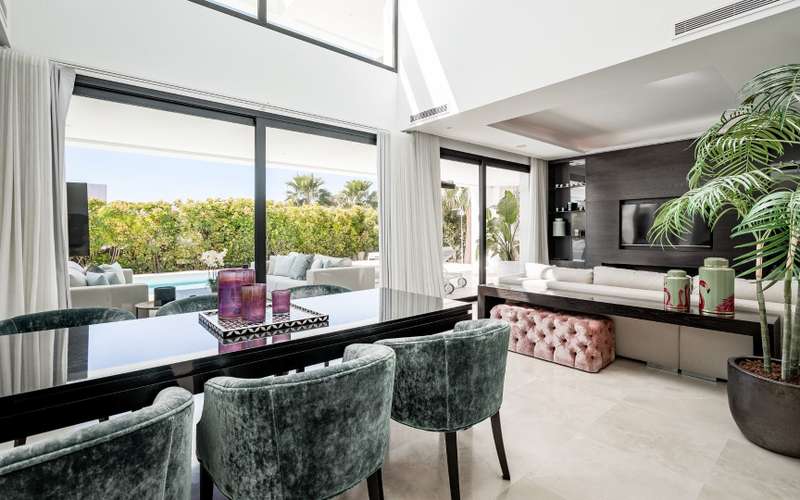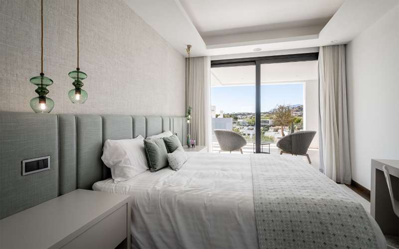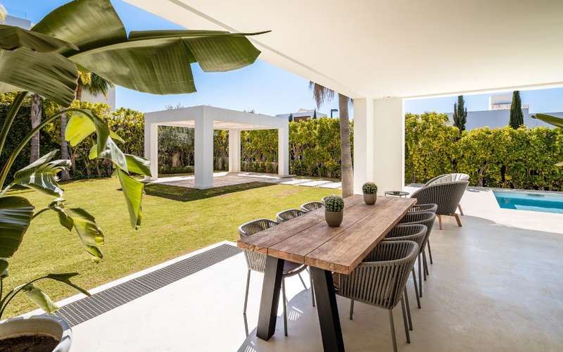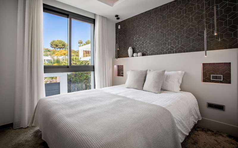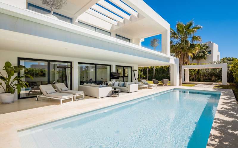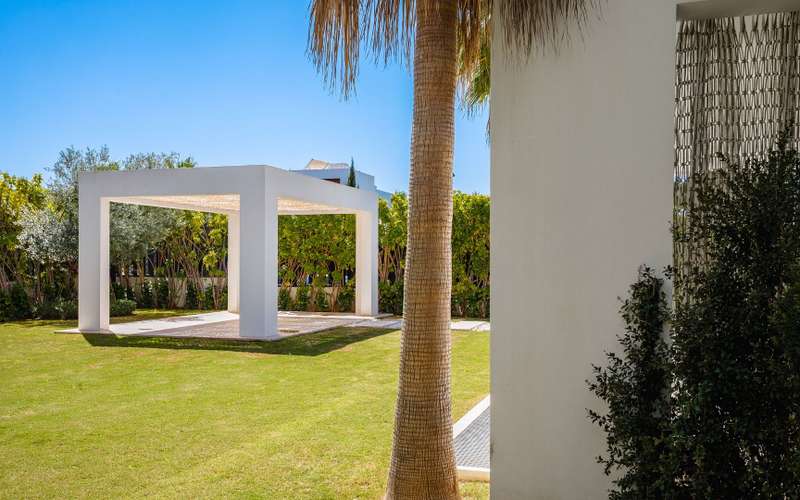 Built to top specifications and finishes, this 5-bedroom villa pays special attention to the Andalusian climate, with plenty of outside seating areas carefully shaded and perfect for relaxing. Distributed on three levels, it comprises, on the main floor: spacious living room with several seating areas; open-plan fully fitted kitchen/dining area equipped with top appliances and with a central island and wine cooler; en-suite guest bedroom; access to the porches, terraces, heated swimming pool and the carefully landscaped garden with mature plants that surround the property create privacy from nearby homes. Upstairs: one guest en-suite bedrooms with fabulous views over the Golf Valley; and stunning master suite with dressing room, and a wrap-around terrace also enjoying the amazing views. Lower level: further 2 guest bedrooms, one of them en suite; garage for 3 cars. Possibility to add a gym or cinema on this level. Rooftop with panoramic and partial sea views, with chill out