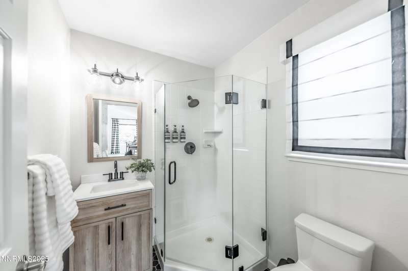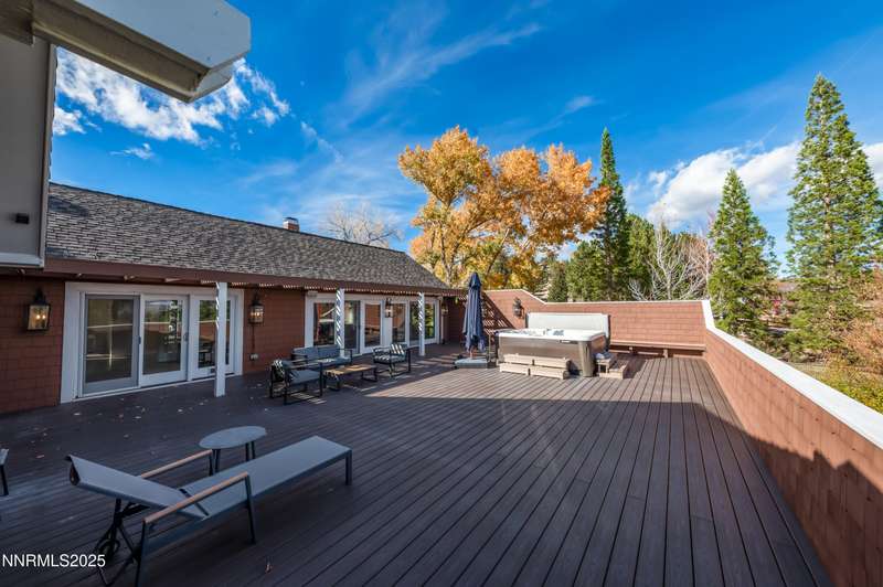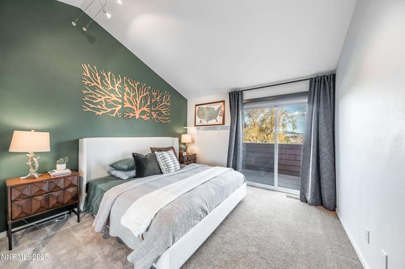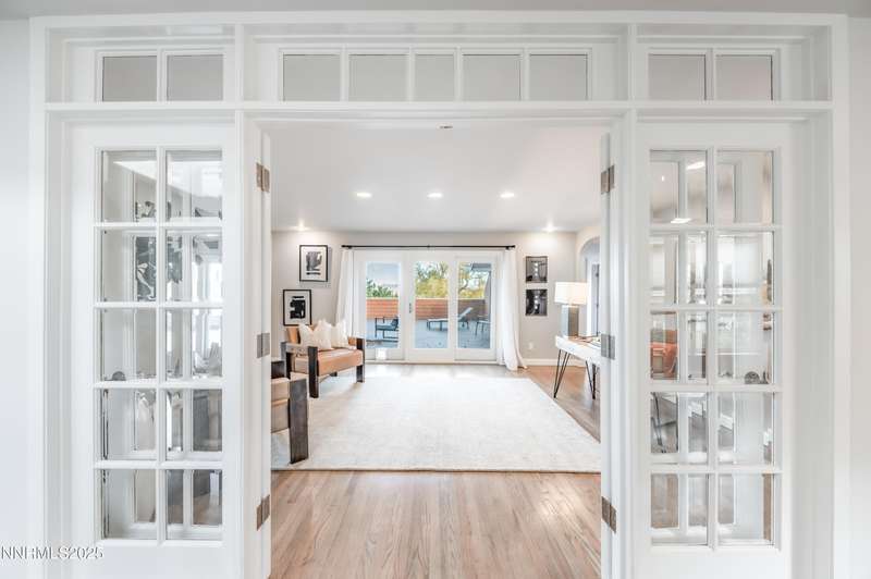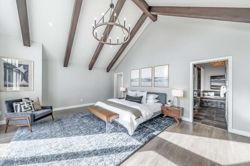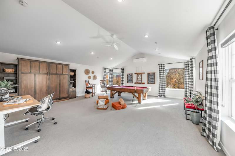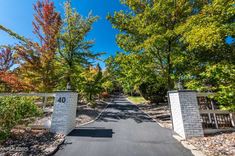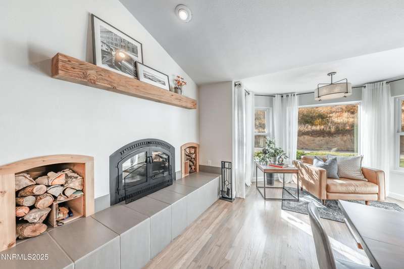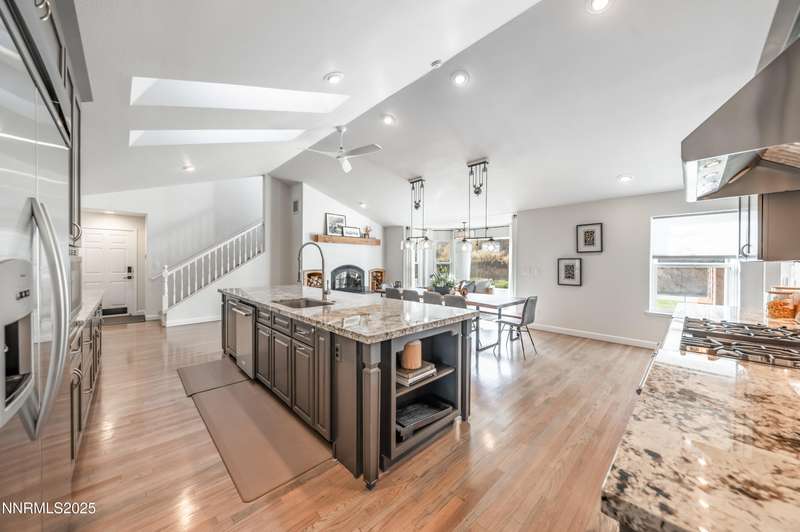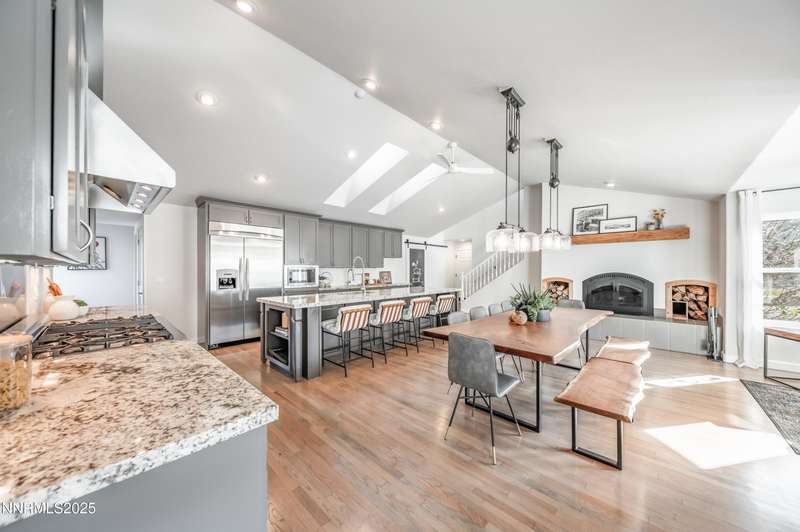 Discover a peaceful retreat on 2.97 acres in South Suburban Reno, set at the end of a quiet cul-de-sac and bordered by the Steamboat Ditch. Mature landscaping, tall trees, and wide-open grounds create a private, park-like setting ideal for outdoor living, gardening, and recreation. A long, tree-lined driveway—finished with a combination of asphalt and pavers—leads to the residence and includes an additional parking pad. Car enthusiasts and hobbyists will appreciate the 720 sq. ft. detached garage with 8-foot and 10-foot doors, along with an attached three-car garage providing abundant parking and storage. Inside, the home blends modern updates with warm architectural character. The great room features vaulted ceilings with exposed beams, expansive windows that frame the surrounding landscape, and a full stone wall with a wood-burning fireplace that adds texture and presence. Natural light fills the space, creating a bright and inviting environment. The updated kitchen offers granite countertops, stainless steel appliances, a spacious center island with seating, and an easy transition to the dining area. A second wood-burning fireplace adds warmth and gives the kitchen and dining space a relaxed, welcoming feel. Hardwood flooring through the main living areas enhances the home's clean and timeless appeal. A large recreation room offers extraordinary flexibility. With its generous dimensions, natural light, and full bath, it works beautifully as a game room, studio, home office, fitness space, or additional guest accommodations when needed. Indoor-outdoor living is effortless. An expansive enclosed patio extends the living area and is comfortable year-round. The property also includes a fenced garden with established beds, perfect for those who enjoy growing vegetables, flowers, or herbs. With nearly three acres of usable land, this setting offers room for future amenities, outdoor projects, or simply enjoying the peace and privacy. All of this is located just minutes from South Reno conveniences, schools, and shopping. A rare opportunity to own an updated home with substantial land, garage capacity, and flexible living spaces in one of Reno's most desirable suburban settings.