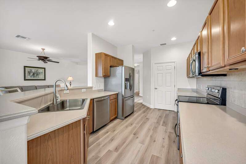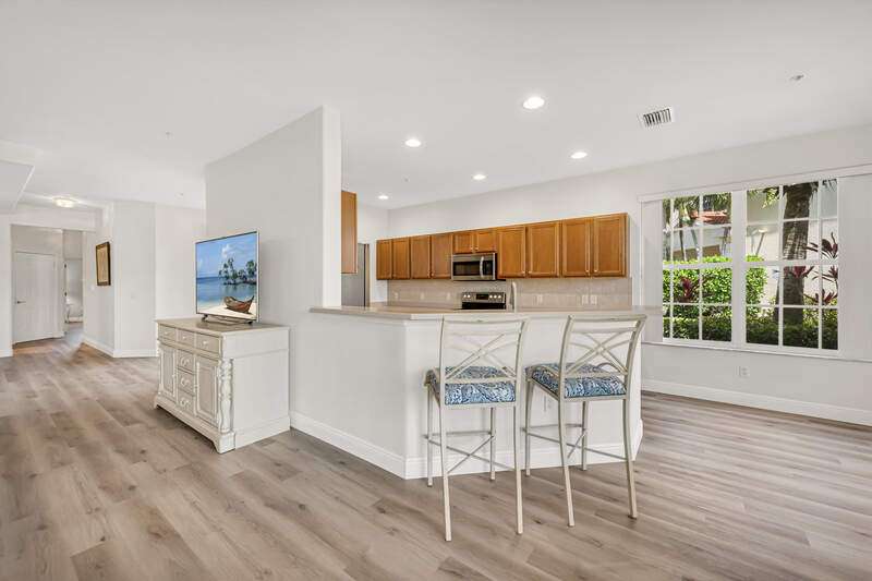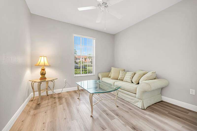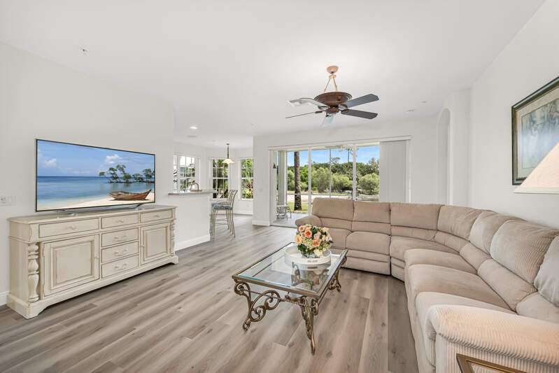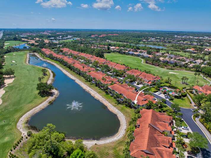 Welcome to this first-floor end unit Carriage home, nestled in the perfect location in Lake Arrowhead. Walk up to a private, luscious greenery entrance where double glass storm doors welcome you home. This home has 3 bedrooms and 2 bathrooms, a large open-concept living room and dining room, with new flooring and recently painted and bright and private windows throughout. You may recharge and start every morning with a beautiful sunrise on an east-facing private lanai. From the lanai, a view of Par 5 hole number 11, and the lake fountain, and a community pool just steps away from your front door, this truly is your own private paradise in Naples Lakes Country Club. Naples Lakes Country Club is a Toll Brothers Premier Bundled golf community where ownership includes membership to a Signature Arnold Palmer Golf Course. Immediate Golf Membership at closing. Many amenities await, with plenty of activities. Tru-Hard tennis, Bocce, Lap pool with zero entry resort style pool, fitness center, Aqua range, large putting green, formal dining at the clubhouse, casual dining at Arnies cabana. Minutes away from Physicians Regional Hospital, Naples' famous 5th Avenue, and Marco Island. Don't miss this great opportunity to live in this perfect location at the award-winning Naples Lakes Country Club.