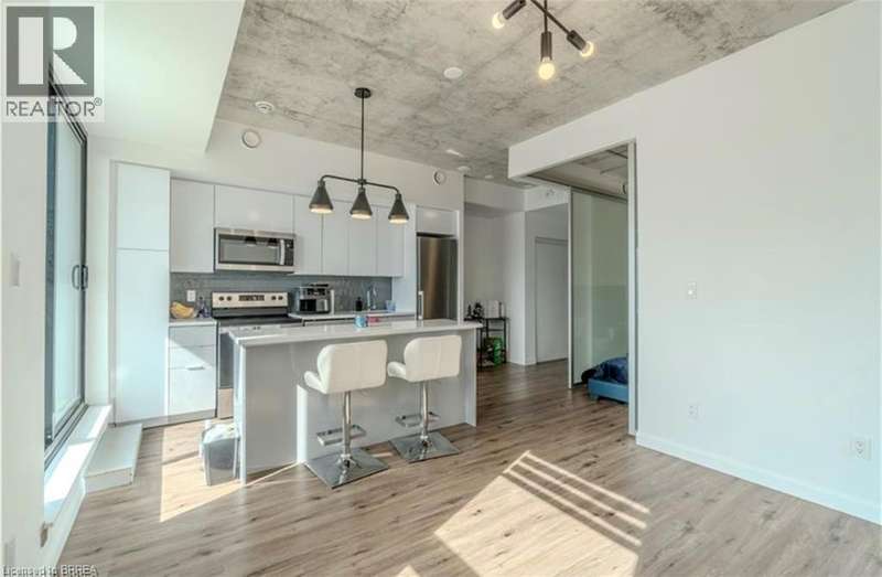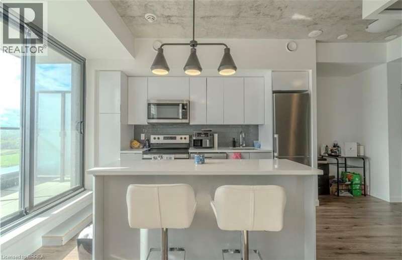 Welcome to your stylish urban retreat at 7 Erie Ave in Brantford! This modern 1-bedroom, 1-bathroom condo offers contemporary living with sleek finishes, an open-concept layout, and large windows that fill the space with natural light. The kitchen features stainless steel appliances, quartz countertops, and ample cabinet space, flowing into a cozy living area with access to a private balcony. The bedroom includes generous closet space. In-suite laundry adds convenience, and residents enjoy access to premium amenities such as a fitness center, social lounge, and secure parking. Located near the Grand River, parks, schools, public transit, and downtown amenities. (id:7434)
