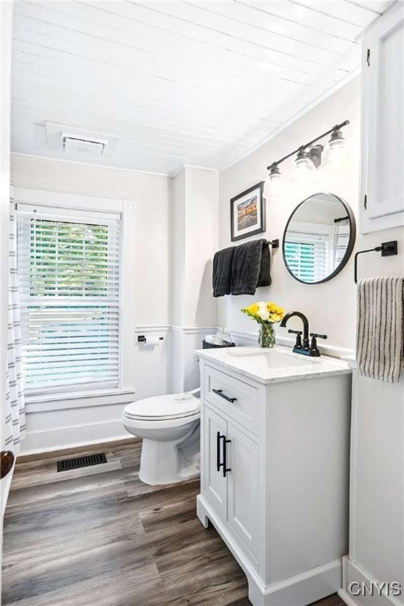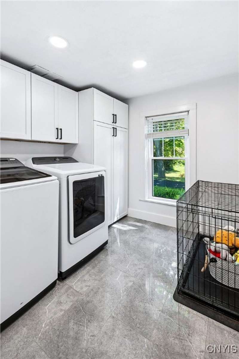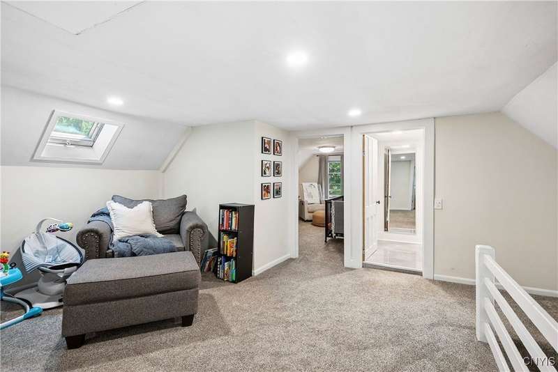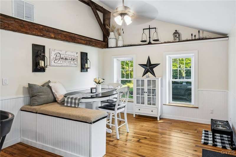 Sitting on more than an acre of land surrounded by beautiful rural views, this charming farmhouse radiates a cozy atmosphere. The recently updated kitchen features tall ceilings, exposed wooden beams, stainless steel appliances, a custom stove hood, and a quaint dining area. Natural light fills the family room, showcasing the original hardwood floors. On the first floor, you'll find a new full bathroom with a vanity and tub shower combo, as well as a convenient laundry room with built-in cabinets and tiled floors. The formal living room is enhanced by a gas wood stove and intricate moldings. A first-floor bedroom, currently used as a playroom, includes a spacious closet. Upstairs, three generous bedrooms await, along with a landing that could double as an office or hangout spot. The second floor also boasts a new full bathroom with a double vanity and shower tub combo. The landscaped yard features mature trees and a detached heated two-car garage. Situated in the Skaneateles school district, this farmhouse offers a tranquil escape with modern conveniences. Additionally, Lake access at the end of Bockes Road is available to all residents of the town of Spafford.