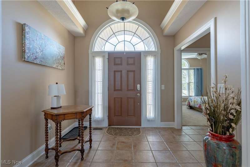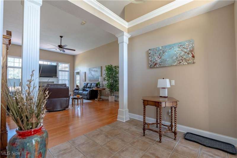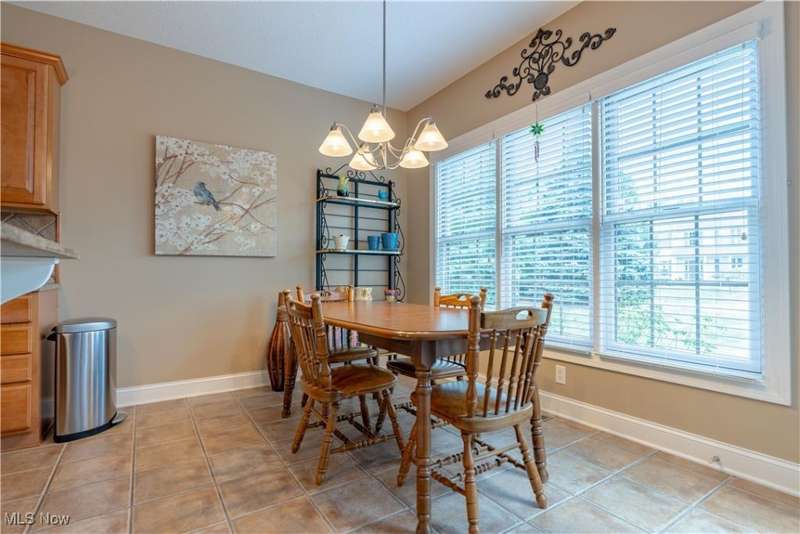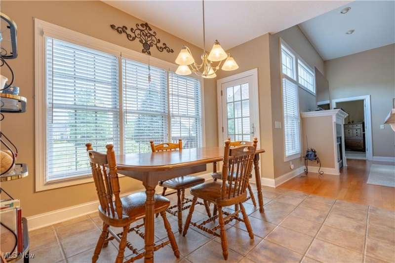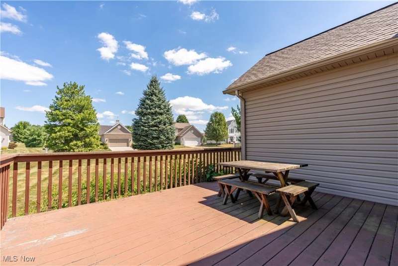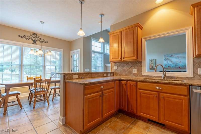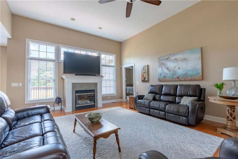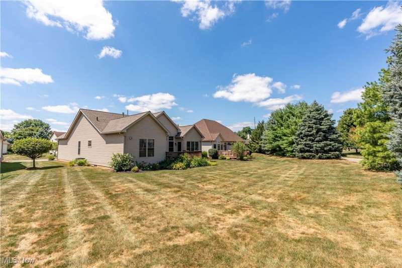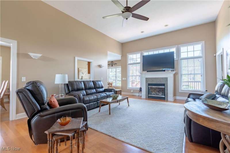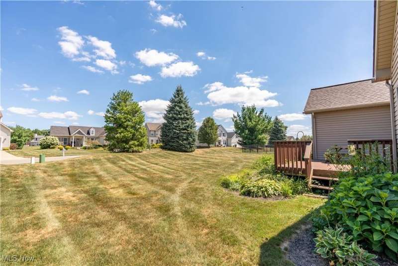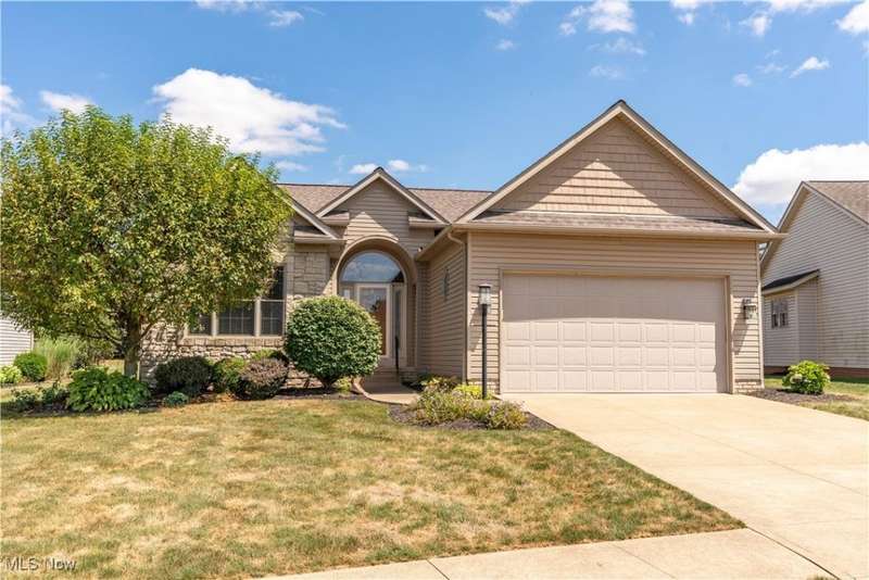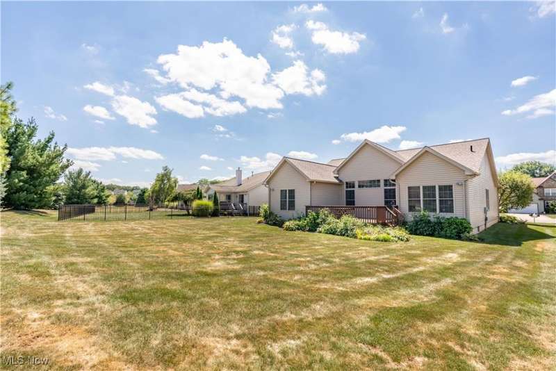 This charming ranch-style home offers a perfect blend of comfort and style with three bedrooms and two full bathrooms. The inviting great room features 10-foot ceilings, hardwood floors, and an elegant pillared entryway, all accented by crisp white trim and a cozy gas fireplace. The open layout flows seamlessly into the large eat-in kitchen, complete with a breakfast bar, granite countertops, stainless steel appliances, hickory cabinets, and a stylish tiled backsplash. Adjacent to the kitchen is a formal dining room, ideal for entertaining. The large primary suite is a true retreat, boasting a private bath with a separate jetted tub, shower, dual sinks with a granite vanity, and a generous walk-in closet. Two additional bedrooms provide ample space, with the third bedroom offering the flexibility to be used as an office. A second full bathroom completes the layout. The home's thoughtful design includes a convenient split-bedroom layout, ensuring privacy. A first-floor laundry area is located just off the garage for added convenience. Outside, the backyard has a composite deck, perfect for relaxing or hosting guests. The large unfinished basement is ready for your customization, featuring plumbing for an additional bath, glass block windows, and a radon mitigation system. The HVAC was replaced in 2023, and the roof was replaced in March 2023. Originally built as a free-standing villa, the HOA was disbanded and integrated into the neighborhood HOA years ago.