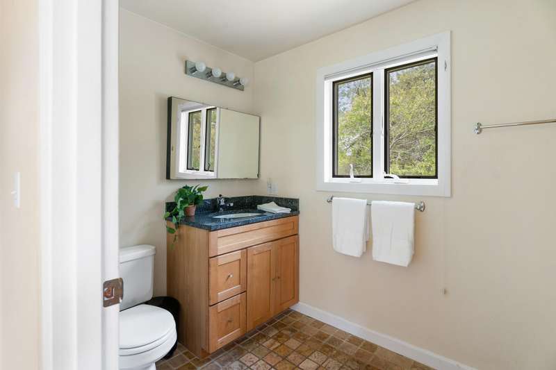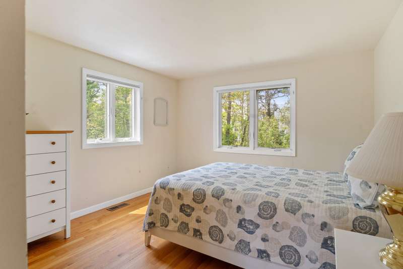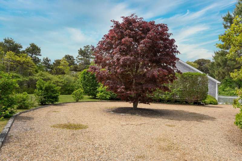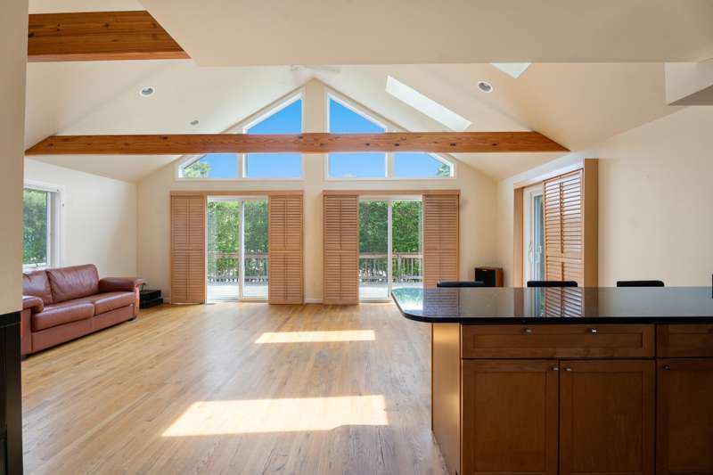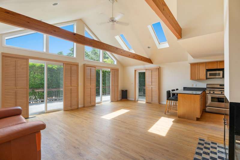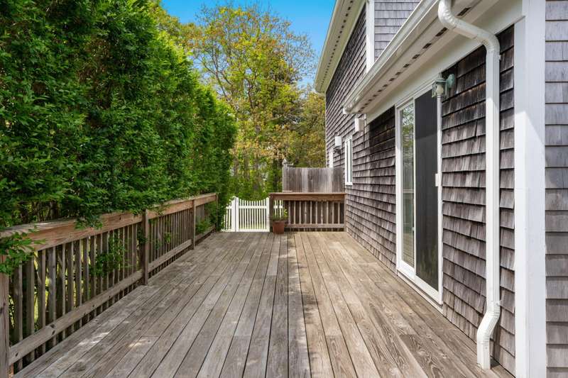 Vacation Getaway in Edgartown Estates - This sunny and welcoming contemporary home could be yours! With an open layout, vaulted ceilings, and lots of windows and glass doors, the home feels bright and airy. Step outside to a spacious wrap-around deck-great for relaxing or entertaining. Inside, the living, dining, and kitchen areas flow nicely and are just the right size for gathering. The first floor has three guest bedrooms, while upstairs you'll find a loft, the primary bedroom suite, and a private balcony. Other features include hardwood floors, air conditioning, a full basement, and an outdoor shower-perfect after a day at the beach. The half-acre lot offers a nice lawn with mature trees and plantings that give privacy from the road and neighbors. Edgartown Estates is an excellent location, just off the bike path to South Beach or into Edgartown Village. Come take a look!