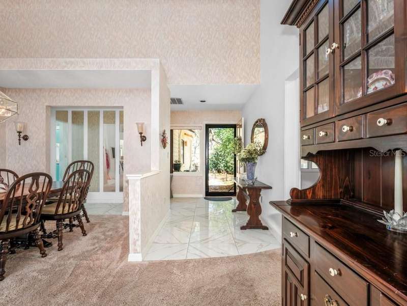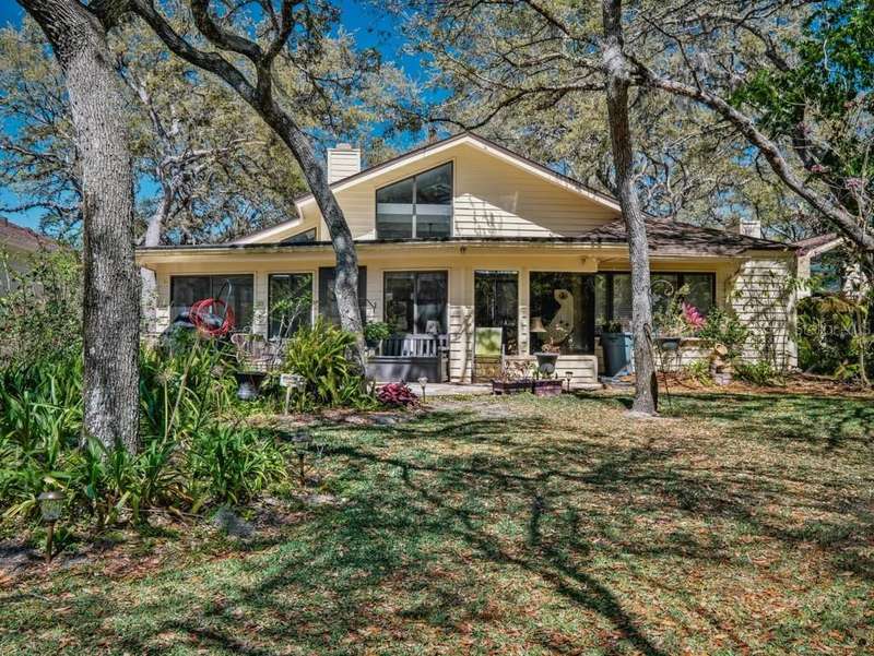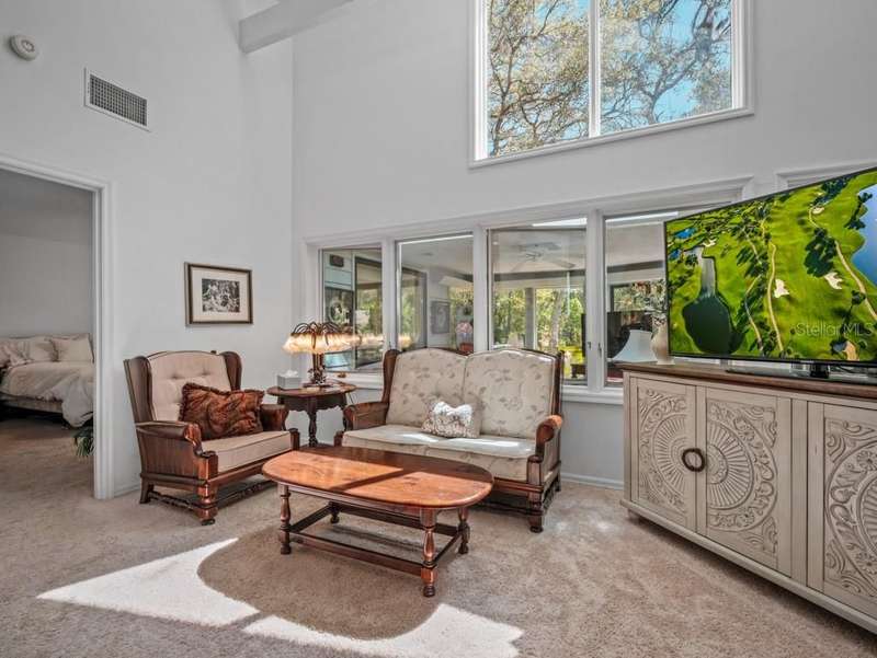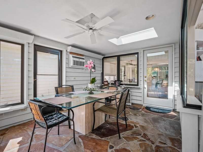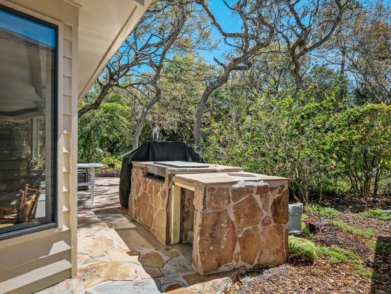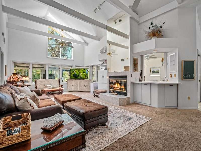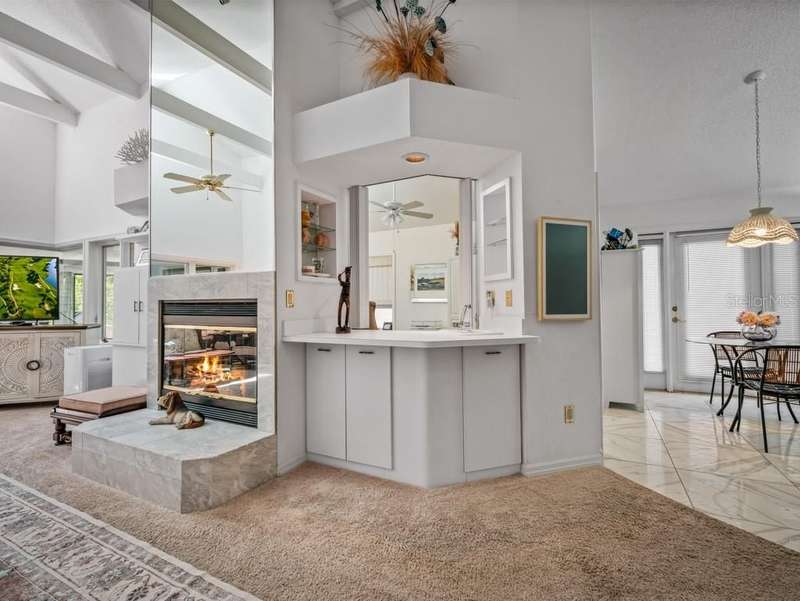 Welcome to this beautifully maintained 2-bedroom, 2-bathroom home located in the sought-after St. Andrew neighborhood, part of the exclusive Sugar Mill Country Club community. This light-filled residence offers a thoughtful split floor plan designed for comfort and privacy.Step inside to find soaring vaulted ceilings, creating an airy, open ambiance. A cozy fireplace and built-in wet bar add character to the spacious living area-perfect for entertaining or quiet evenings at home. The kitchen includes a charming breakfast nook, ideal for morning coffee. The versatile Florida room features a unique stone floor that brings the outdoors in. Step outside to enjoy the serene stone patio, perfect for dining al fresco or simply soaking in the Florida sunshine. A dedicated office space provides flexibility for remote work or hobbies. The primary suite is a relaxing retreat, while the guest bedroom and second bath are perfectly positioned for privacy. With large windows throughout, this home is bathed in natural light and surrounded by the lush, tranquil backyard. Enjoy the lifestyle that comes with this gated community, just minutes from beaches, shopping, and dining. St Andrews features it's own community pool and separate gate from the main entrance. Sugar Mill Country Club amenities available through private membership. HVAC 2014, water heater 2022