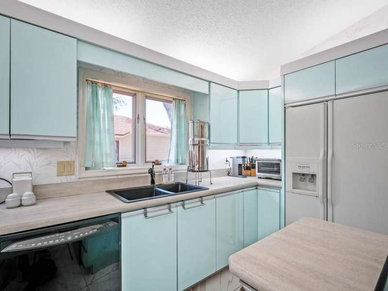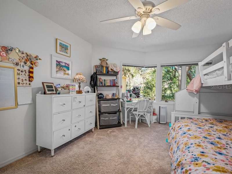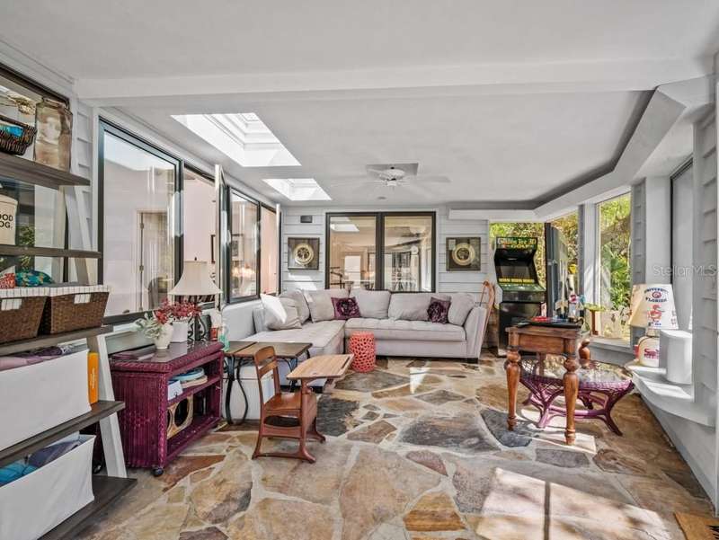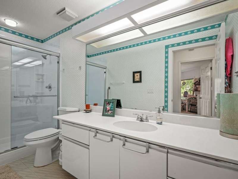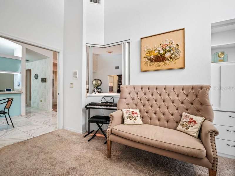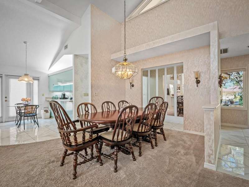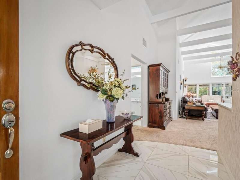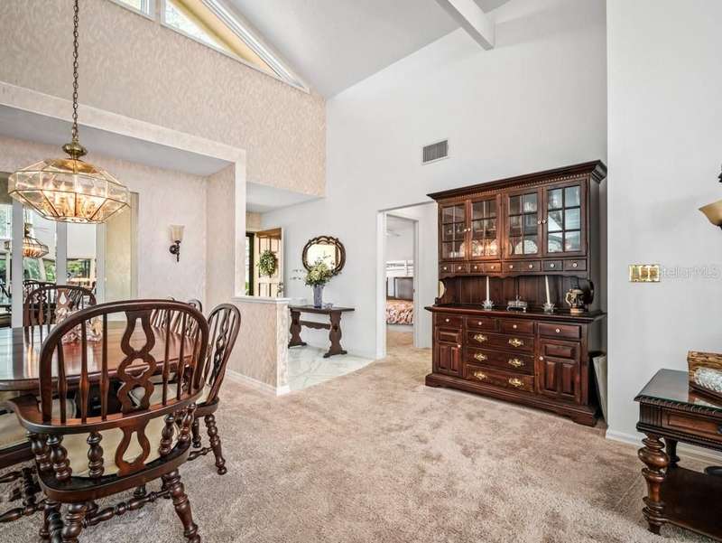 Welcome to this beautifully maintained 2-bedroom, 2-bathroom home located in the sought-after St. Andrew neighborhood, part of the exclusive Sugar Mill Country Club community. This light-filled residence offers a thoughtful split floor plan designed for comfort and privacy.Step inside to find soaring vaulted ceilings, creating an airy, open ambiance. A cozy fireplace and built-in wet bar add character to the spacious living area-perfect for entertaining or quiet evenings at home. The kitchen includes a charming breakfast nook, ideal for morning coffee. The versatile Florida room features a unique stone floor that brings the outdoors in. Step outside to enjoy the serene stone patio, perfect for dining al fresco or simply soaking in the Florida sunshine. A dedicated office space provides flexibility for remote work or hobbies. The primary suite is a relaxing retreat, while the guest bedroom and second bath are perfectly positioned for privacy. With large windows throughout, this home is bathed in natural light and surrounded by the lush, tranquil backyard. Enjoy the lifestyle that comes with this gated community, just minutes from beaches, shopping, and dining. St Andrews features it's own community pool and separate gate from the main entrance. Sugar Mill Country Club amenities available through private membership. HVAC 2014, water heater 2022