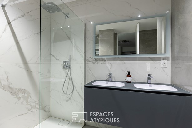 The flat, with its high, soundproofed ceilings, comprises four independent suites, each with its own shower room and integrated dressing room, guaranteeing practicality and privacy. The vast living room, bathed in natural light thanks to large picture windows, opens onto an open-plan kitchen, fully equipped and fitted with top-of-the-range materials. The adjoining dining room creates a seamless flow between the spaces. A study provides a quiet, functional workspace. A utility room and a remarkable air-conditioned wine cellar complete this meticulous layout. Full home automation provides optimised management of all the equipment, enhancing day-to-day comfort.