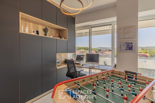 Every room in the flat opens onto the 105 m2 terrace, providing a constant feeling of openness to the outdoors. The roof terrace, accessible by a private lift, is a veritable open-air living space. Designed as a space for relaxation and entertaining, it boasts an integrated jacuzzi, two pergolas, a summer kitchen and a landscaped garden with easy access to a swimming pool. This planted belvedere overlooks Metz and the Moselle valley, offering a unique panorama in all seasons. All this in a high-quality residential environment, close to schools, shops, public transport and the main roads, making it easy to organise daily life.