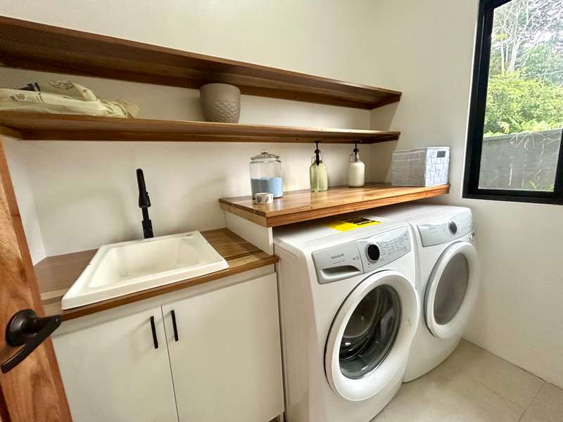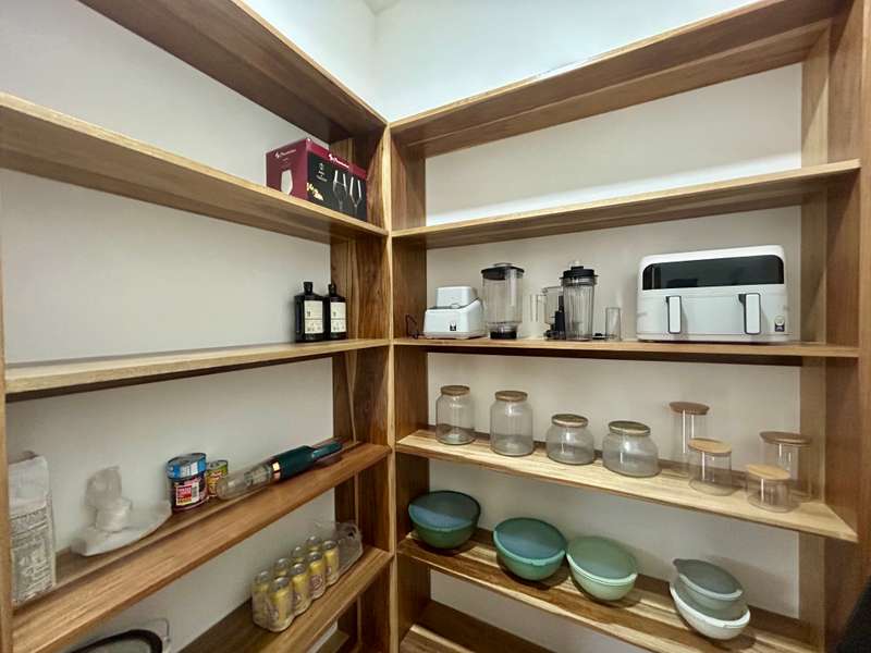 Una amplia despensa asegura excelente almacenamiento para todos tus insumos de cocina. Adyacente a la cocina encontrarás el cuarto de lavado completamente equipado con lavadora, secadora, estantes y espacio adicional para equipo de limpieza.