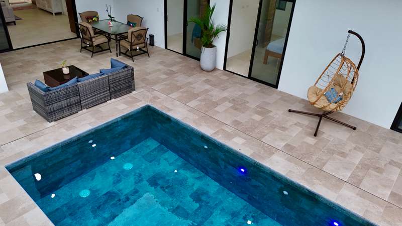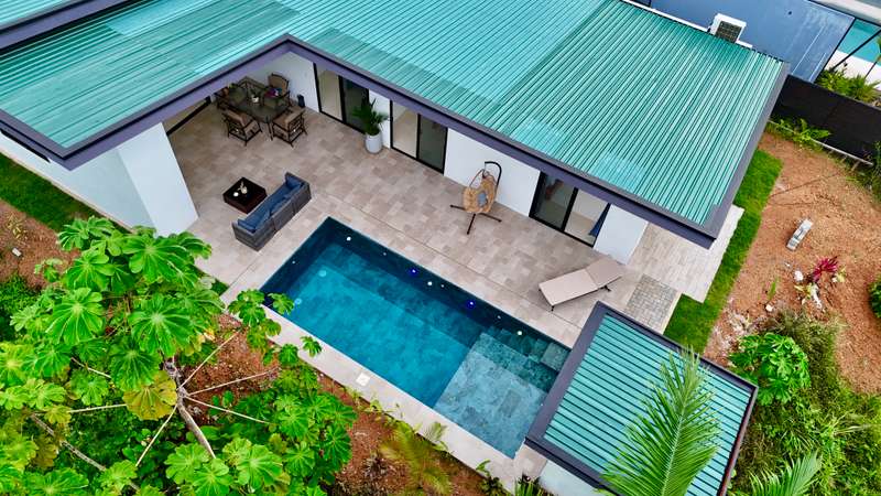 Dado que el estilo de vida en Costa Rica se disfruta al aire libre, el área exterior fue diseñada para maximizar la relajación y el confort. Aquí encontrarás una refrescante piscina con vista a la montaña, ducha exterior, área techada de comedor, parrilla profesional, cava de vinos, sillas de descanso e incluso una hamaca flotante—el escenario perfecto para leer, relajarse y crear recuerdos inolvidables.