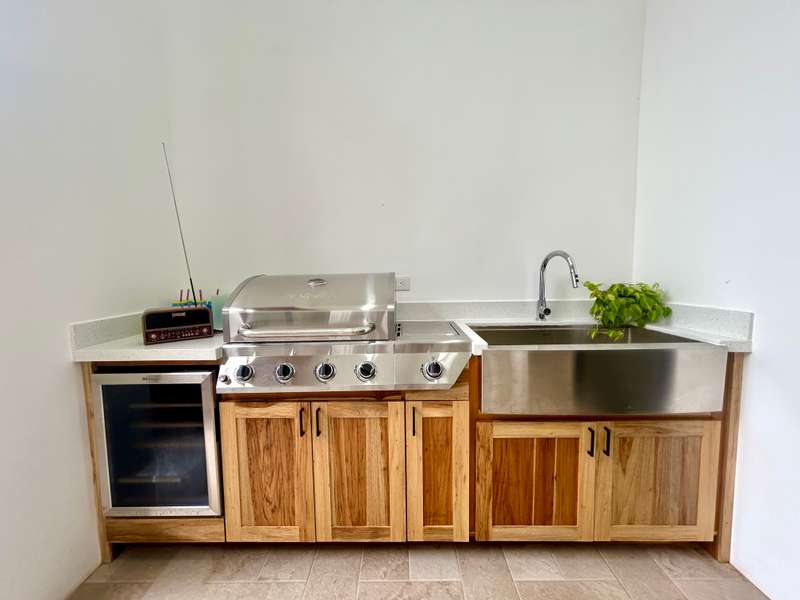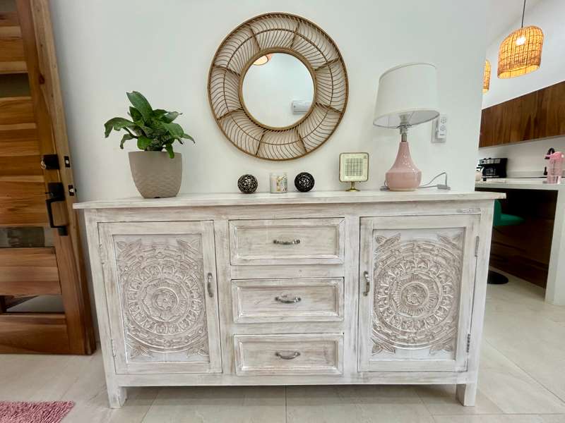 En toda la casa se destacan los acabados de alta calidad y una construcción sólida que aseguran durabilidad y elegancia. Los muebles, elaborados con maderas locales por un artesano de la zona, aportan un detalle único y sofisticado al diseño interior.