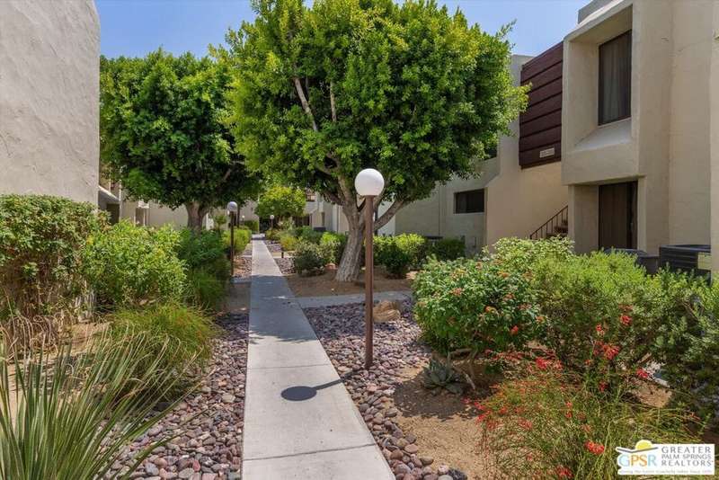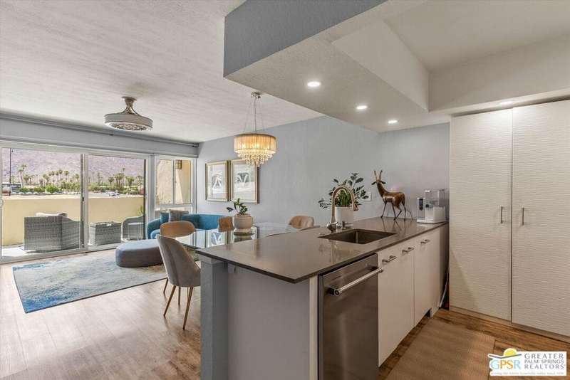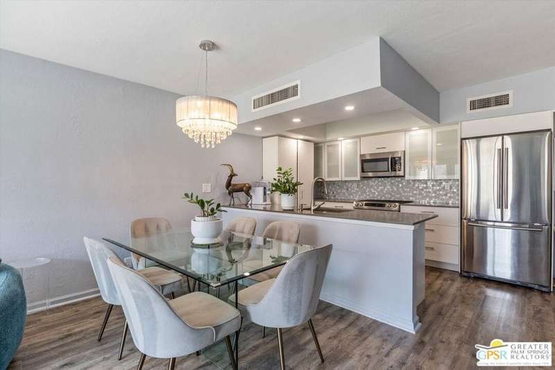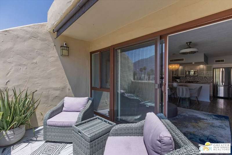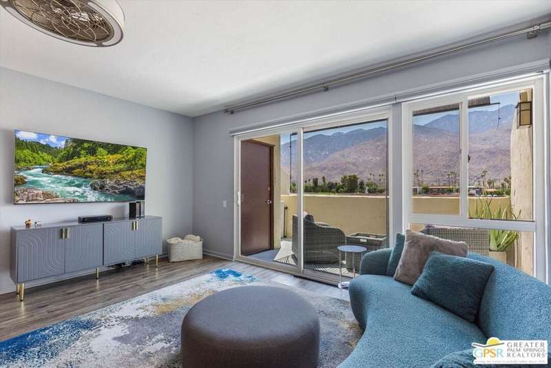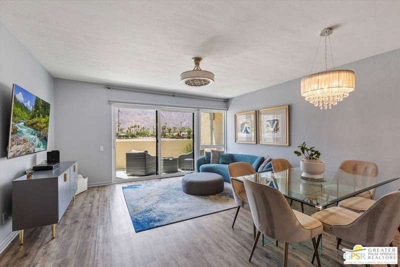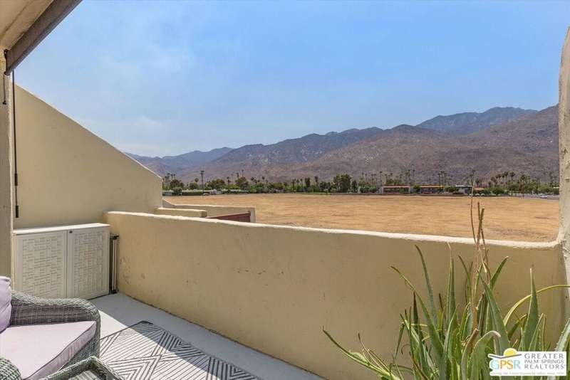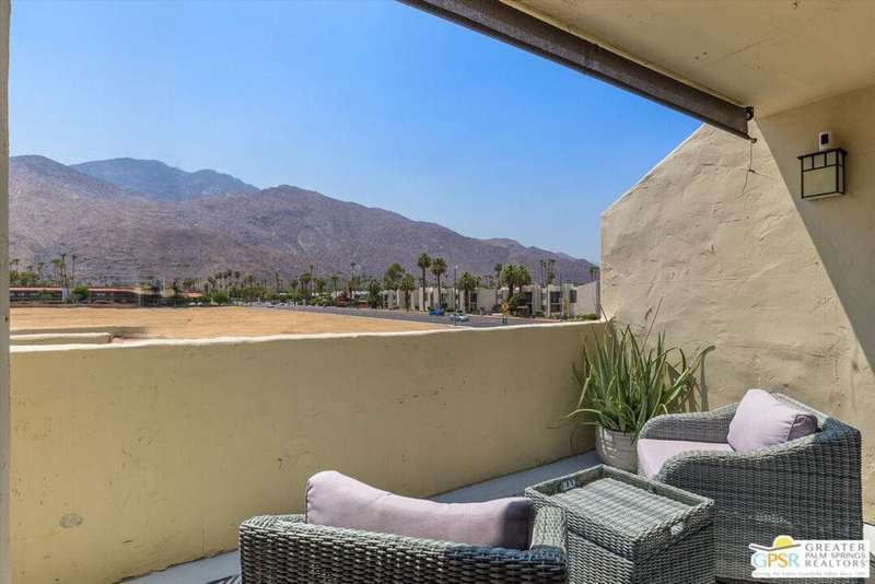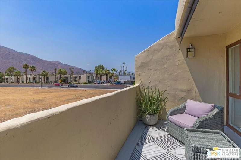 Unobstructed mountain views are only the beginning of the rewards you will enjoy as the owner of this recently remodeled turnkey condo in Palm Springs' sought-after Smoke Tree Racquet Club enclave. Set in a quiet location on the western edge of the resort community, this second-floor residence showcases panoramic vistas of Mount San Jacinto, the iconic Palm Springs Aerial Tramway, and, in the winter, majestic snow-capped peaks. Offered complete with newer furnishings, the open single-level design hosts one bedroom and one bath in approximately 775 square feet, making it perfect for low-maintenance year-round living and a desert vacation getaway. Woodgrain laminate flooring and fashionable paint and lighting are featured throughout, with the living room opening to a private view-enhanced balcony for indoor/outdoor entertaining. The dining room flows directly to a custom chef's kitchen with solid-surface countertops, a full designer-tile backsplash, stainless steel Samsung appliances, a tray ceiling, and newer white cabinetry with translucent glass uppers. Relax stylishly in your primary suite, which offers the rare-for-Smoke Tree advantage of an interior washer and dryer set from LG. Complemented by a beautiful accent wall, the bedroom also features mirrored wardrobe doors, and an ensuite bath with open shelving, custom vanity and an upgraded shower with chic tile surround. A new HVAC system keeps you comfortable during the warm summer days. Reflecting the award-winning talent of famed Palm Springs' architect Hugh Kaptur, Smoke Tree Racquet Club presents a grand central park area with a spa and one of the largest pools in the city. Enjoy lighted tennis and pickleball courts, a dog park and impeccably maintained landscaping. Smoke Tree Village is right across the street and features shops, restaurants, Ace Hardware and Ralphs Fresh Fare Supermarket. Downtown Palm Springs is moments away, miles of hiking trails are nearby, and Palm Springs International Airport makes it easy to enjoy this turnkey condo as a vacation getaway or a full-time residence.