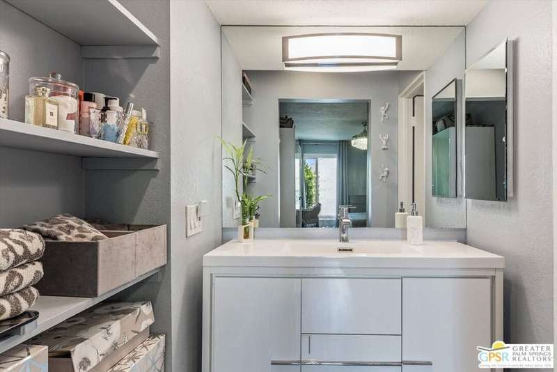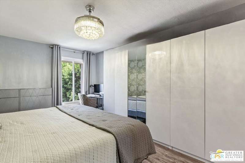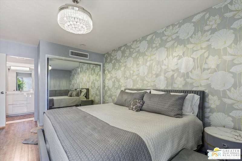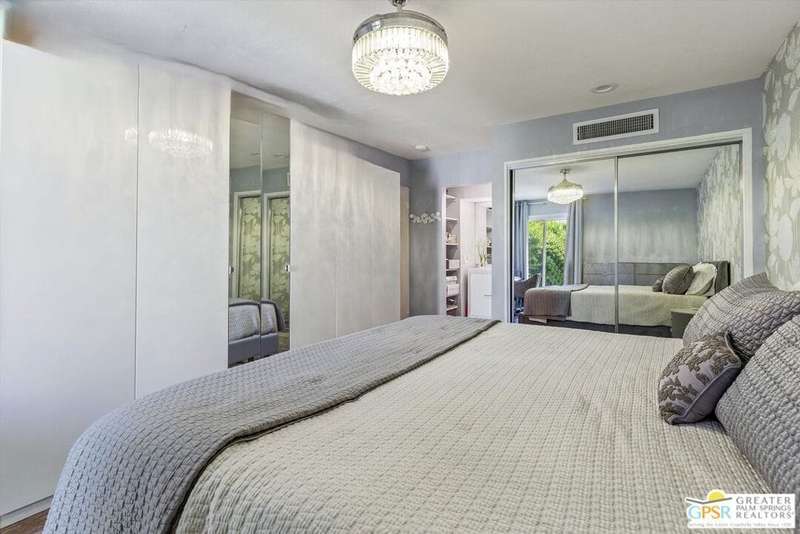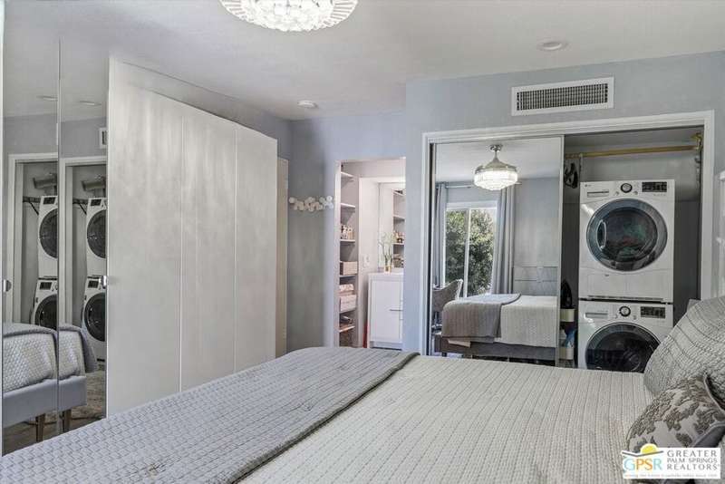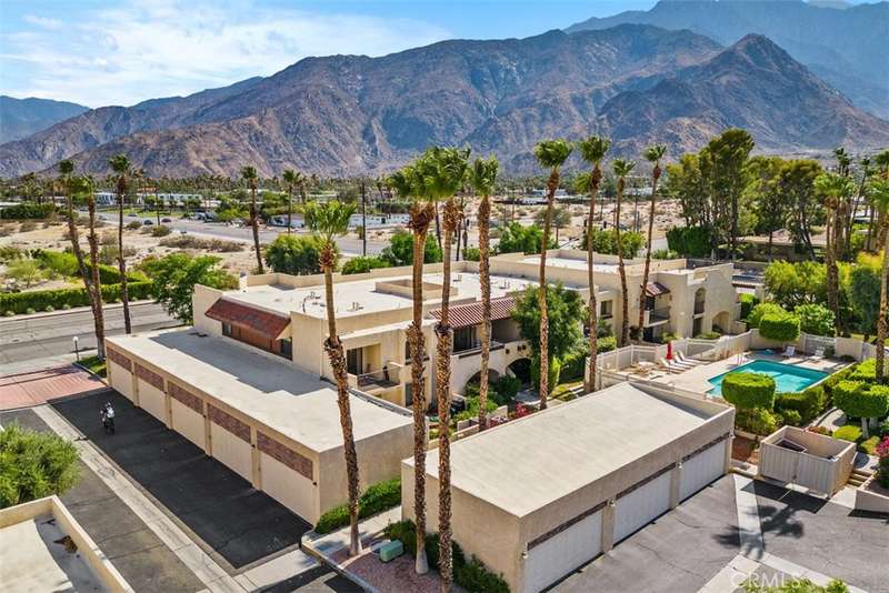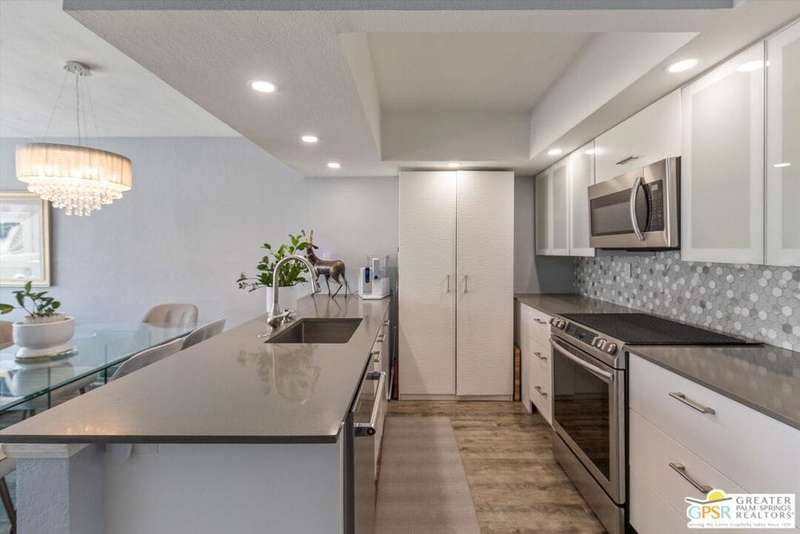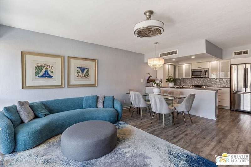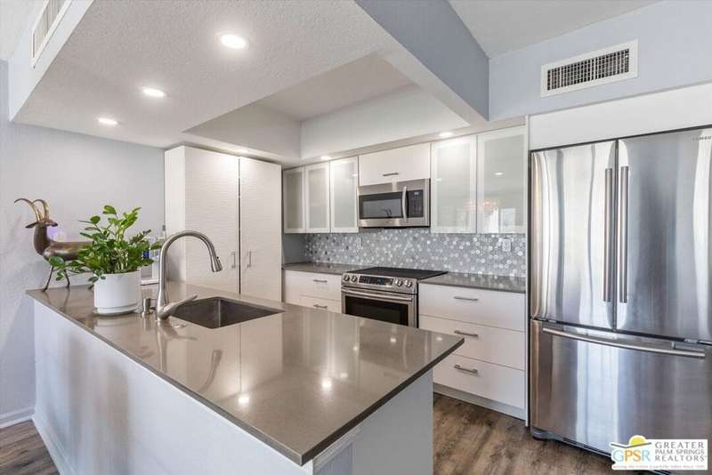 Unobstructed mountain views are only the beginning of the rewards you will enjoy as the owner of this recently remodeled turnkey condo in Palm Springs' sought-after Smoke Tree Racquet Club enclave. Set in a quiet location on the western edge of the resort community, this second-floor residence showcases panoramic vistas of Mount San Jacinto, the iconic Palm Springs Aerial Tramway, and, in the winter, majestic snow-capped peaks. Offered complete with newer furnishings, the open single-level design hosts one bedroom and one bath in approximately 775 square feet, making it perfect for low-maintenance year-round living and a desert vacation getaway. Woodgrain laminate flooring and fashionable paint and lighting are featured throughout, with the living room opening to a private view-enhanced balcony for indoor/outdoor entertaining. The dining room flows directly to a custom chef's kitchen with solid-surface countertops, a full designer-tile backsplash, stainless steel Samsung appliances, a tray ceiling, and newer white cabinetry with translucent glass uppers. Relax stylishly in your primary suite, which offers the rare-for-Smoke Tree advantage of an interior washer and dryer set from LG. Complemented by a beautiful accent wall, the bedroom also features mirrored wardrobe doors, and an ensuite bath with open shelving, custom vanity and an upgraded shower with chic tile surround. A new HVAC system keeps you comfortable during the warm summer days. Reflecting the award-winning talent of famed Palm Springs' architect Hugh Kaptur, Smoke Tree Racquet Club presents a grand central park area with a spa and one of the largest pools in the city. Enjoy lighted tennis and pickleball courts, a dog park and impeccably maintained landscaping. Smoke Tree Village is right across the street and features shops, restaurants, Ace Hardware and Ralphs Fresh Fare Supermarket. Downtown Palm Springs is moments away, miles of hiking trails are nearby, and Palm Springs International Airport makes it easy to enjoy this turnkey condo as a vacation getaway or a full-time residence.