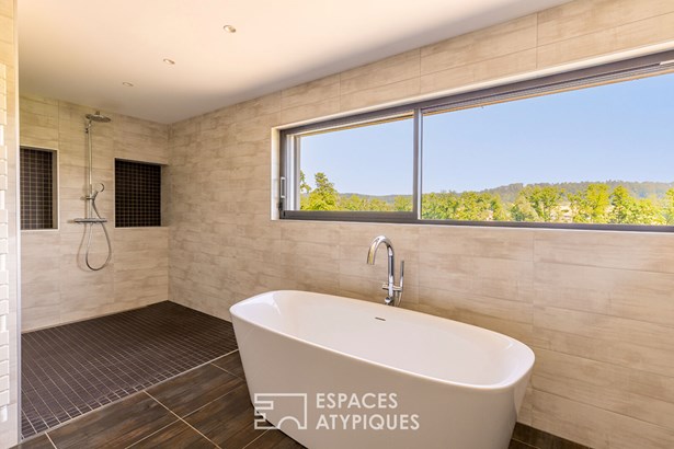 Outside, the 20-metre swimming pool and integrated jacuzzi blend harmoniously with the architecture of the house. The carefully landscaped garden is ideal for relaxation and outdoor living. The electric gate opens onto a large paved courtyard and a garage that can accommodate three vehicles.