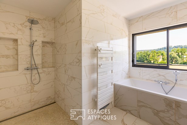 The first floor features a spacious suite with a dressing room and shower room, a bedroom with its own dressing room, a third bedroom and a spacious bathroom with a double shower. A large terrace on this level offers breathtaking views of the surrounding countryside. The top floor is dedicated to a master suite with a dressing room and bathroom. The terrace offers an exceptional view of the surrounding countryside. In addition, the large basement offers a laundry room, cellar, utility room, wine cellar and a large storage area that can be converted as required.