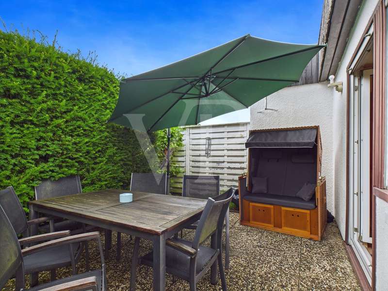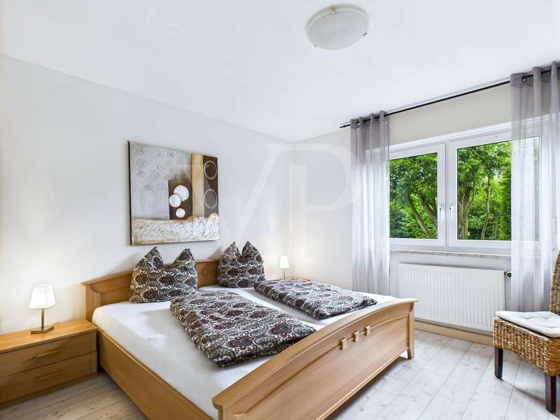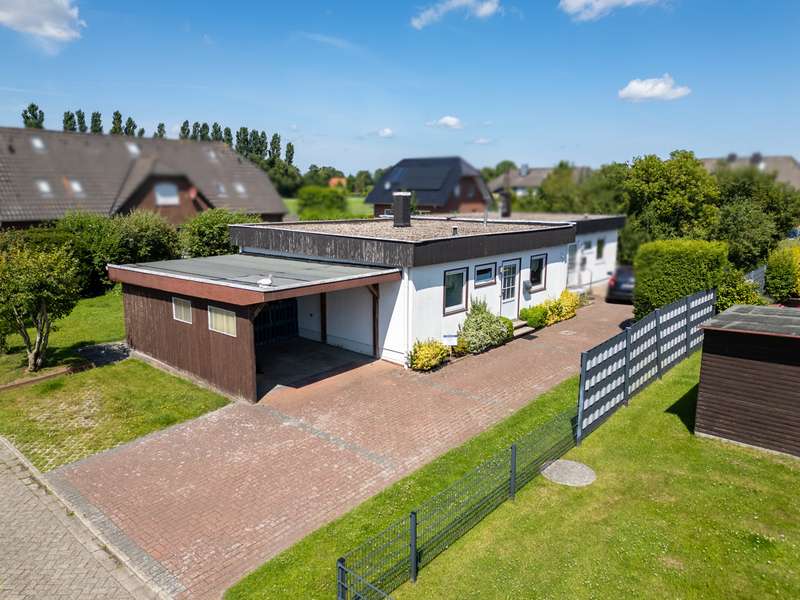 This well-kept semi-detached house from 1978 impresses with its quiet location at the end of a cul-de-sac and its well thought-out room layout on a plot of approx. 367 m². With a living space of around 60 m² spread over three rooms, the house is ideal for couples or small families looking for a cozy home with a garden. The functional floor plan becomes clear as soon as you enter the house. From the central entrance area, you have direct access to all rooms. On the right-hand side is the bright kitchen, equipped with a fitted kitchen and a cozy, small dining area by the window - perfect for relaxing hours in everyday life. A practical storage room offers additional storage space for provisions and household utensils. To the left is the well-kept, brightly tiled bathroom with all the necessary sanitary facilities. The underfloor heating here and the towel radiator ensure efficient heating, providing quick warmth and keeping the room at a pleasant temperature at all times. The two well-designed bedrooms can also be reached via the hallway. They offer enough space for beds, wardrobes or a desk and are ideal as bedrooms, guest rooms or studies. The cozy living room with a view of the garden forms the heart of the house. From here you have direct access to the sunny terrace, an ideal place to relax, barbecue or enjoy a cozy get-together. The living room also has a possible fireplace connection. The house is heated by central heating, which provides cozy warmth in all rooms. The outdoor area delights with a lovingly landscaped garden that offers a variety of uses. A practical shed provides additional storage space, while a carport keeps your vehicle safe and protected from the weather. The property is being sold as shown in the pictures with all furniture and furnishings. A license for commercial vacation rental is not available. The property is a prefabricated house from the 70s. The property has a typical "prefabricated house smell", which is due to chloranisoles. These are not harmful to health, but certain people may find the smell unpleasant. We will of course provide you with further information on this, including an expert opinion, if you are interested.