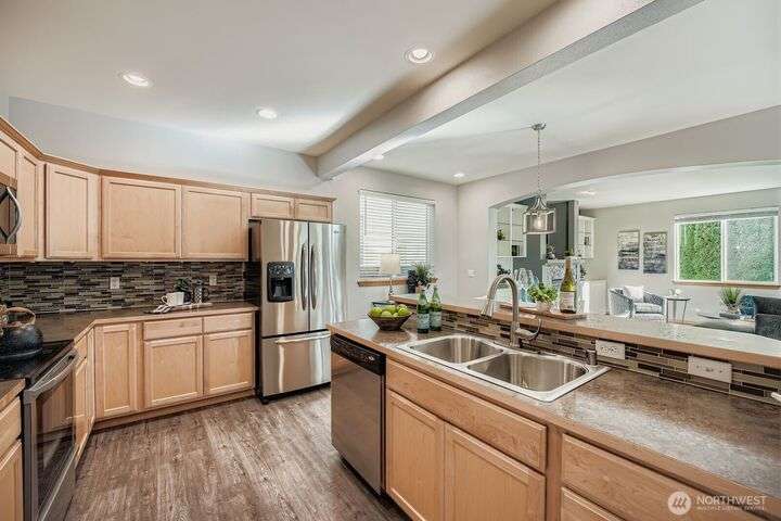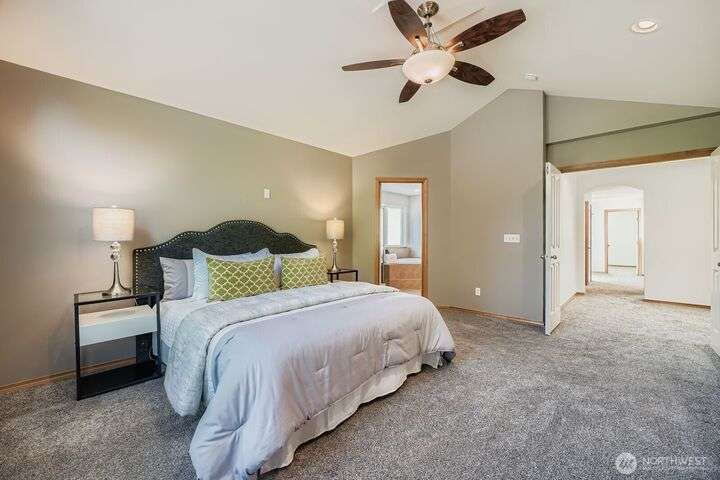 Meticulously maintained four-bedroom two story home on a quiet cul de sac steps away from the community park. Great room living on the spacious main floor. This gathering space includes a large open kitchen with an eating bar to make meal prep a social event and room for a table, a generous sized family room with a gas fireplace for cozy evenings in and a separate space for a full dining table. Primary suite has vaulted ceilings, a private 5-piece bathroom and walk-in closet. Convenient upstairs laundry room. Efficient gas heat and central A/C for year around comfort. Fully fenced backyard with a patio for outdoor entertaining. Close to shopping and convenient for commuting and transit stop nearby. Minutes to Fairwood and Downtown Renton.
