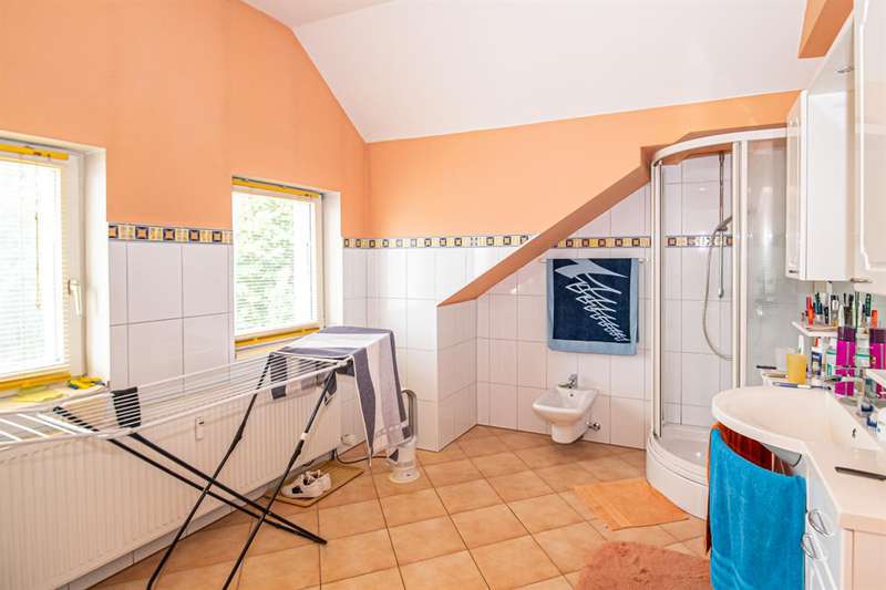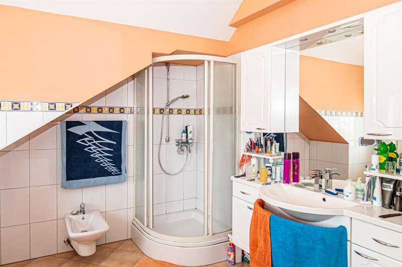 The listed apartment building was built around 1890 on a plot of around 435 m² and was partially converted and extended in 1922, 1976 and 1980. With a living space of approx. 226 m² on the first floor and top floor and a practice area of approx. 142 m² on the first floor, the property offers plenty of space for different living and usage options. The house has a total of 4 units. On the first floor there is a dental practice with 3 treatment rooms, reception, waiting room, laboratory, social room, X-ray room and office. There are two apartments on the upper floor: a 2-room apartment with kitchen/living room, shower room/WC and roof terrace and a 3-room apartment with kitchen/living room, shower room/WC and balcony. The top floor has been converted for living purposes and comprises a shower room with adjoining dressing room, a separate WC, an eat-in kitchen with adjoining room, a spacious living area and a balcony. The property has oil central heating, which is housed in the basement together with the oil tanks. The apartment building impresses with its historic construction and the charming dwarf gable on the long side of the building. The partial basement with rail vaults and the wooden beams with white ceiling on the first floor and upper floor give the house a special character. The property also has a double garage with space for two vehicles. The quality of the fixtures and fittings can be classified as normal, whereby the listed architecture and historical elements are particularly noteworthy. Thanks to the well-kept maintenance and the modernized heating system, the property is in good condition and offers a wide range of possible uses for buyers who appreciate something special.