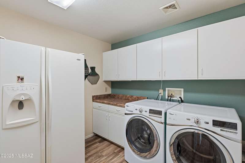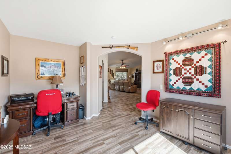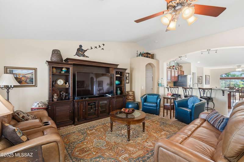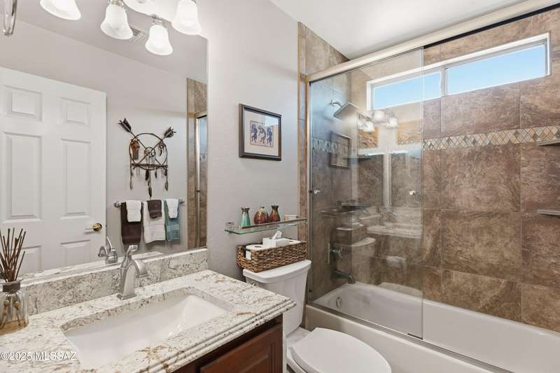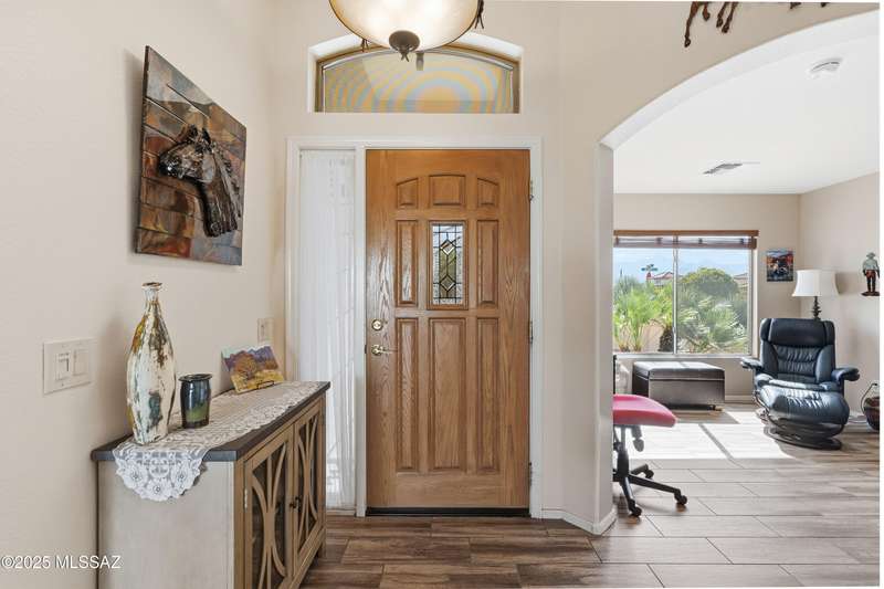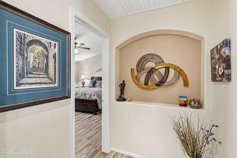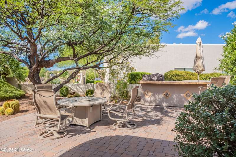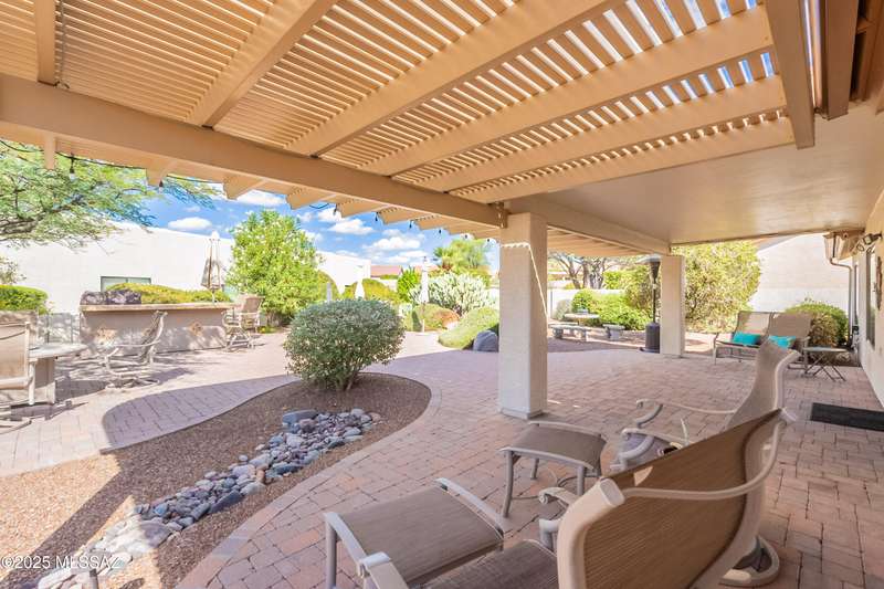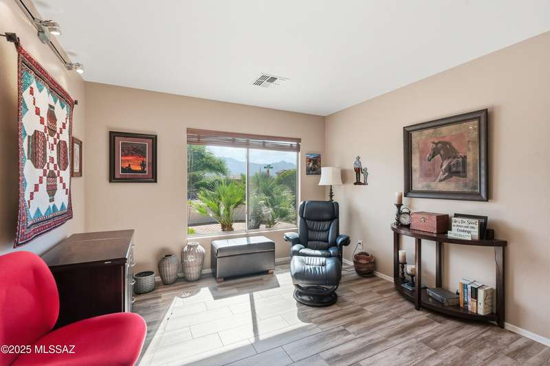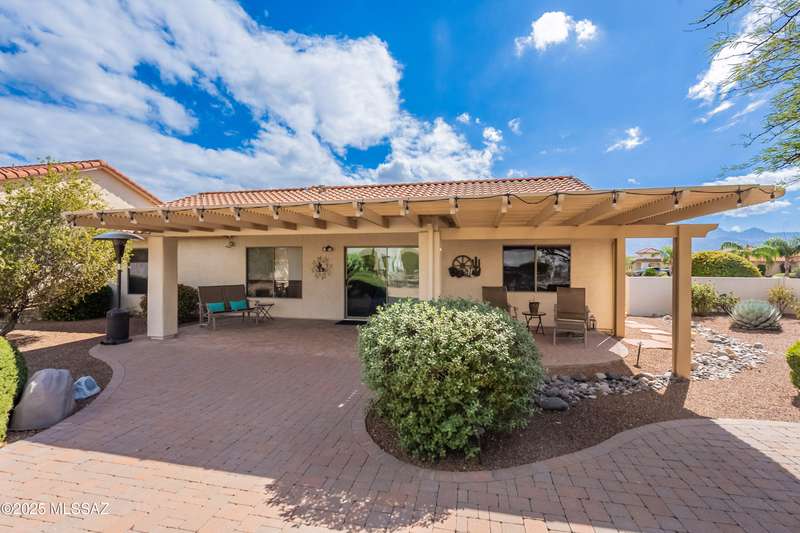 Welcome to this beautifully updated & maintained Laredo model, perfectly sited on a premium corner lot with lovely mountain views. Kitchen showcases cherry finish cabs, gorgeous granite counter tops, convenient island, 5 burner gas range, SS appls, large pantry, countertop seating & bright adjacent breakfast nook. Primary suite offers a large, completely remodeled master bath with oversized walk-in closet. Versatile den provides space for an office or reading retreat. Attractively updated guest bath. Handsome wood look plank flooring throughout, plus high-end window treatments. Back yard is perfect for entertaining with gas firepit, concrete cactus water feature, patio pavers & misting system. New water heater 2024, drip sys 2025, extended garage w/sink & storage cabs, welcoming courtyard!