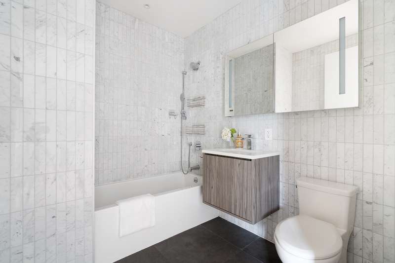 There is a 2nd full-sized bathroom with soaking tub graced with carrera tiles and modern fixtures.