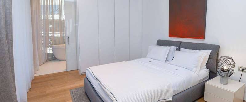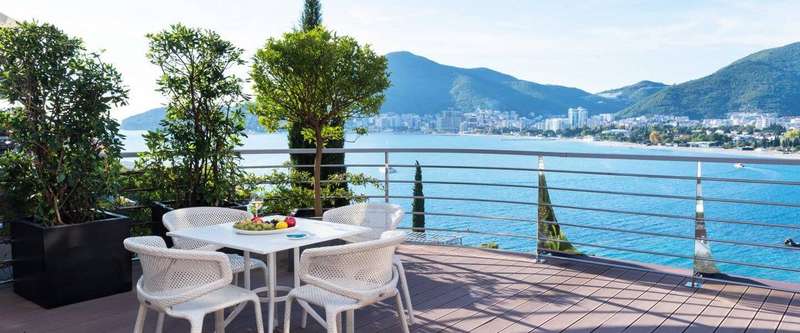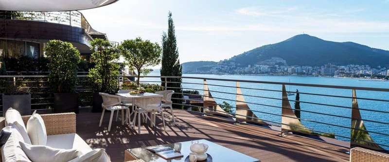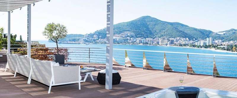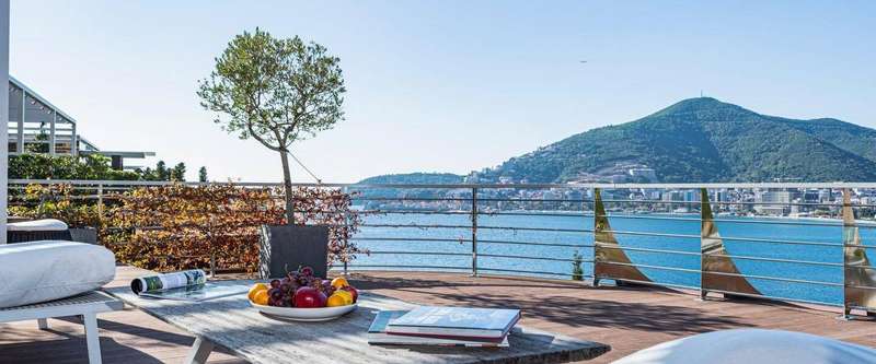 This 255m2 (+202m2 rooftop terrace) apartment consists of two levels: on the first floor is an open-plan living room with a terrace that has a magnificent sea view, equipped with sunbeds and an open dining area, a kitchen with a dining room, three bedrooms, two bathrooms, a guest toilet, and laundry room. All bedrooms have access to terraces. The apartment is fully furnished and ready to move in. It is equipped with modern top-designed furniture, Poliform built-in kitchen, Miele appliances, Villeroy & Boch, Dornbracht kitchen and bath fixtures, and superior finishes. On the second level of the apartment is a rooftop sweeping sea-view terrace, with a jacuzzi, shower, lounge, and dining area. From both terraces, you will have a beautiful sea view of the Budva Old town.