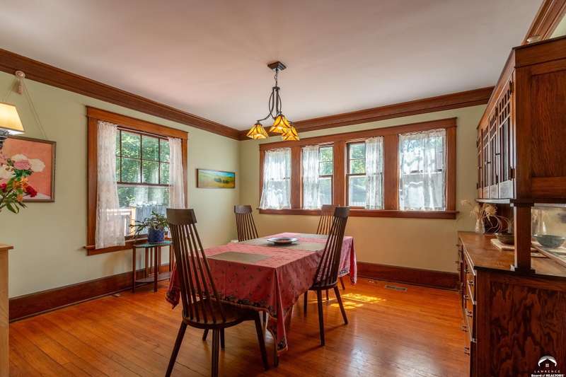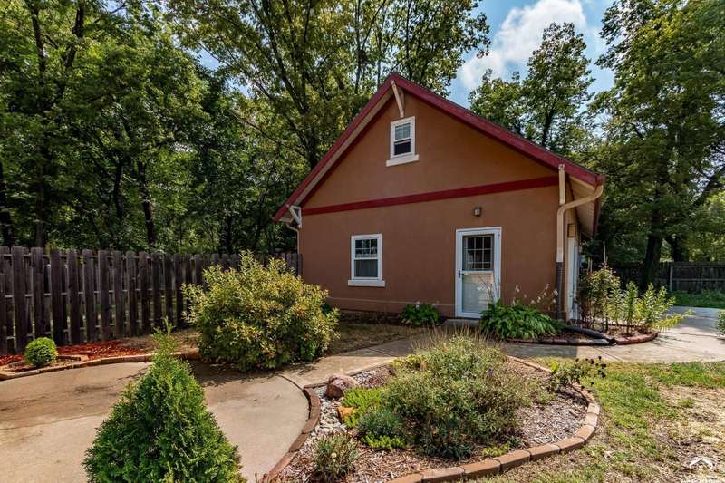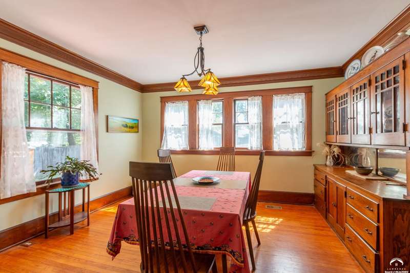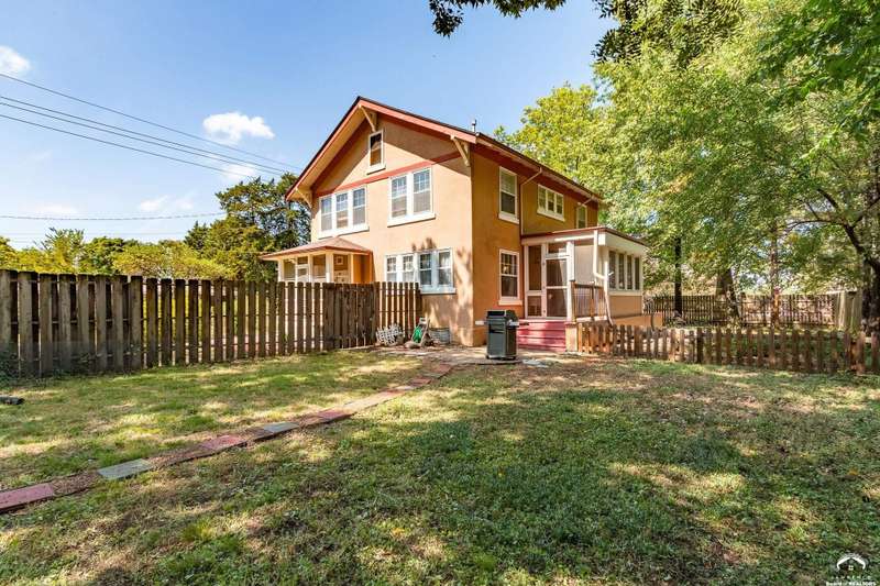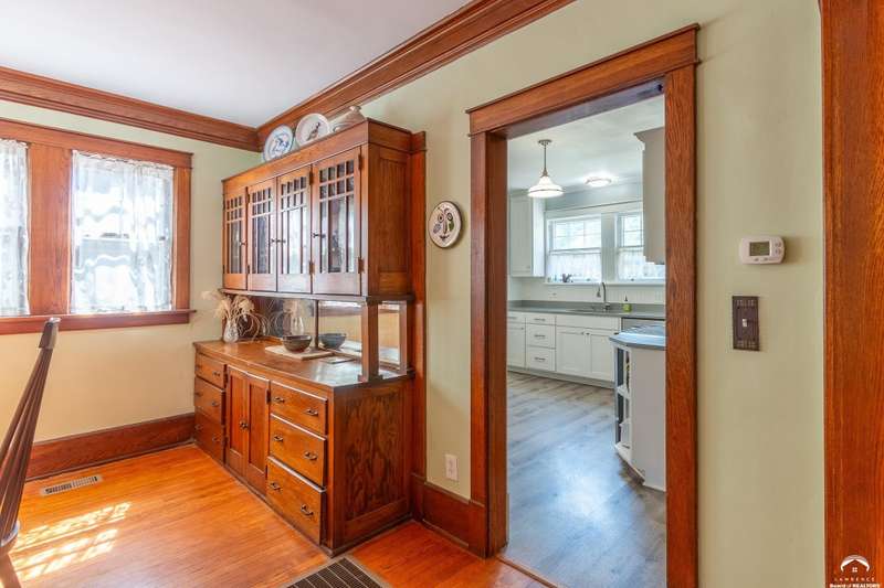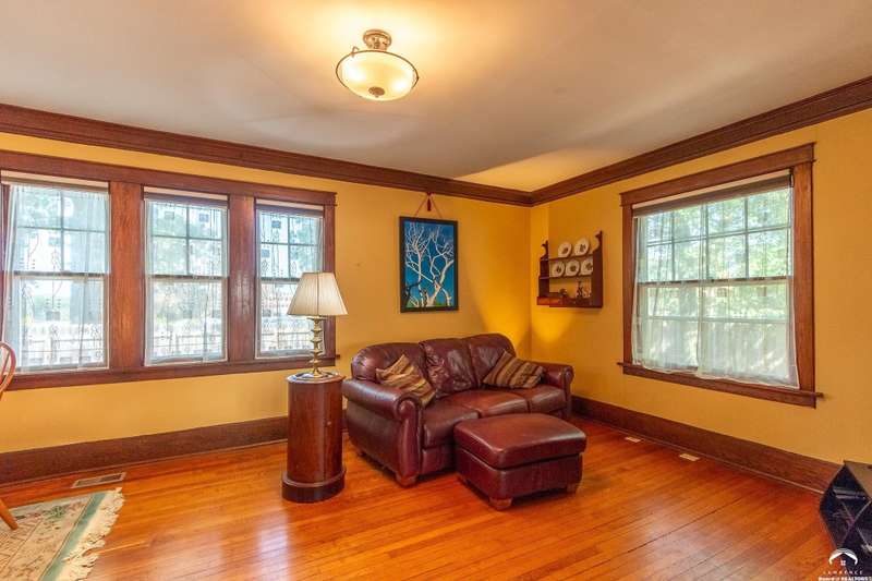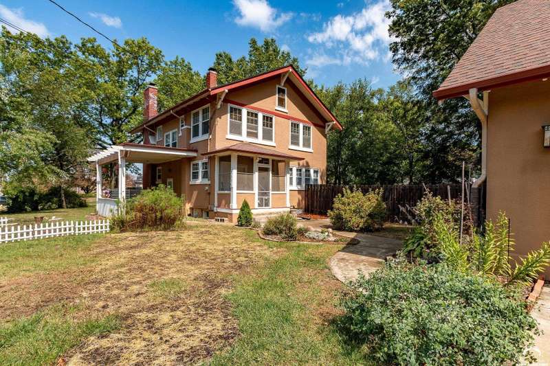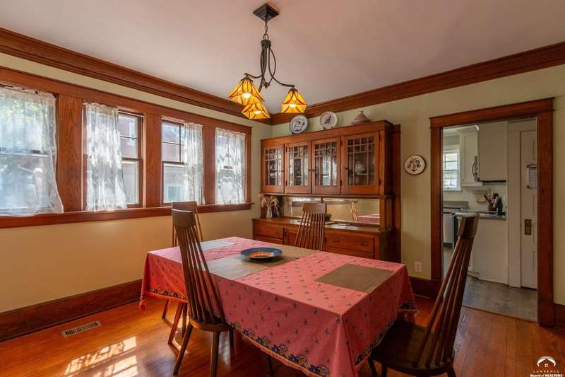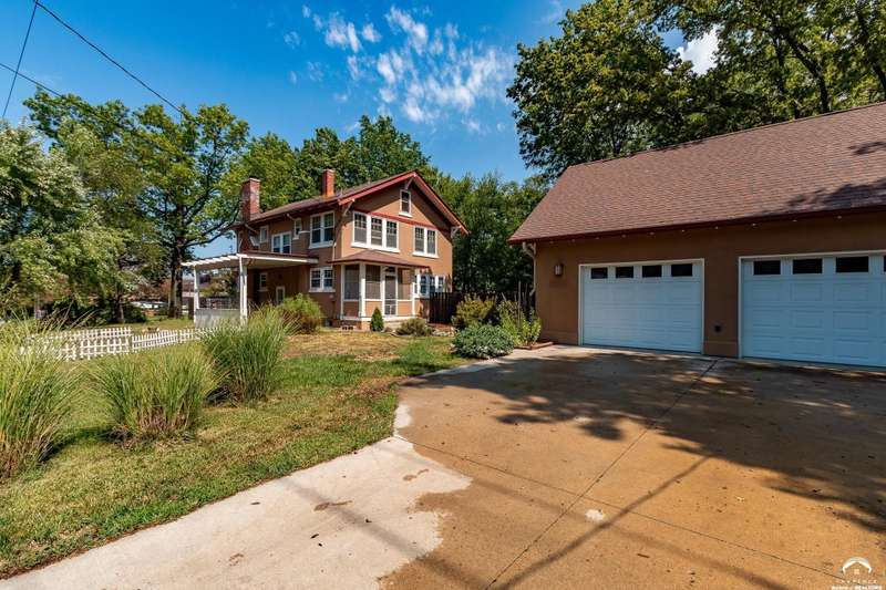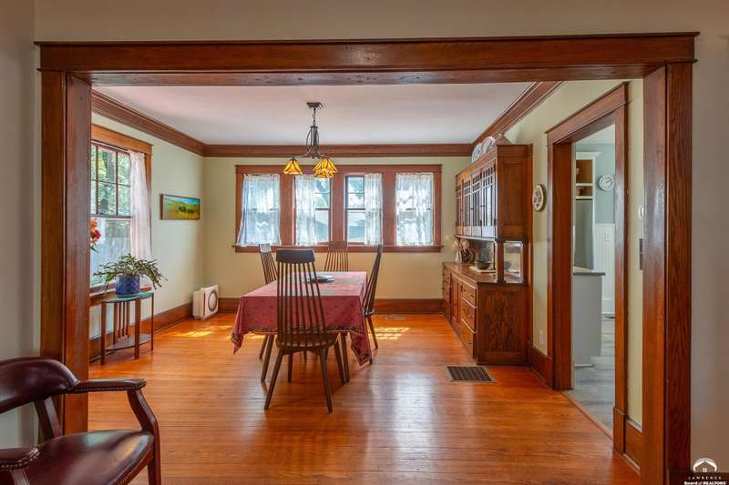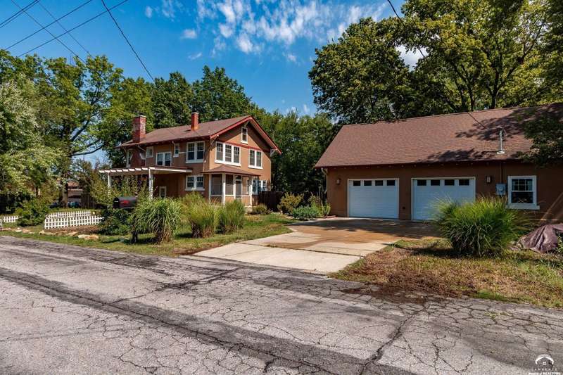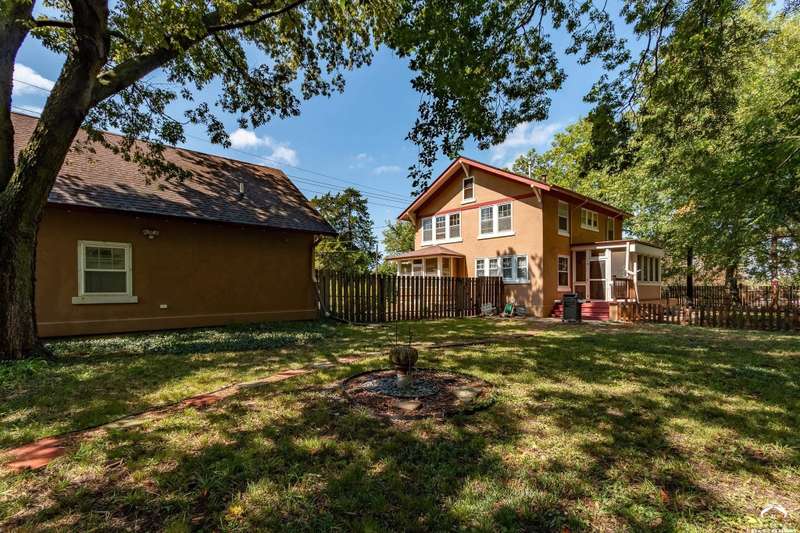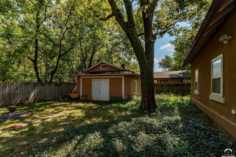 Charming and timeless, this enchanting 1915 home sits on a large corner double lot just outside of Old West Lawrence. Rich with original character and period details, you'll find historic millwork, crown molding, built-ins, hardwood flooring, glass doorknobs, and a stunning glass pocket door — all showcasing the craftsmanship of the era. The updated kitchen complements the home's heritage while preserving its cozy, welcoming feel and all appliances are new in the last 6 years. A flourishing wildflower/pollinator garden in the front yard delineated by the white picket fence. The fenced backyard features an inviting screened porch, a small deck, and a patio area next to a shaded garden. Hardscaping and low-maintenance native landscaping create a serene courtyard-style connection between the home and the newer 24x36 two-car garage plus studio —complete with radiant heated floors, a half bath, separate electric, and expansive attic storage. The full unfinished basement and original garage now in the backyard offer a wealth of storage—or take the stairs to the attic and let your imagination run wild with possibilities. This home invites you to appreciate its history while envisioning your future. Schedule your showing today!!