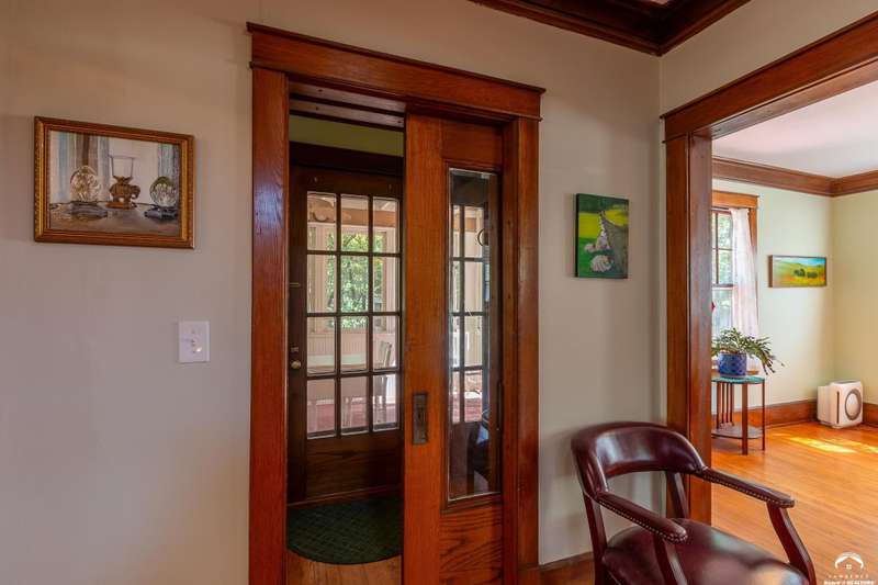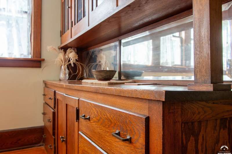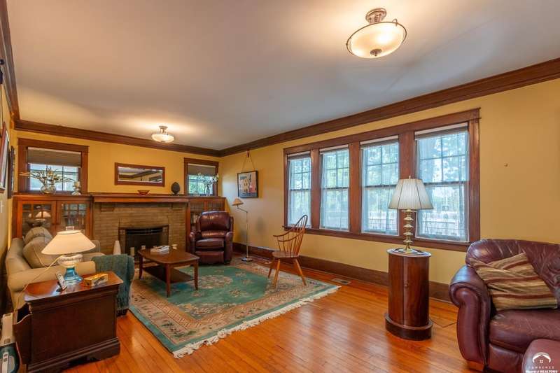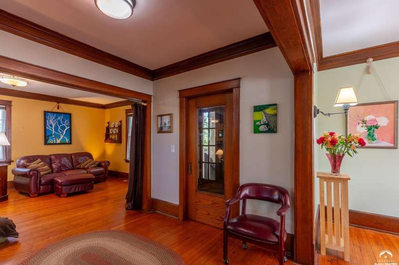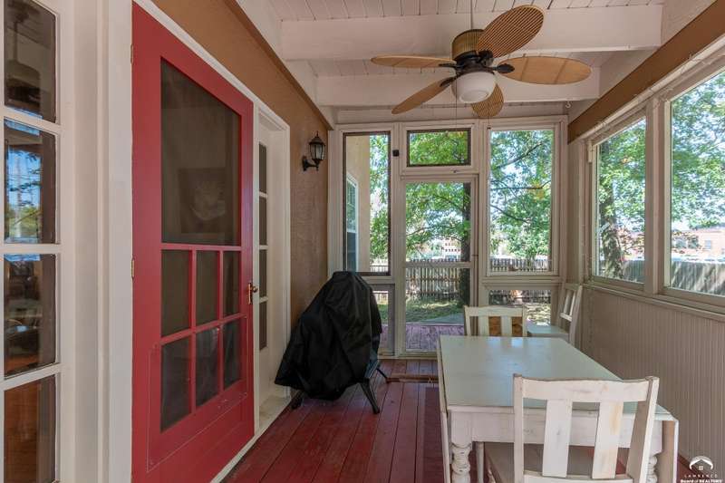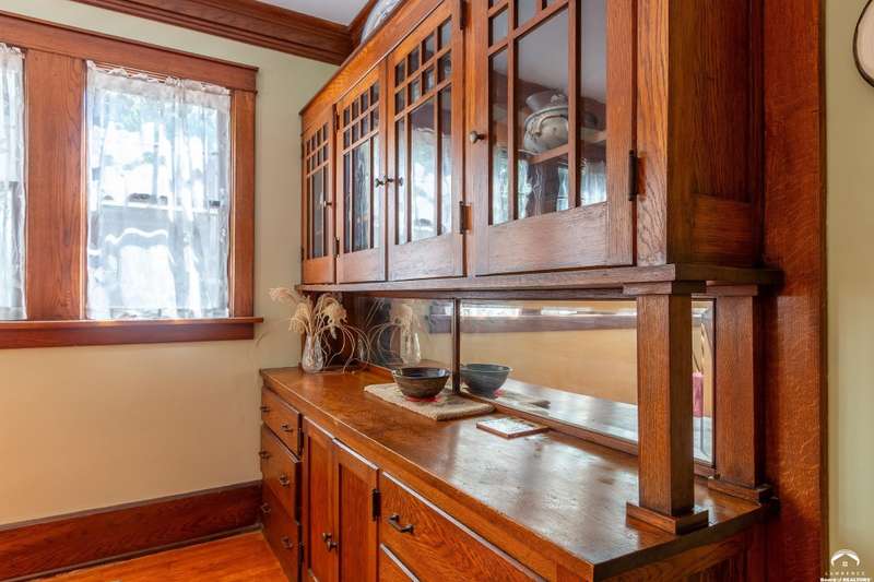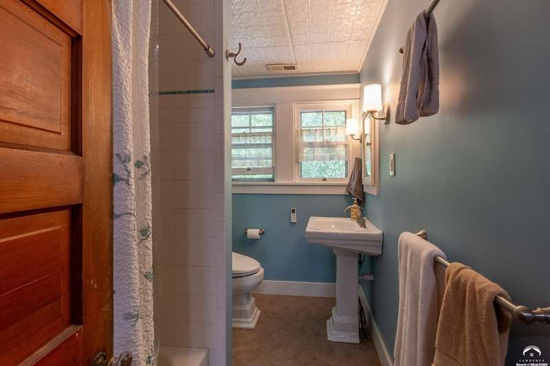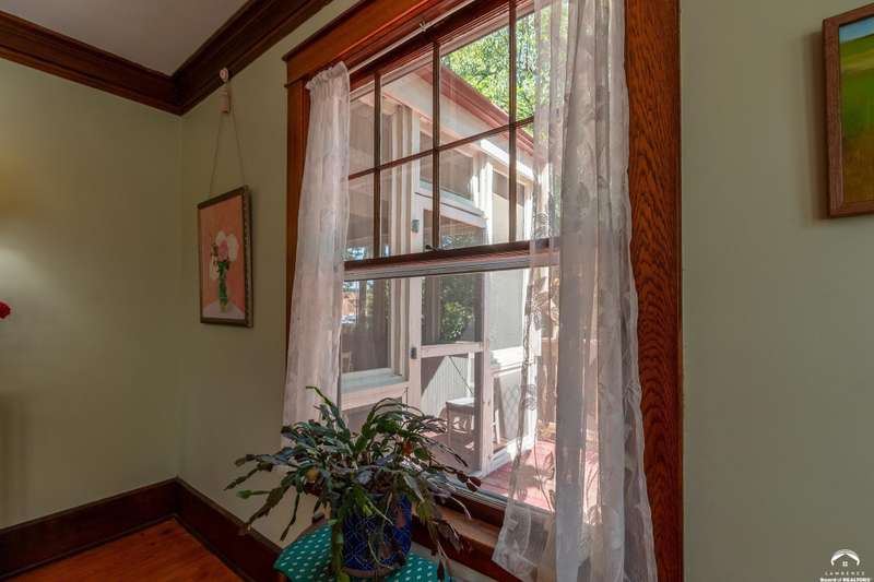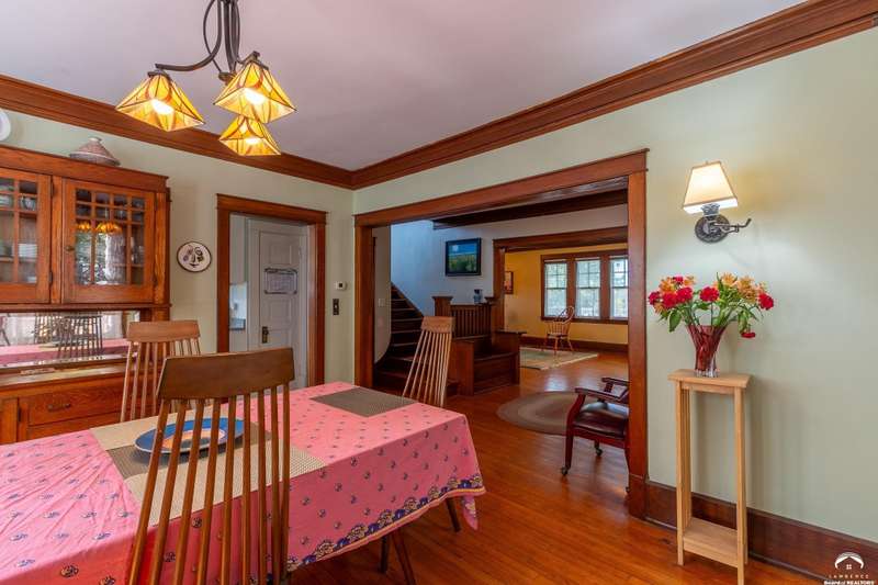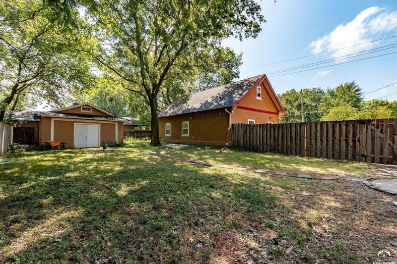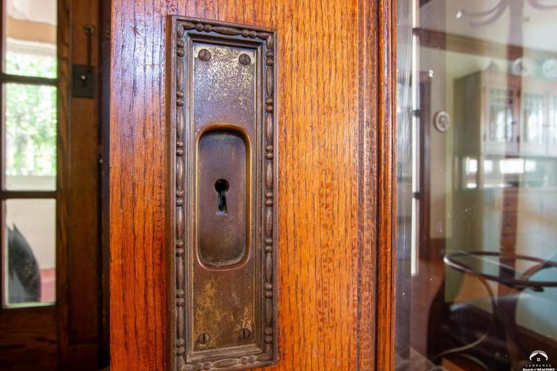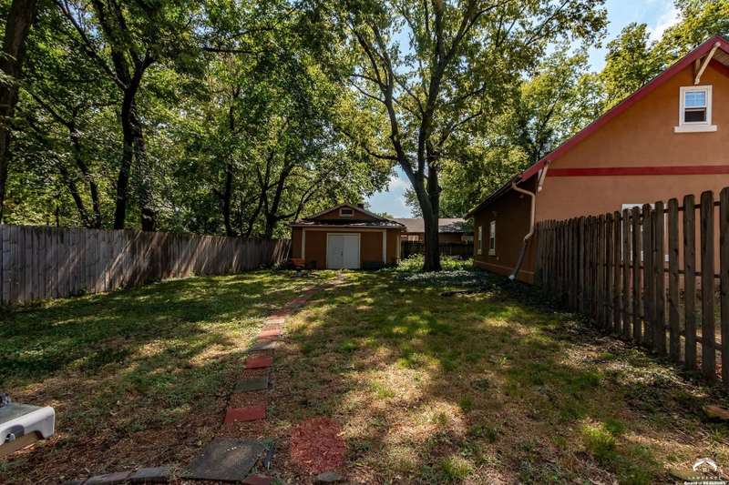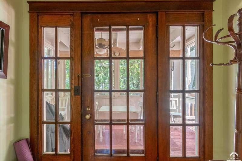 Charming and timeless, this enchanting 1915 home sits on a large corner double lot just outside of Old West Lawrence. Rich with original character and period details, you'll find historic millwork, crown molding, built-ins, hardwood flooring, glass doorknobs, and a stunning glass pocket door — all showcasing the craftsmanship of the era. The updated kitchen complements the home's heritage while preserving its cozy, welcoming feel and all appliances are new in the last 6 years. A flourishing wildflower/pollinator garden in the front yard delineated by the white picket fence. The fenced backyard features an inviting screened porch, a small deck, and a patio area next to a shaded garden. Hardscaping and low-maintenance native landscaping create a serene courtyard-style connection between the home and the newer 24x36 two-car garage plus studio —complete with radiant heated floors, a half bath, separate electric, and expansive attic storage. The full unfinished basement and original garage now in the backyard offer a wealth of storage—or take the stairs to the attic and let your imagination run wild with possibilities. This home invites you to appreciate its history while envisioning your future. Schedule your showing today!!