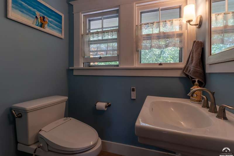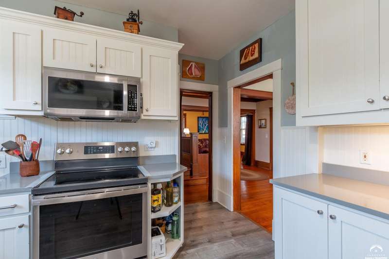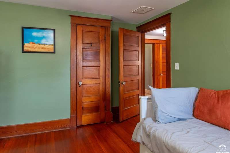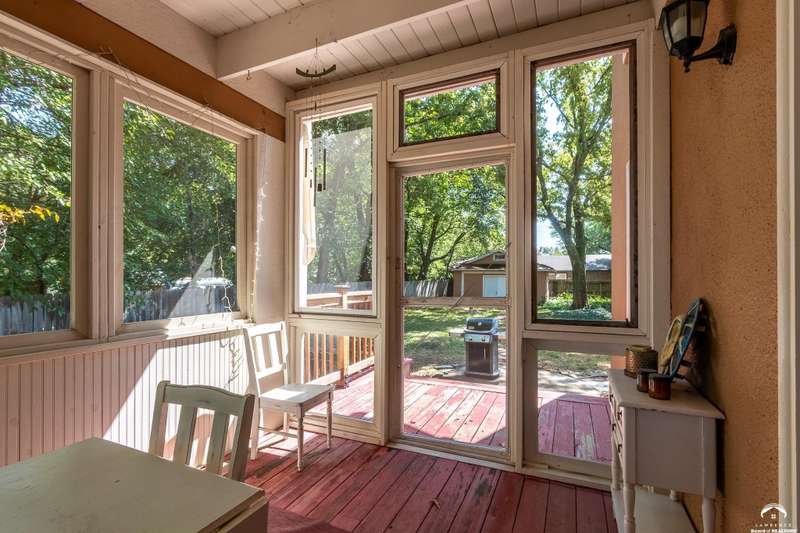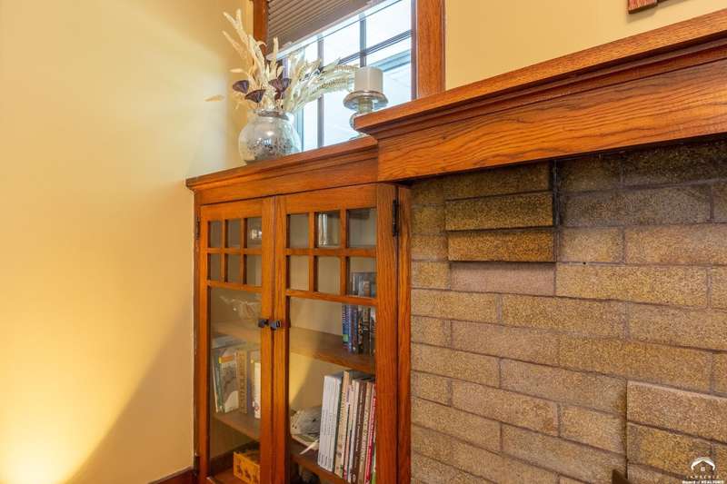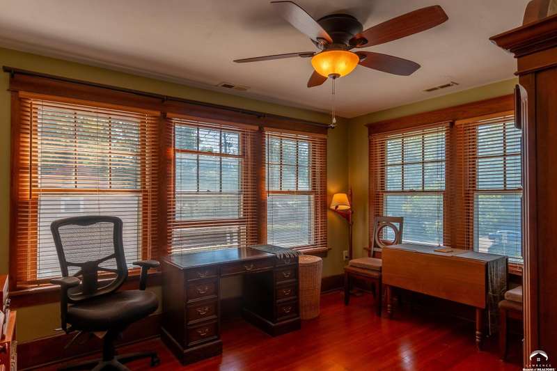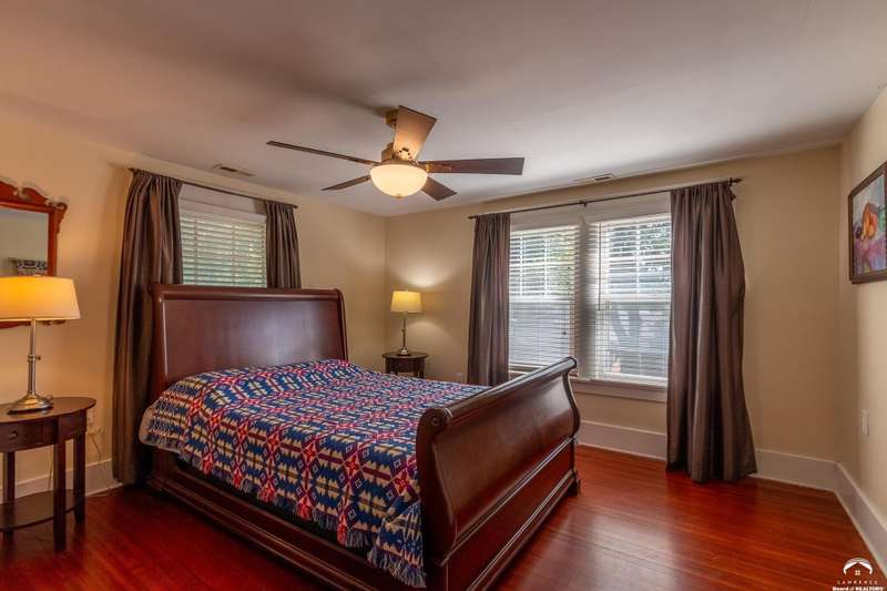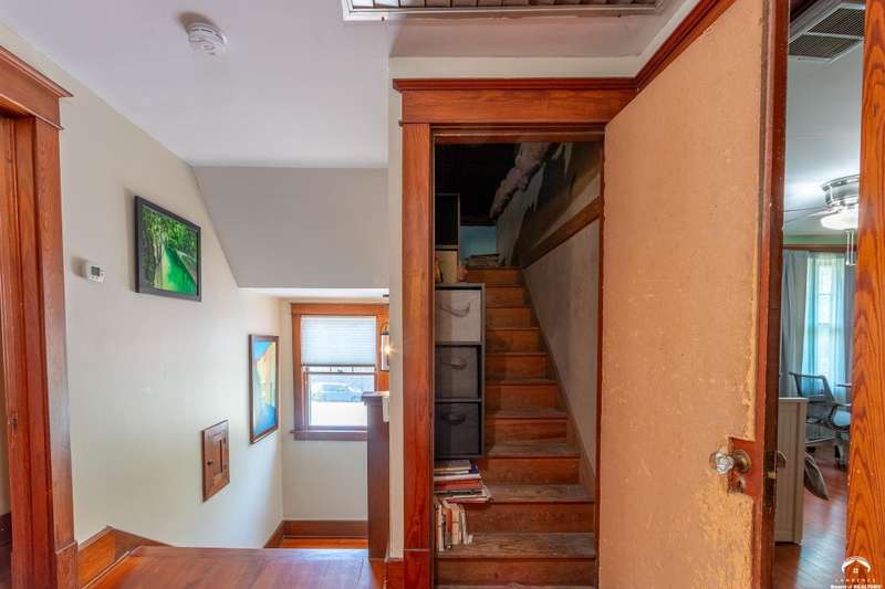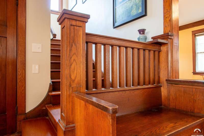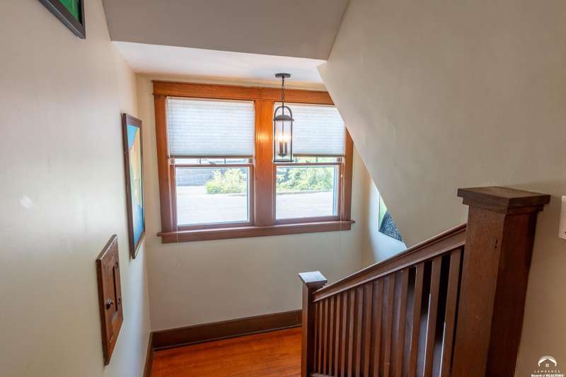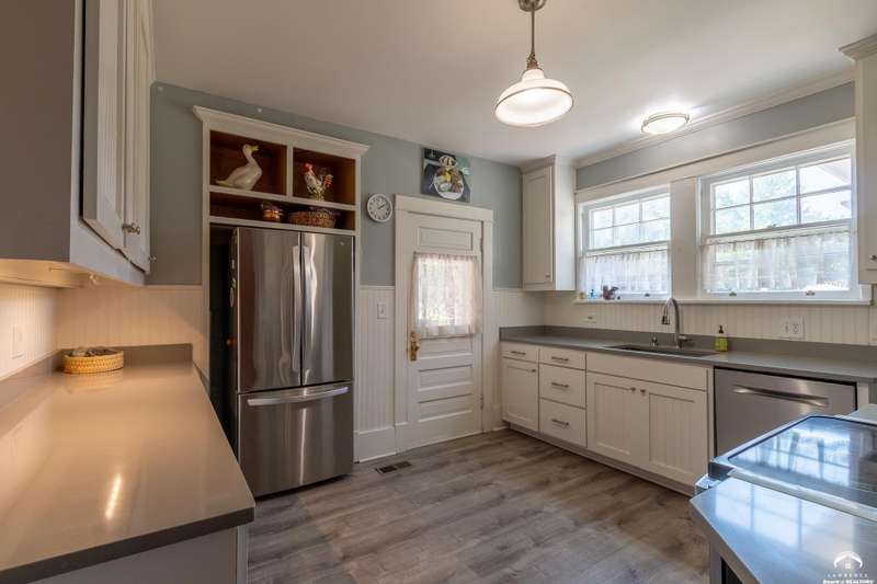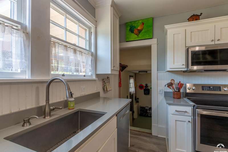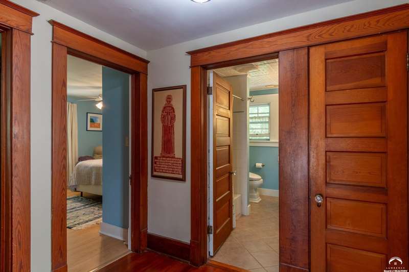 Charming and timeless, this enchanting 1915 home sits on a large corner double lot just outside of Old West Lawrence. Rich with original character and period details, you'll find historic millwork, crown molding, built-ins, hardwood flooring, glass doorknobs, and a stunning glass pocket door — all showcasing the craftsmanship of the era. The updated kitchen complements the home's heritage while preserving its cozy, welcoming feel and all appliances are new in the last 6 years. A flourishing wildflower/pollinator garden in the front yard delineated by the white picket fence. The fenced backyard features an inviting screened porch, a small deck, and a patio area next to a shaded garden. Hardscaping and low-maintenance native landscaping create a serene courtyard-style connection between the home and the newer 24x36 two-car garage plus studio —complete with radiant heated floors, a half bath, separate electric, and expansive attic storage. The full unfinished basement and original garage now in the backyard offer a wealth of storage—or take the stairs to the attic and let your imagination run wild with possibilities. This home invites you to appreciate its history while envisioning your future. Schedule your showing today!!