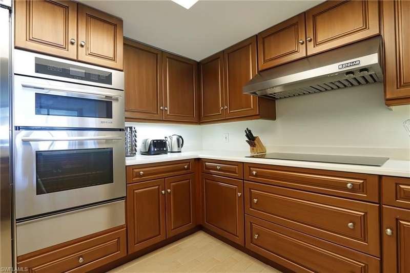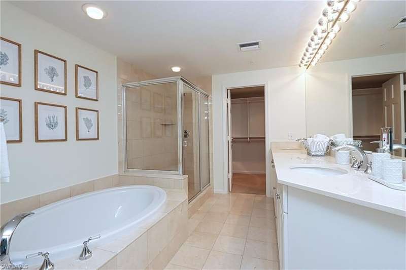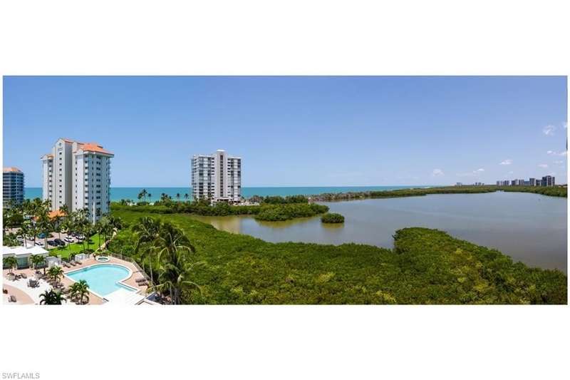 Gorgeous views from this 3 BDRM/3 BATH 7th floor condo with nine foot ceilings in Baypointe at Naples Cay. Two large Lanai’s offering spectacular views of the Gulf and Clam Bay from the west lanai, and views of Venetian Bay and the city from the east lanai. Enjoy watching the birds and wildlife below on your expanded terrace, overlooking beautiful clam Bay and the Gulf of Mexico. This spacious (2,173 under air, 2,403 total square feet) condo is plush and comfortable. The master suites a king bed, TV and large On-suite. The two guest bedrooms offer a queen and daybed. The condo is ideal for entertaining with a table for 6 and plenty of dining area on the terrace. Enjoy the famous Florida sunsets in this luxury high rise after a day of relaxing by the pool, walking along the beach, or playing tennis. Other amenities include a spa, billiards room, executive conference room, guest suites, and a well-equipped and modern fitness room.