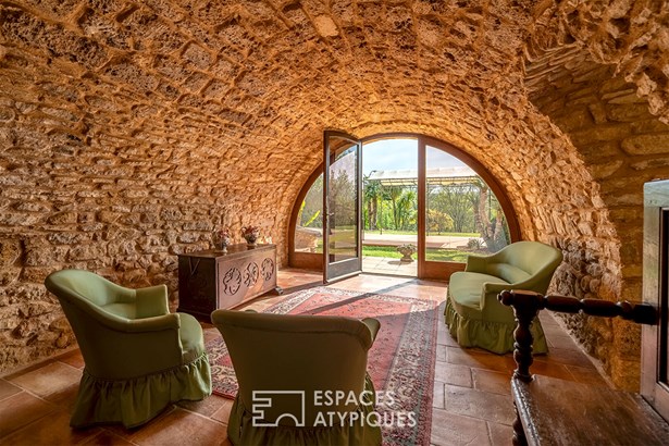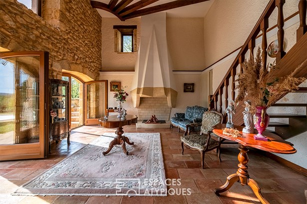 On the lower floor (garden level), a second living space with a fireplace, stone vaults, and double access to the garden makes an ideal reception or relaxation area.