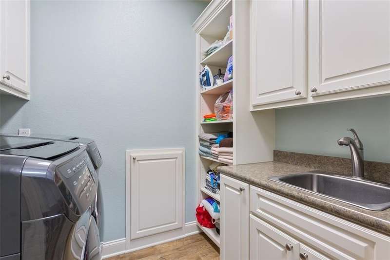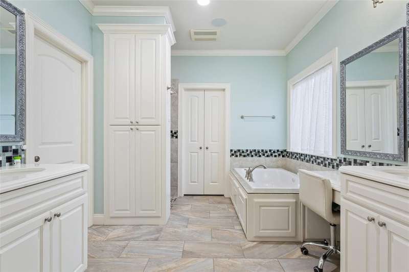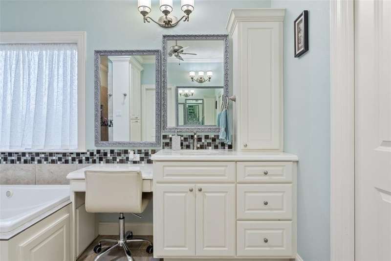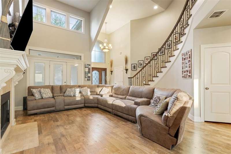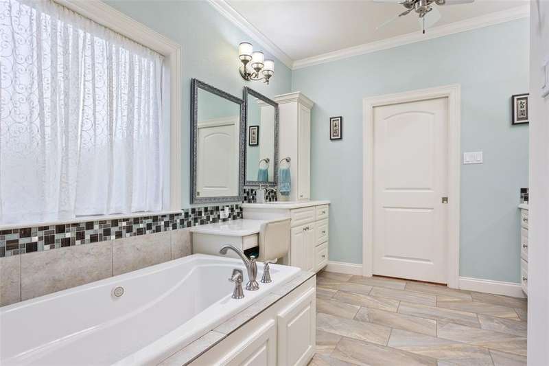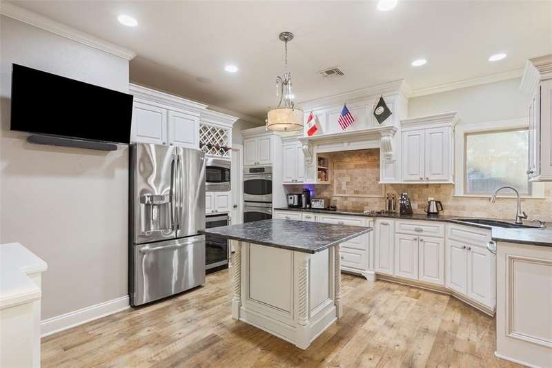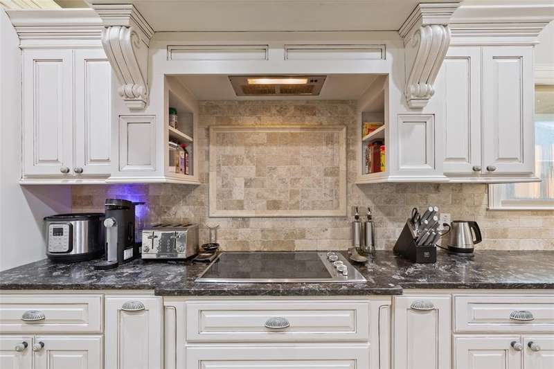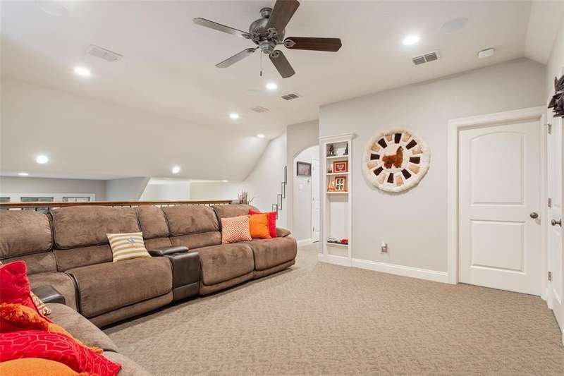 Experience exceptional craftsmanship and timeless design in this Ken Cooper Custom Home nestled in the highly sought-after Chapel Ridge community. This immaculate 4-bedroom, 2.5-bath residence with a 3-car garage is completely move-in ready and showcases fine quality finishes throughout. Step inside to an inviting open-concept living area featuring raised ceilings, elegant built-in cabinetry, and a beautiful wood-burning fireplace. The family room flows seamlessly into the gourmet kitchen, complete with double ovens, an eat-in island, granite countertops, stainless steel appliances, a walk-in pantry, and thoughtful over- and under-cabinet lighting. The formal dining room includes a built-in china cabinet and plantation shutters, while detailed trim work and crown molding enhance every room. The primary suite is a true retreat with a tiered ceiling, luxurious bath featuring a walk-in shower, jetted tub, and a spacious closet with built-in drawers. Additional main-level highlights include a dedicated desk study nook, a laundry room with sink and built-ins, and a well-designed mudroom offering abundant storage. Upstairs, a large game or media room with surround sound awaits, along with three generously sized bedrooms. The home also offers a foam-insulated walk-in attic, ideal for climate-controlled storage. Outdoors, enjoy a covered back patio, fully fenced backyard, sprinkler system, and a detached single-car garage perfect for hobbies or additional storage.