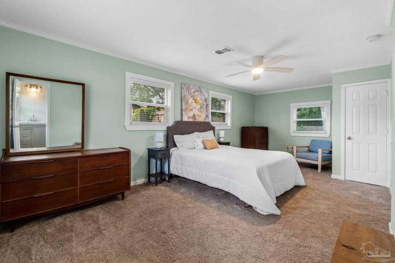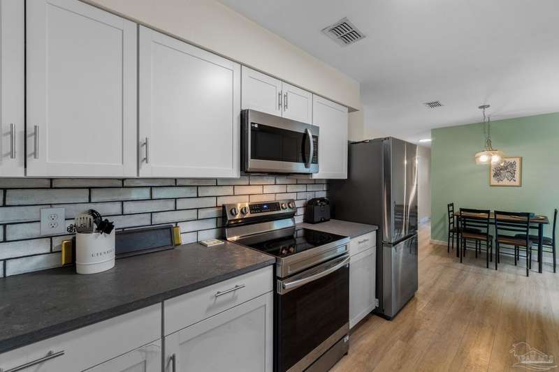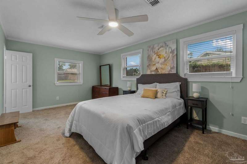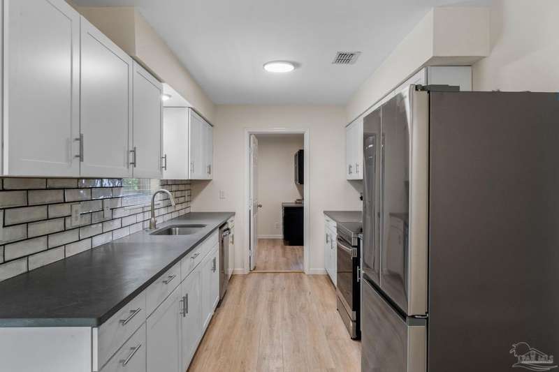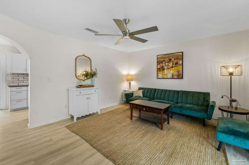 Welcome to this beautifully remodeled 3-bedroom, 2-bathroom home, designed for modern comfort and style. Step into a light and bright foyer that sets the tone for the inviting interior. Arch doorways add a touch of elegance, leading to spacious living areas. The galley kitchen boasts new cabinets paired with sleek, modern quartz countertops, and new stainless appliances, perfect for culinary enthusiasts. Enjoy the convenience of an indoor laundry room and the energy efficiency of newer windows throughout. New sliding doors open to a large backyard, ideal for outdoor entertainment or relaxation. The primary bedroom features an en suite bathroom, offering a private retreat. This home combines contemporary upgrades with timeless charm, ready for you to make it your own.