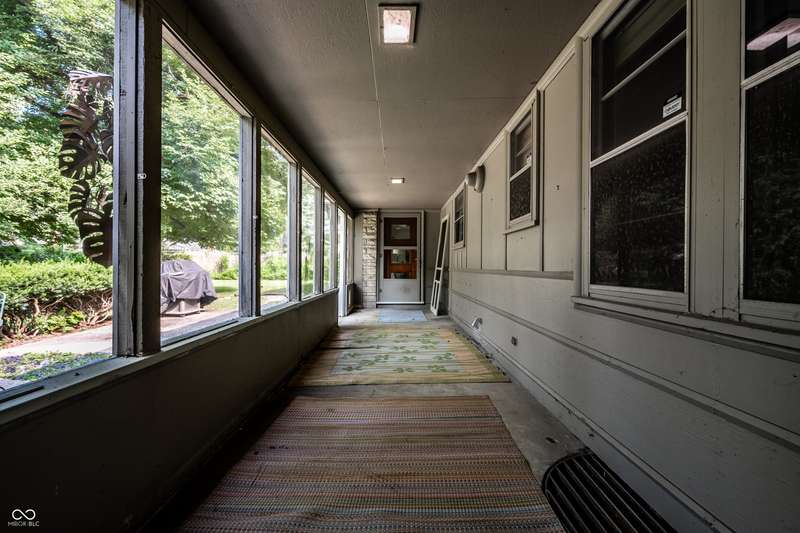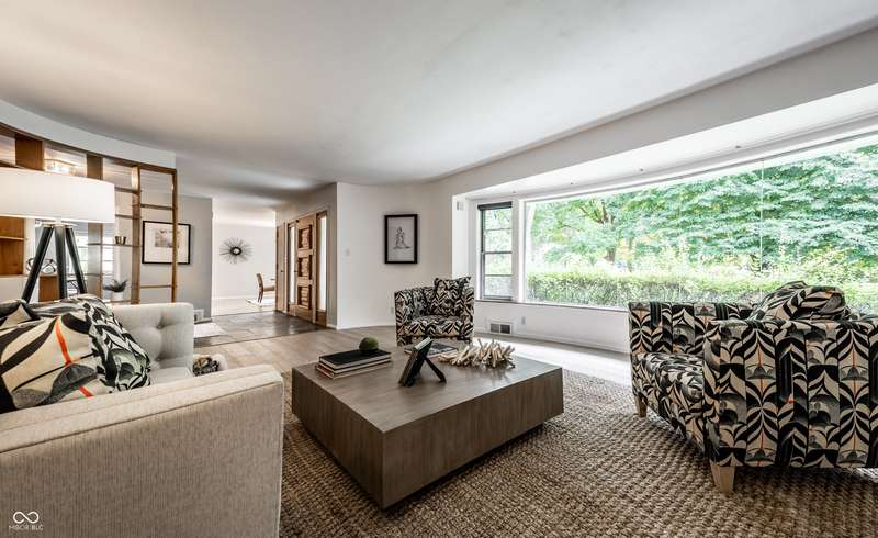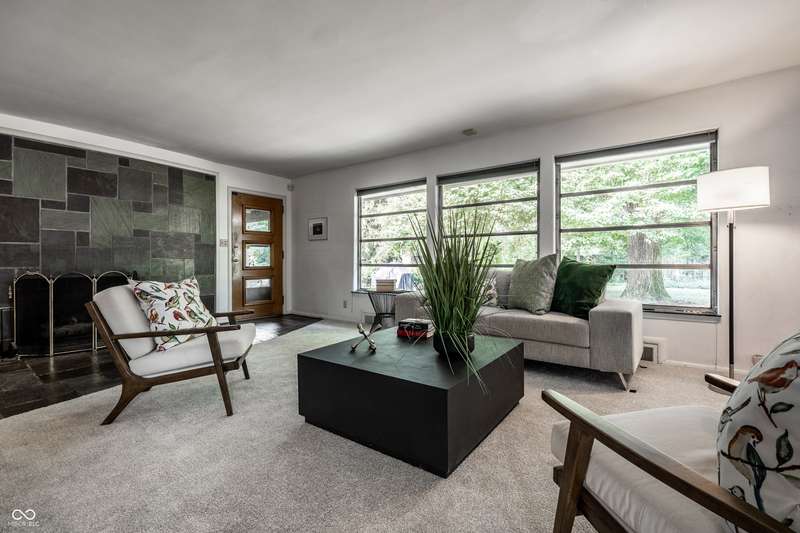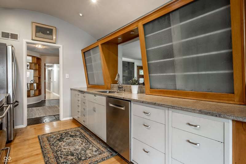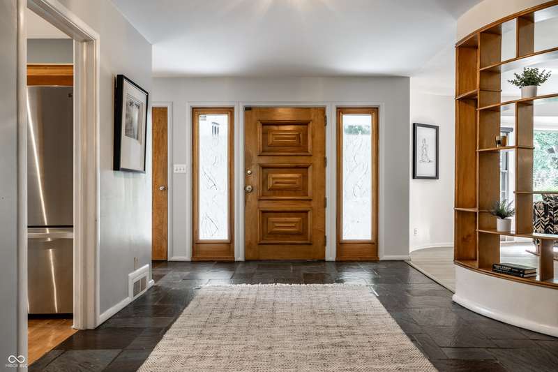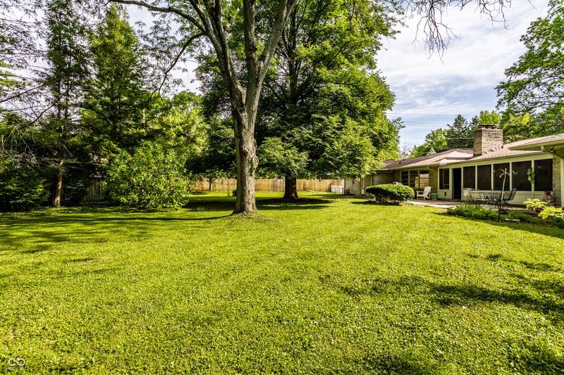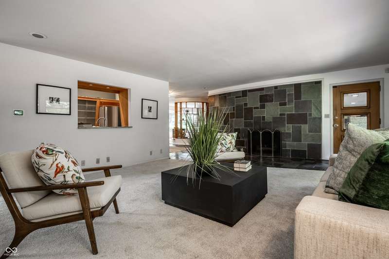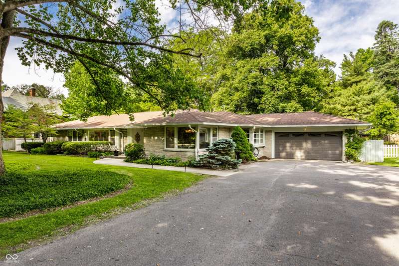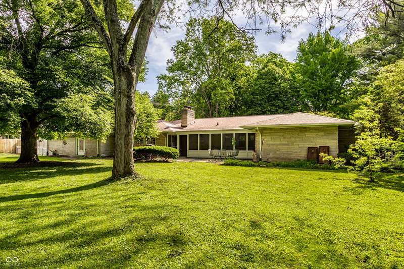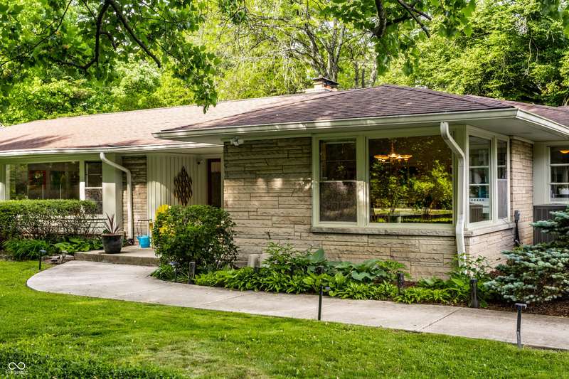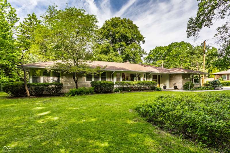 Mid-century modern masterpiece, unique design, fine craftmanship, open floor plan and quality construction featuring curved windows and walls, solid oak doors, marble window sills and slate entrance foyer, hallway and gas fireplace. Updated kitchen with stainless steel appliances, arched ceiling, hardwood maple floors and granite countertops - yet mid-century elements have been maintained with original sliding glass doors and Jamestown steel cabinets. Bathroom plumbing has been updated, but again the stylistic integrity of the house has been maintained with ceramic tile and solid wooden cabinets. Large spacious bedrooms with an abundance of windows and light. Full 3500 square foot basement, with a finished study and playroom. House lies on close to an acre, immediately across from Indianapolis jewel, Holliday Park, currently undergoing a $6,000,000 renovation to what will soon be a state-of-the-art playground. Centrally located, only 20 minutes from downtown, this house seeks buyers who appreciate fine craftmanship, excellence in home-building, architectural integrity and materials and style that are rarely found in contemporary homes: Indiana limestone, slate, solid oak and steel.