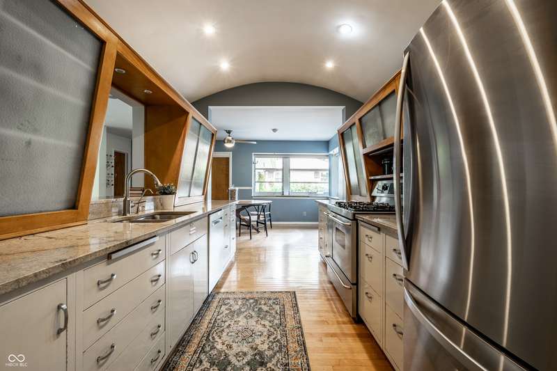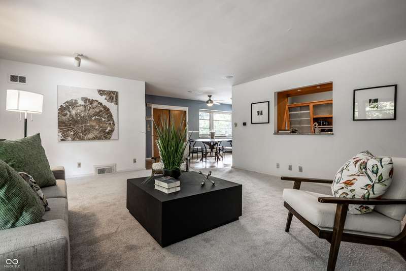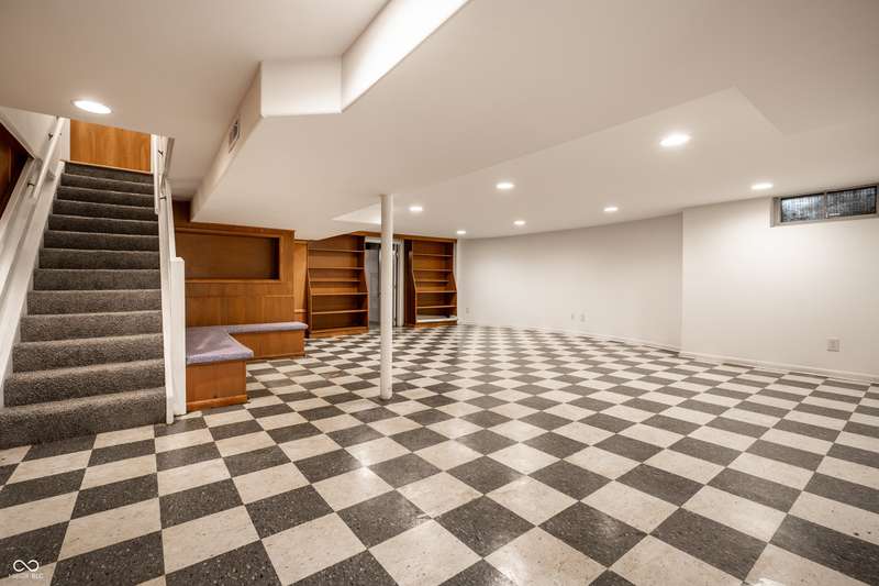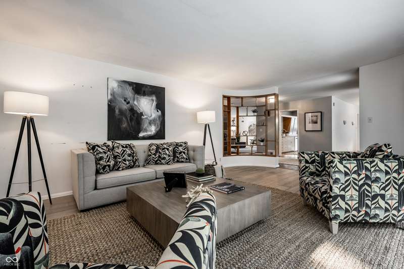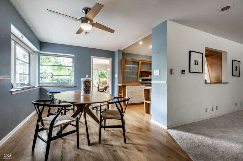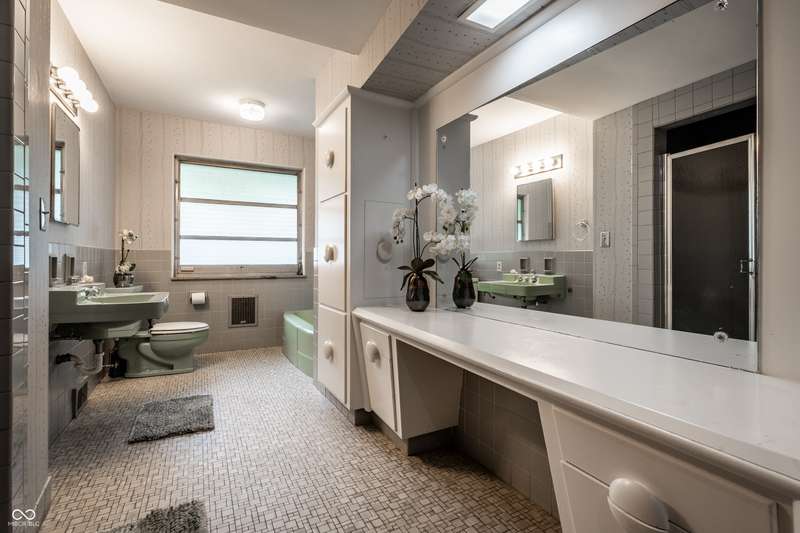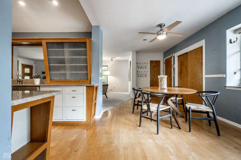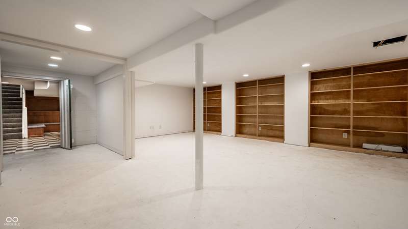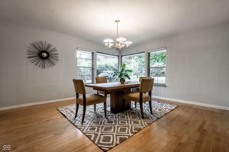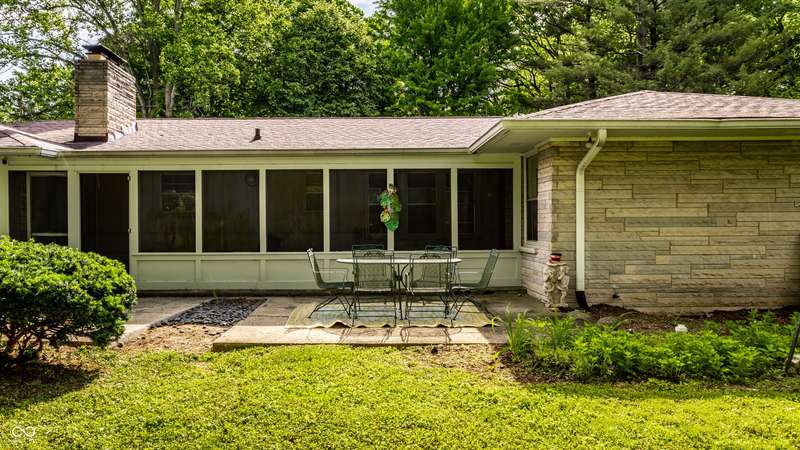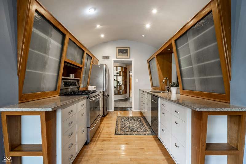 Mid-century modern masterpiece, unique design, fine craftmanship, open floor plan and quality construction featuring curved windows and walls, solid oak doors, marble window sills and slate entrance foyer, hallway and gas fireplace. Updated kitchen with stainless steel appliances, arched ceiling, hardwood maple floors and granite countertops - yet mid-century elements have been maintained with original sliding glass doors and Jamestown steel cabinets. Bathroom plumbing has been updated, but again the stylistic integrity of the house has been maintained with ceramic tile and solid wooden cabinets. Large spacious bedrooms with an abundance of windows and light. Full 3500 square foot basement, with a finished study and playroom. House lies on close to an acre, immediately across from Indianapolis jewel, Holliday Park, currently undergoing a $6,000,000 renovation to what will soon be a state-of-the-art playground. Centrally located, only 20 minutes from downtown, this house seeks buyers who appreciate fine craftmanship, excellence in home-building, architectural integrity and materials and style that are rarely found in contemporary homes: Indiana limestone, slate, solid oak and steel.