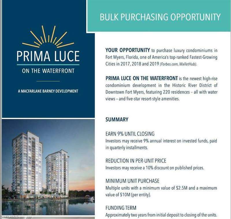 This new construction waterfront condo features a stunning view of the Caloosahatchee River Estuary with two floor to ceiling walls of glass in your living area. Luxury fixtures, finishings and appliances come standard, with additional upgrades and full customization available. Prima Luce's resort-inspired amenities include a zero-entry heated swimming pool, whirlpool, yoga studio and fitness center, library and business center, and a community social space complete with catering kitchen. Each residence includes one lobby-level storage locker and one parking space in the secured private parking garage. Additional parking spaces are available for purchase. Pet-friendly Prima Luce on the Waterfront is located on the shores of the Caloosahatchee in the Historic River District of Downtown Fort Myers, Florida, and is only a short walk, drive or bike-ride from fine dining and shopping, a vibrant arts and entertainment scene, numerous local festivals and events, boating and nature activities, and so much more! The SAN LUCIDO floor plan is located on floors 2, 3 & 4 of of the West Tower, and floors 2-21 in the East Tower. Please call for current availability & pricing.